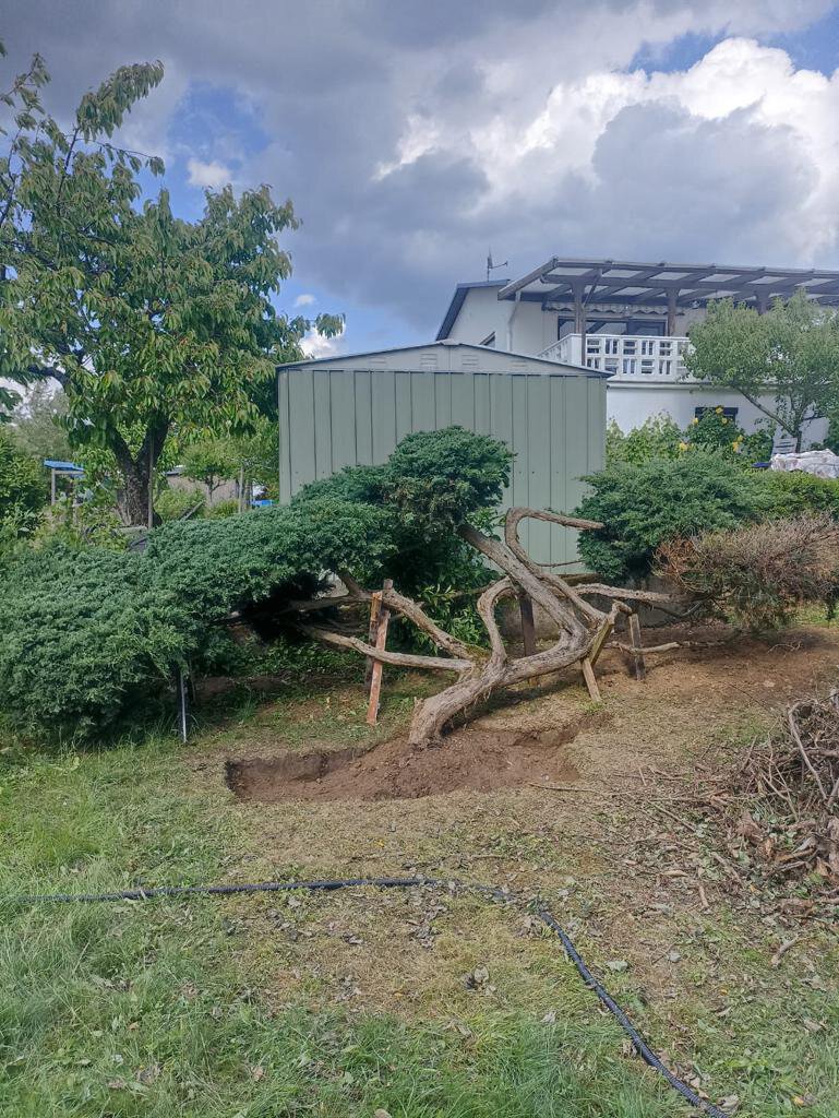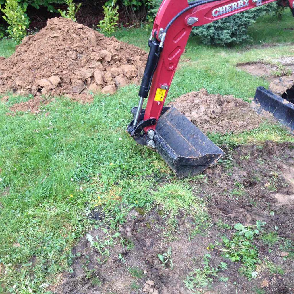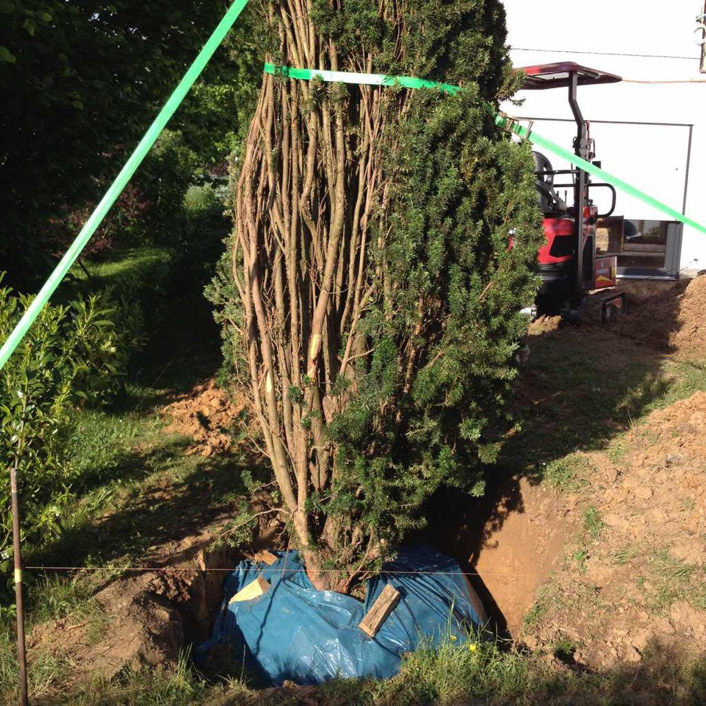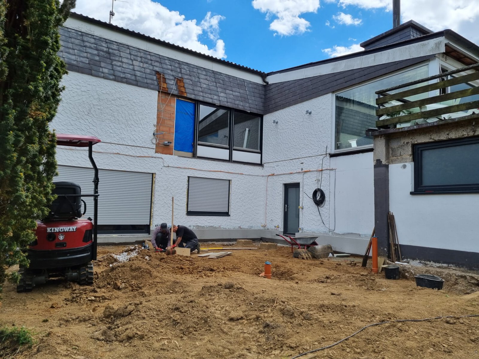 - Versetzen der Bäume, Beginn der Erdarbeiten für das Anlegen der unterschiedlichen Höhenniveaus im Außenbereich