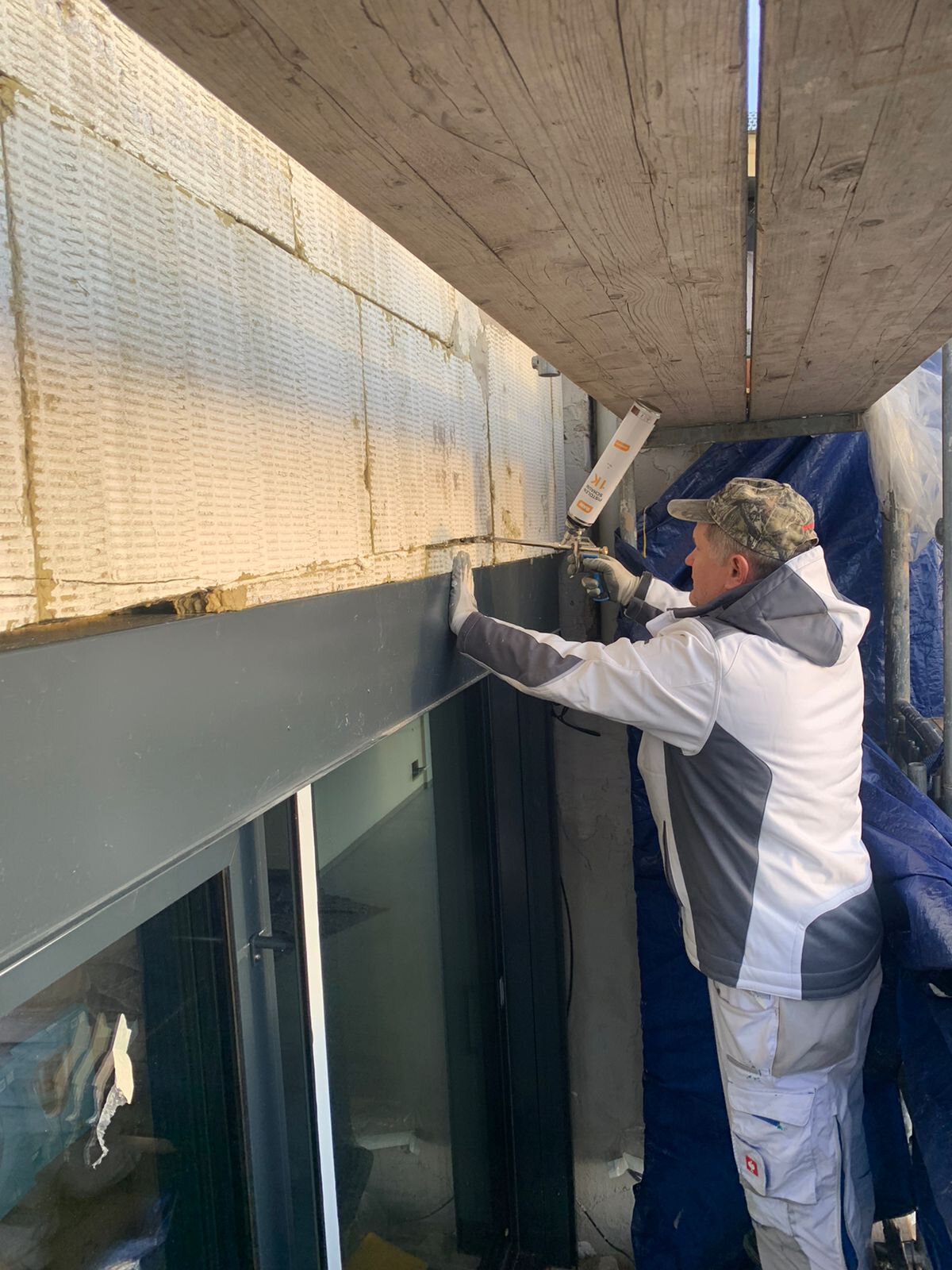 - Einspachteln der Eckverstärkungen des Wärmedämm-Verbundsystems mit vorgeknickten Eckbewehrungen aus Gewebe