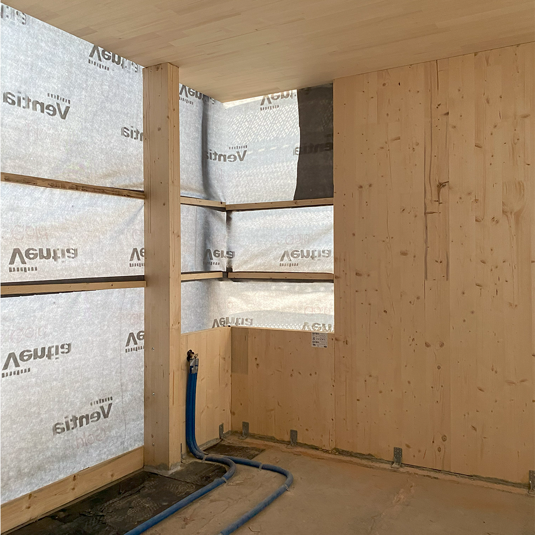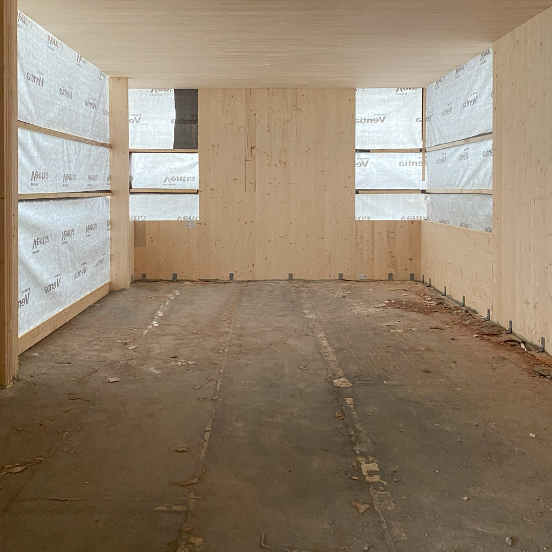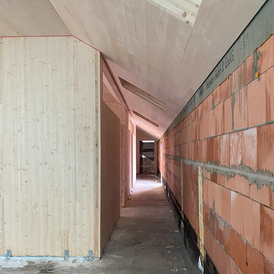 - Stellung des Rohbaus in CLT-Massivbauweise (Holzbau)