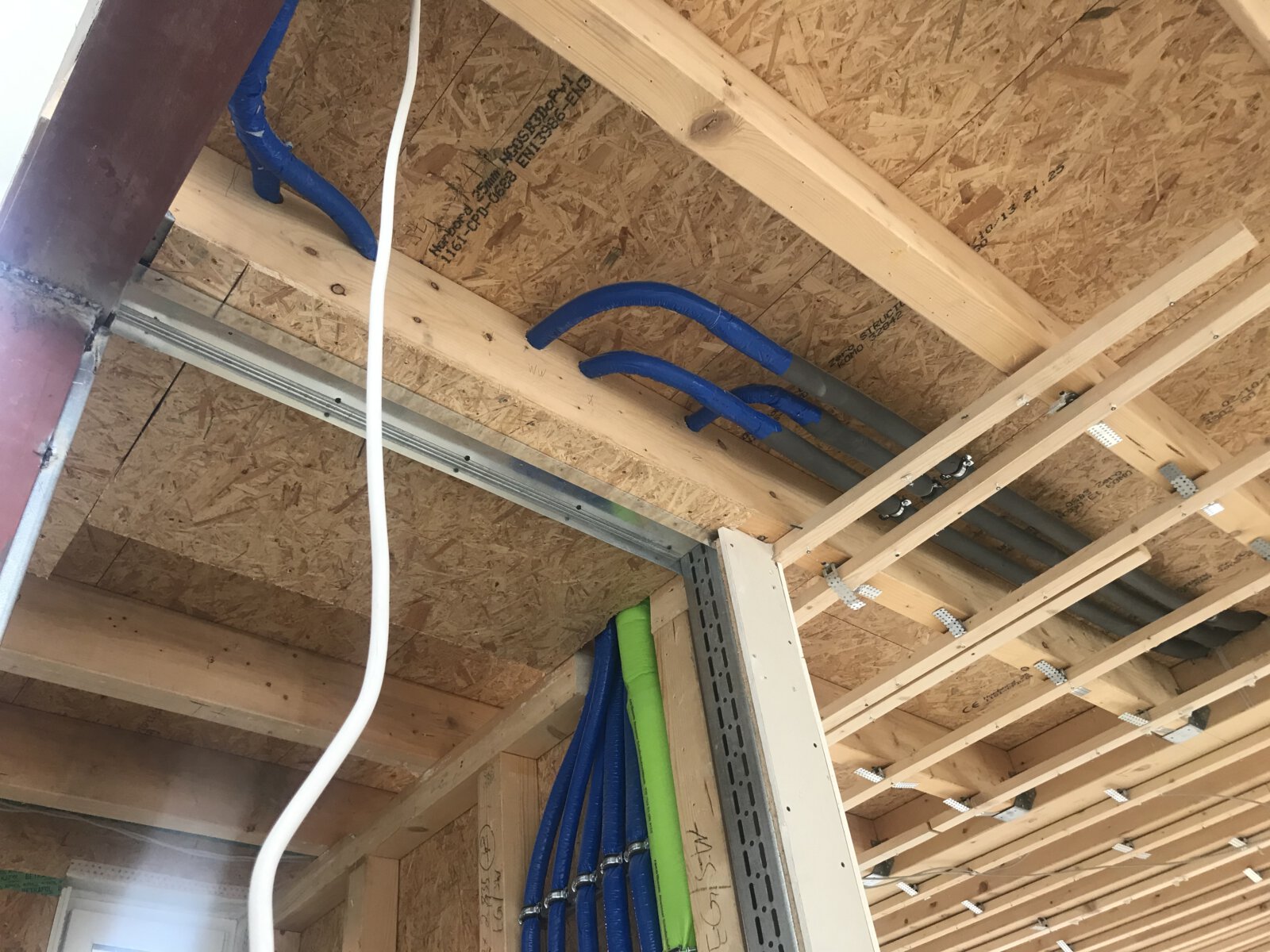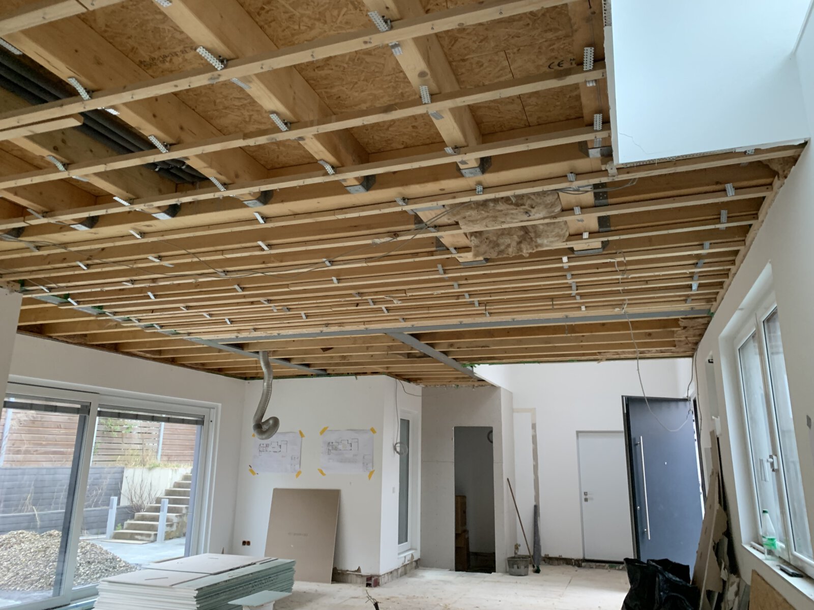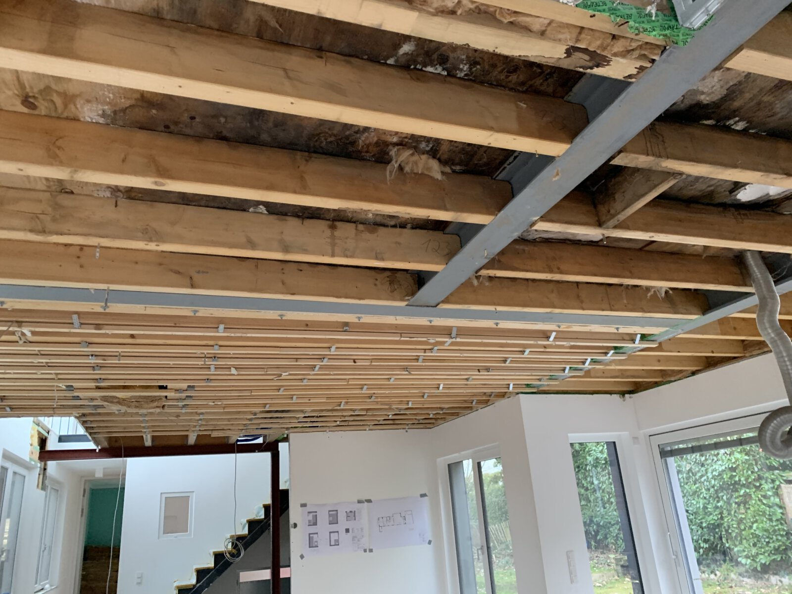 Aufgrund der beim Neubau des Hauses vor ca. 10 Jahren falsch eingebauten Dampfsperre ist in der Decke Kondenswasser entstanden, dass die komplette Dämmung durchfeuchtet hat. Diese wurde ausgebaut und in Zusammenarbeit mit einem erfahrenen zertifizierten Energieberater neu berechnet und nun fachgerecht eingebaut und abgedichtet. Sicherheitshalber wurde die Dichtigkeit des Flachdaches vor Einbau der Dämmerung geprüft.