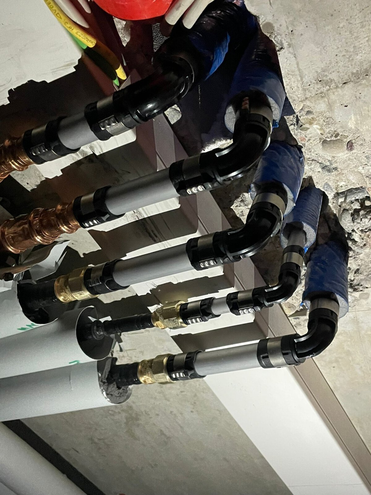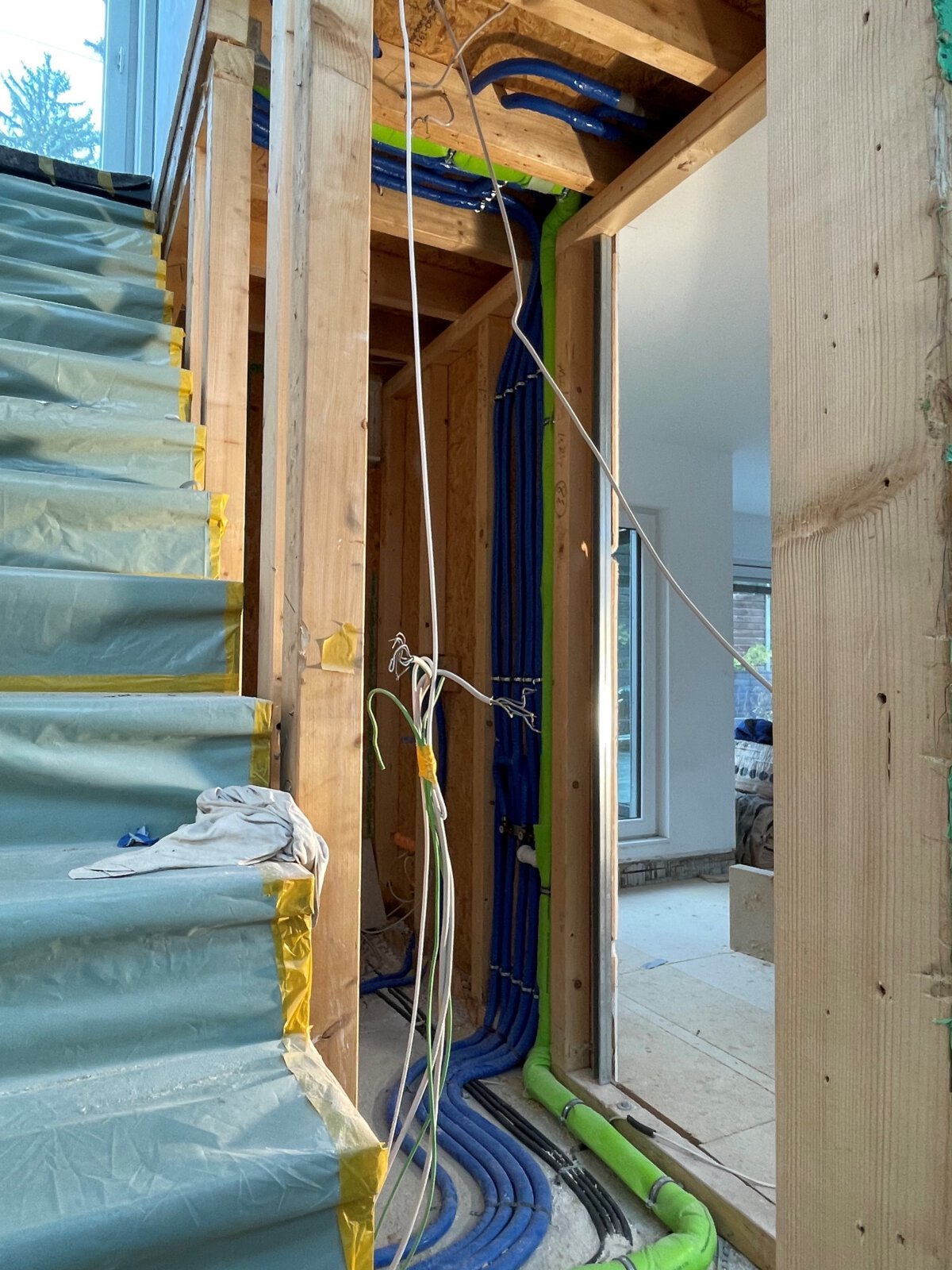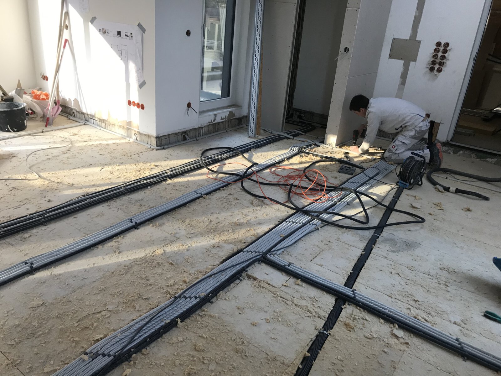Im kompletten Erdgeschoss wird ein neuer Heizestrich mit Fußbodenheizung verlegt, um in Kombination mit neuen, großformatigen Fliesen eine komfortable Wohnatmosphäre zu schaffen.