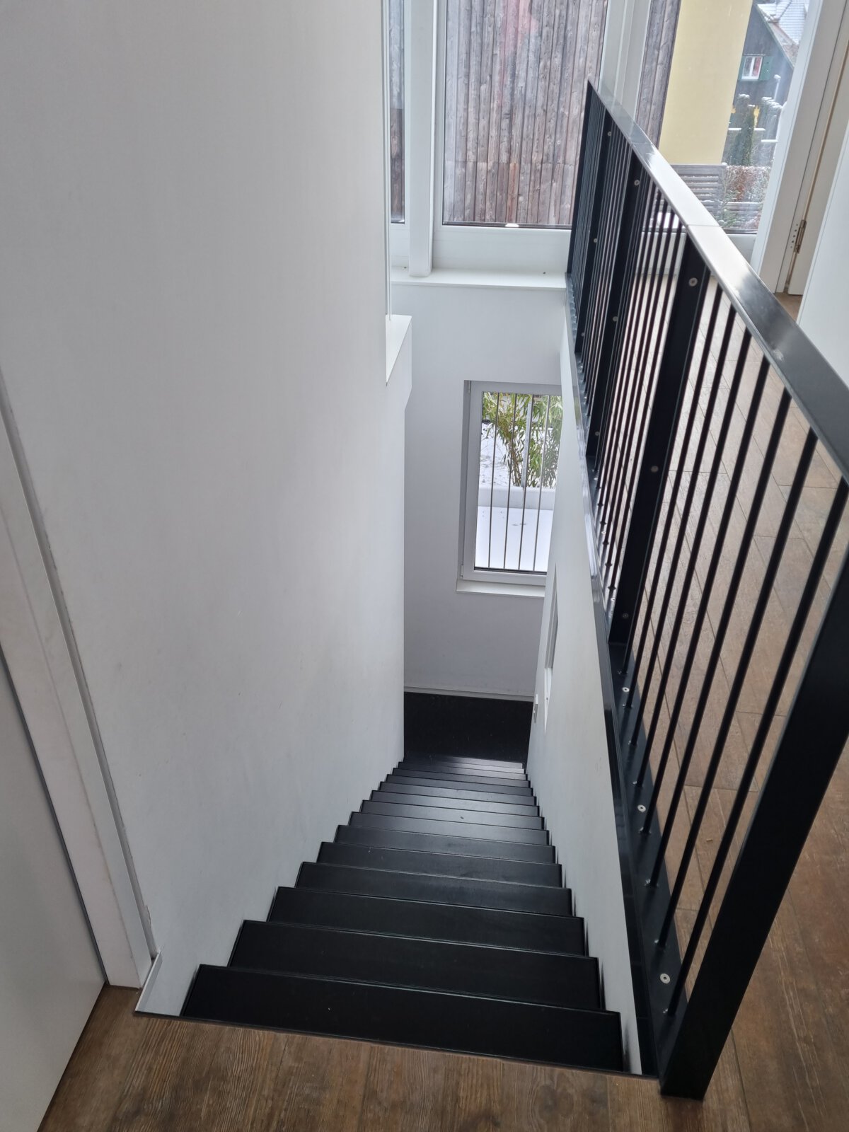 Da die Bestandstreppe ins Obergeschoss den Bauherren zu steil war, wurde diese von dem Projektteam von raum und form- Innnenarchitektur & Architektur komplett neu konzipiert. Im Rahmen des letzten Bauabschnitts wird nun ein bequem zu betretendes Holzpodest in Ergänzung zu einer modernen Falt-Metalltreppe mit aufgelegten Holzstufen eingebaut. Als Absturzsicherung werden Drahtseile verwendet, die von der Decke bis zu den Treppenstufen gespannt werden, so dass die Treppe schwebend wirkt. Dadurch entsteht der zur Zeit sehr angesagte „Industrial-Style“, der gut zu der außergewöhnlichen Fassade passt und sich ebenfalls in dem neuen Beleuchtungskonzept, mit einer Auswahl gut aufeinander abgestimmten Leuchten wiederfindet.
