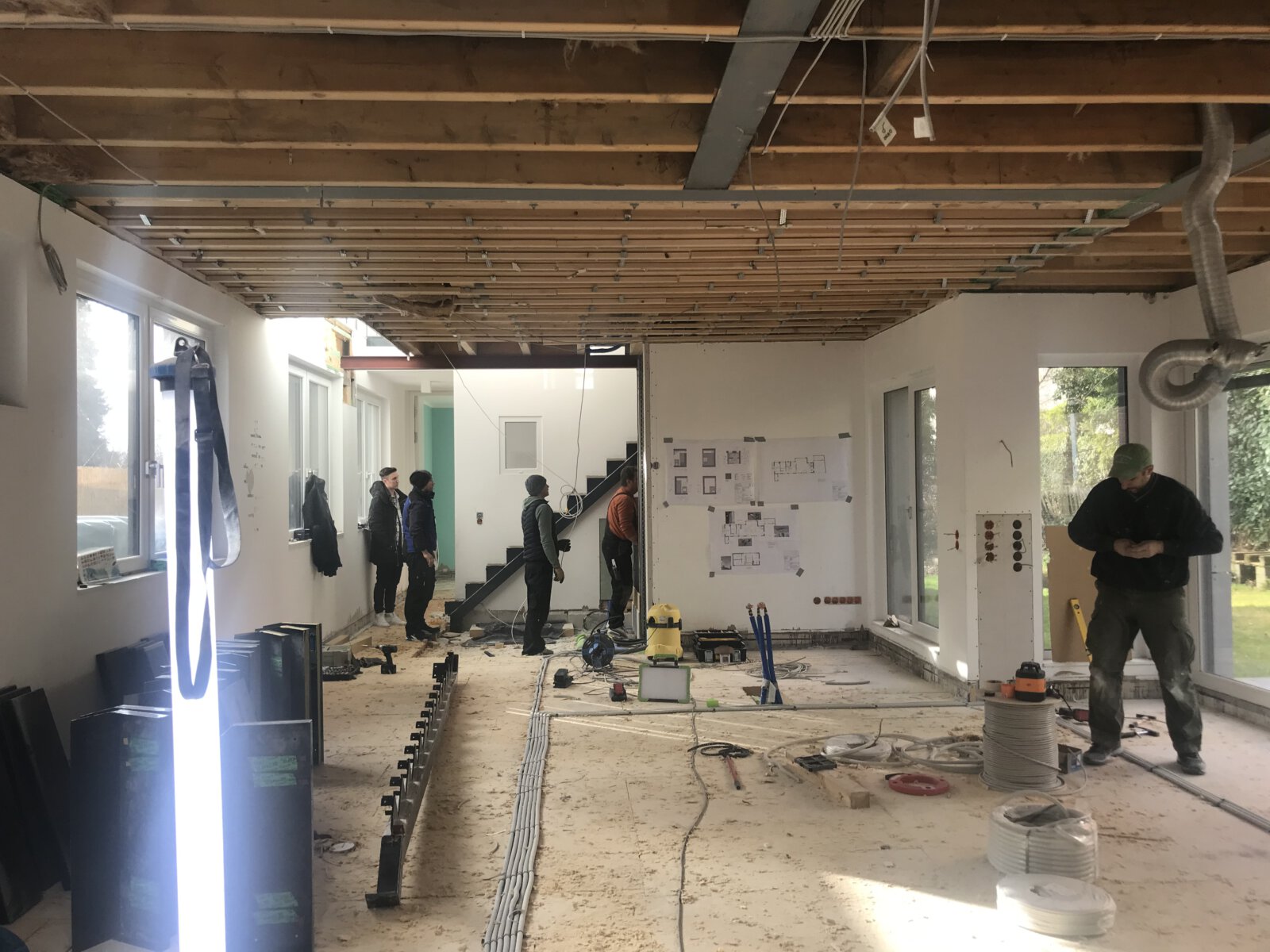 Der Baubeginn erfolgte im Herbst des vergangenen Jahres, zunächst wurden aufgrund einer komplett neuen Grundrisskonzeption des Objekts mit geräumiger offenen Küche mit Kochinsel, daran anschließendem Essbereich und der Umplatzierung des Wohnbereiches mit Blickbezug zum Garten hin, der nur durch sehr große Fensterfronten abgetrennt wird, optisch aber zukünftig als Wohnraumerweiterung zu sehen ist, verschiedene umfangreiche Abbrucharbeiten vorgenommen und im Anschluss die Rohbau- und Trockenbauarbeiten