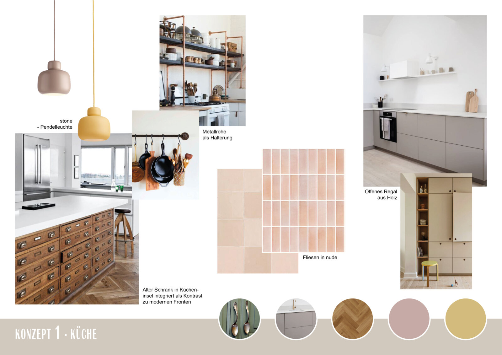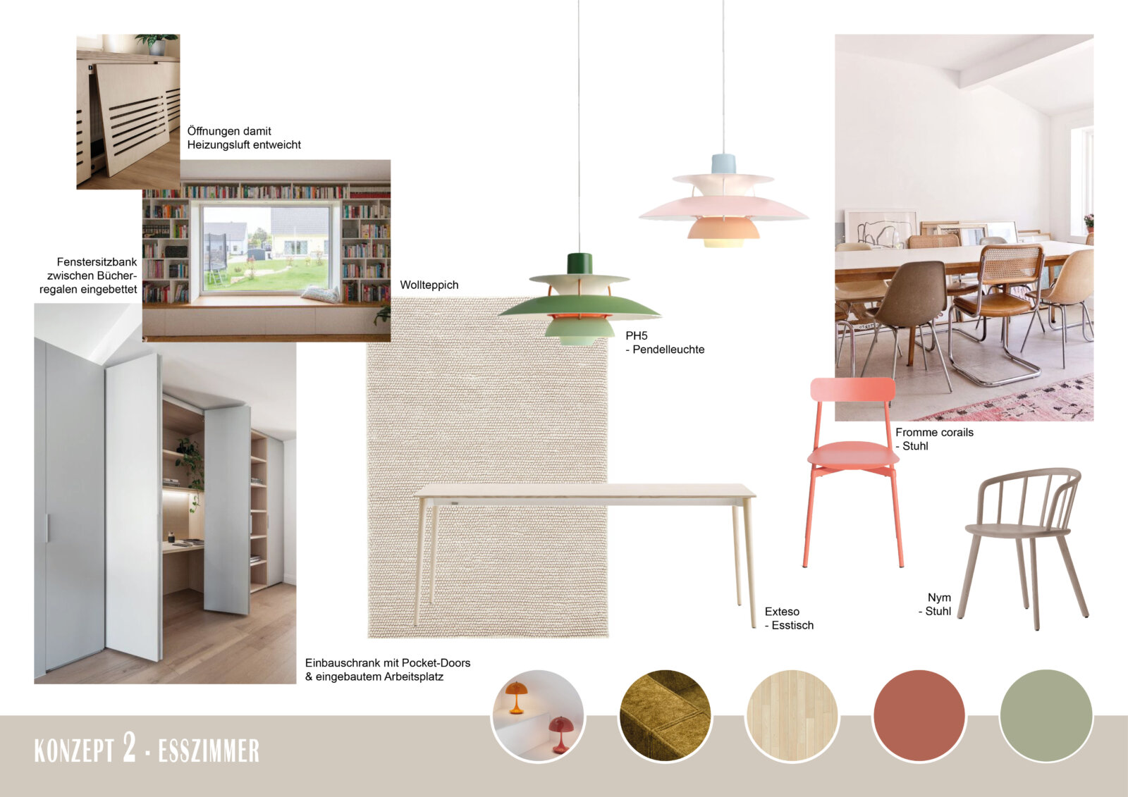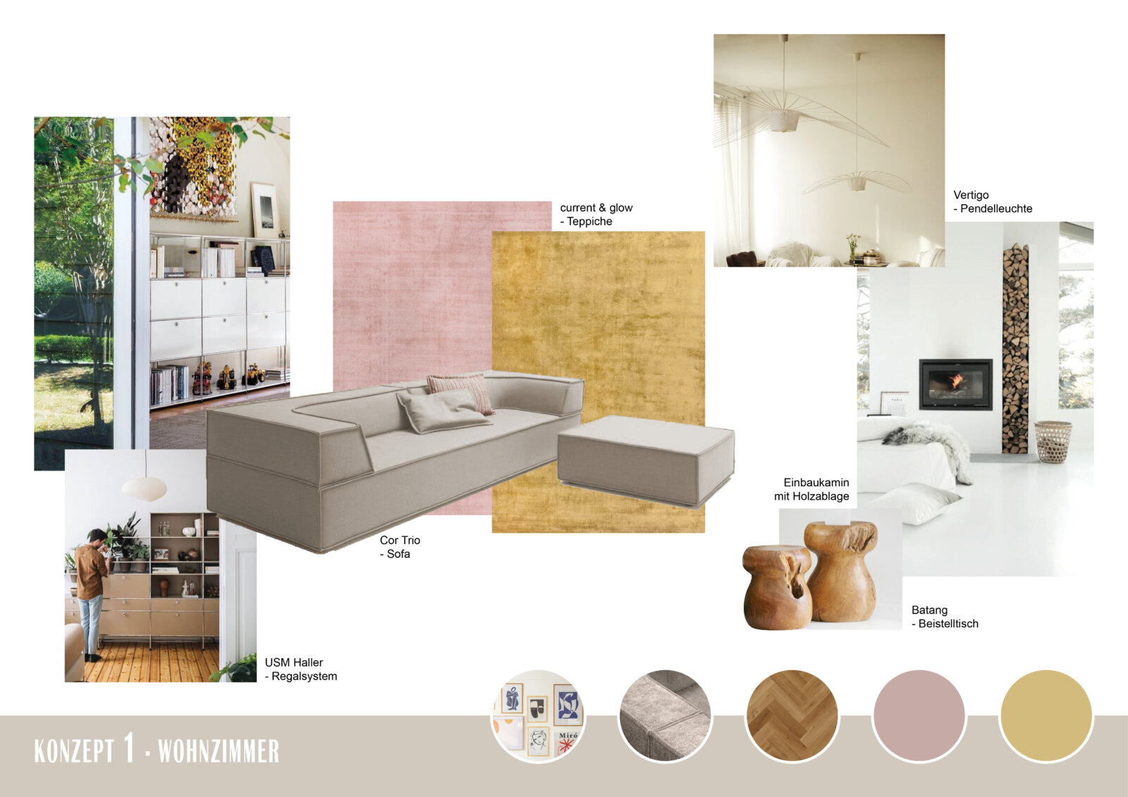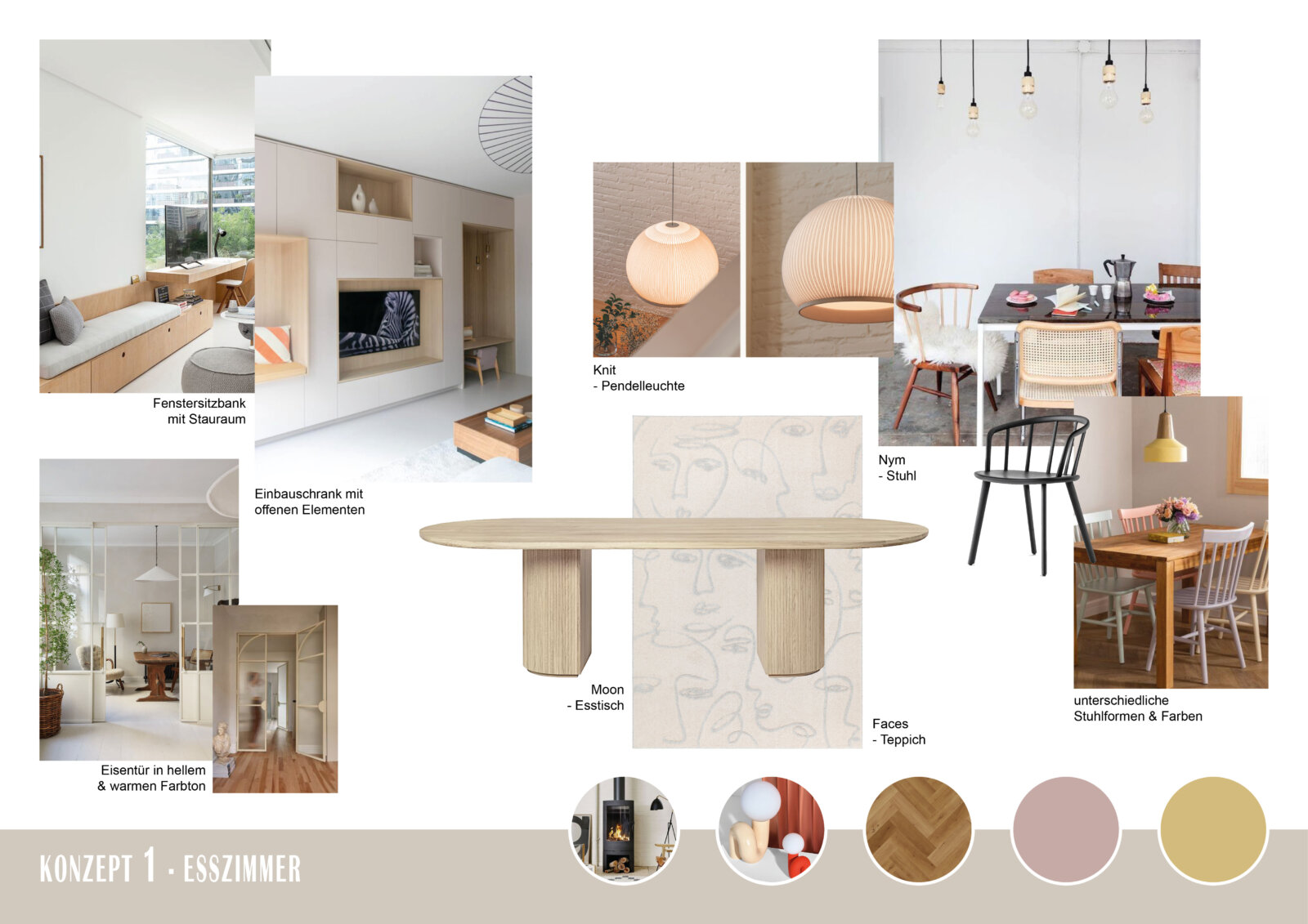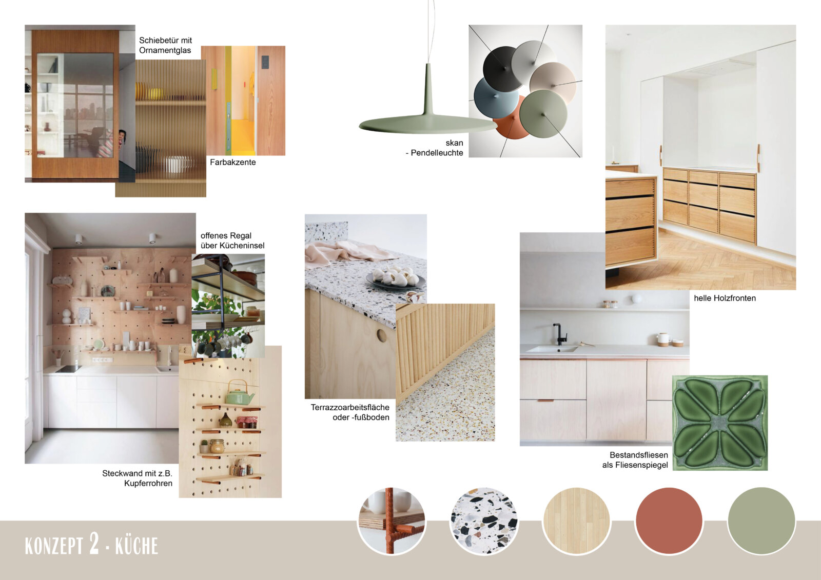 Im nächsten Schritt unterstützte raum in form-Innenarchitektur & Architektur die Kunden dabei, ihre Wünsche und Vorstellungen von einem einladenden, hellen und behaglichen Ambiente in ein zusammenhängendes Gestaltungskonzept zu integrieren. Hierzu wurden für jeden Raum und jedes Konzept Moodboards erstellt, die Material-, Produkt- und Farbvorschläge aufzeigen.