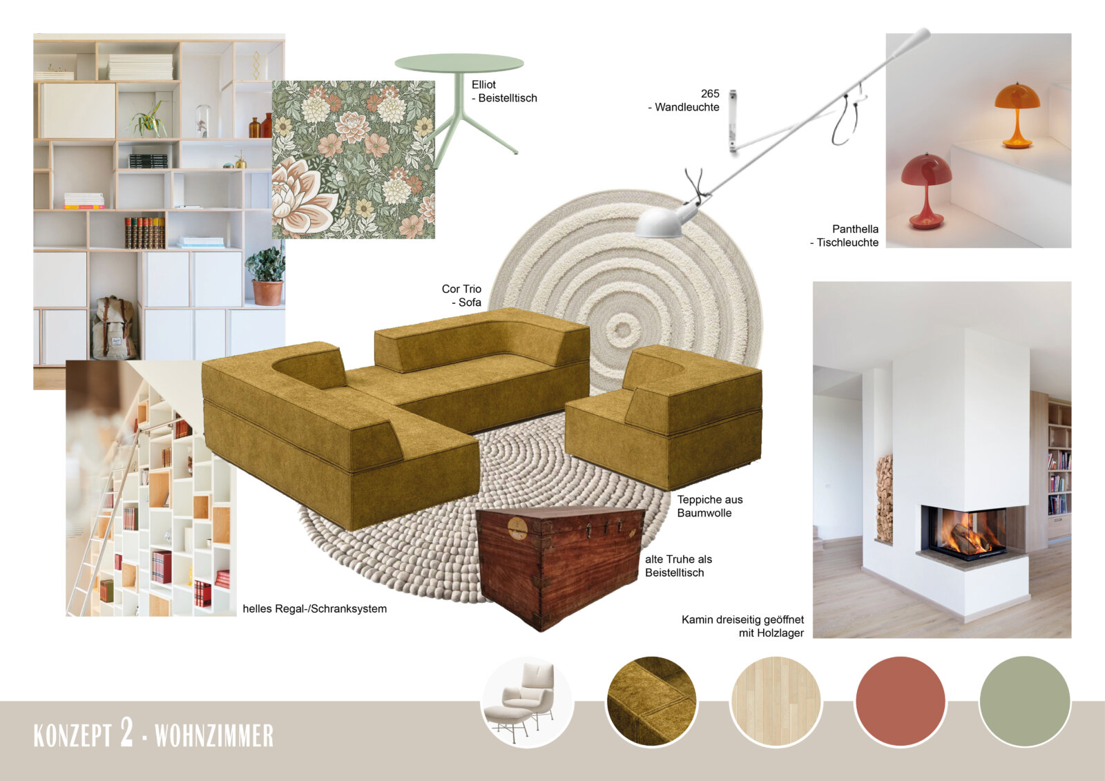 Konzept 2 folgt einer ähnlichen Designphilosophie wie Konzept 1, wobei auch hier eine Mischung aus natürlichen und modernen Elementen im Vordergrund steht. Im Unterschied zu Konzept 1 werden jedoch die Farben Grün und Gelb etwas mutiger eingesetzt, wie beispielsweise beim Sofamaterial oder in der Tapete. Zudem schlug das Planungsteam den Kunden vor, die Farbakzente in der Küche durch einen Boden aus Terrazzofliesen oder eine Arbeitsplatte aufzugreifen.
