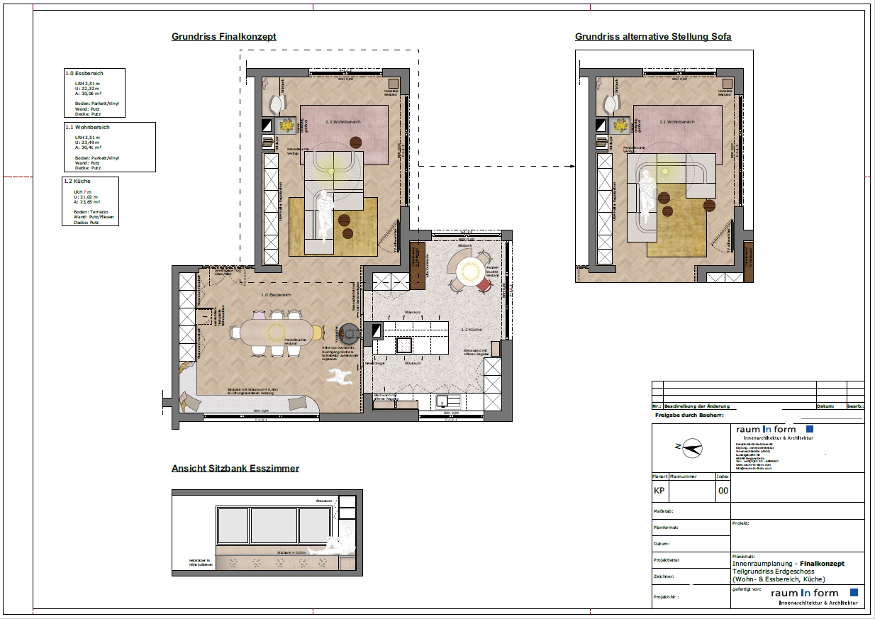 Auf Basis des gemeinsamen Brainstormings und den vorherigen Besprechungen wurden im Anschluss zwei Konzeptvarianten erarbeitet. Die Aufgabe bestand darin, ein einheitliches Konzept für die Wohnräume zu entwickeln, in welchen sich die junge Familie wohlfühlt. Die Herausforderung dieses Projekts bestand darin, die einzelnen voneinander getrennten Bestandsräume sowie den geplanten Küchenanbau in einem einheitlichen Konzept zu vereinen. Gleichzeitig galt es, den Wunsch der Kunden zu erfüllen, den Innen- und Außenraum harmonisch miteinander zu verbinden.