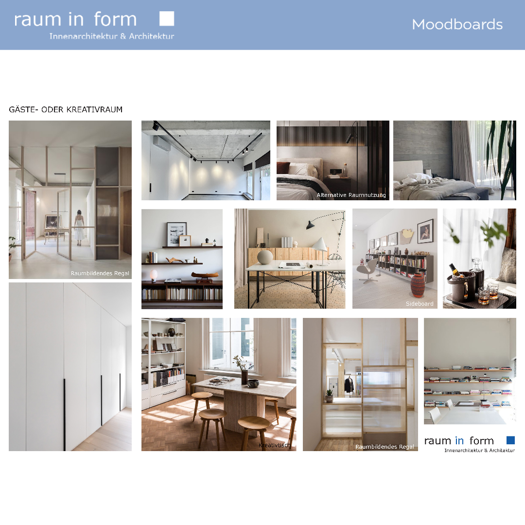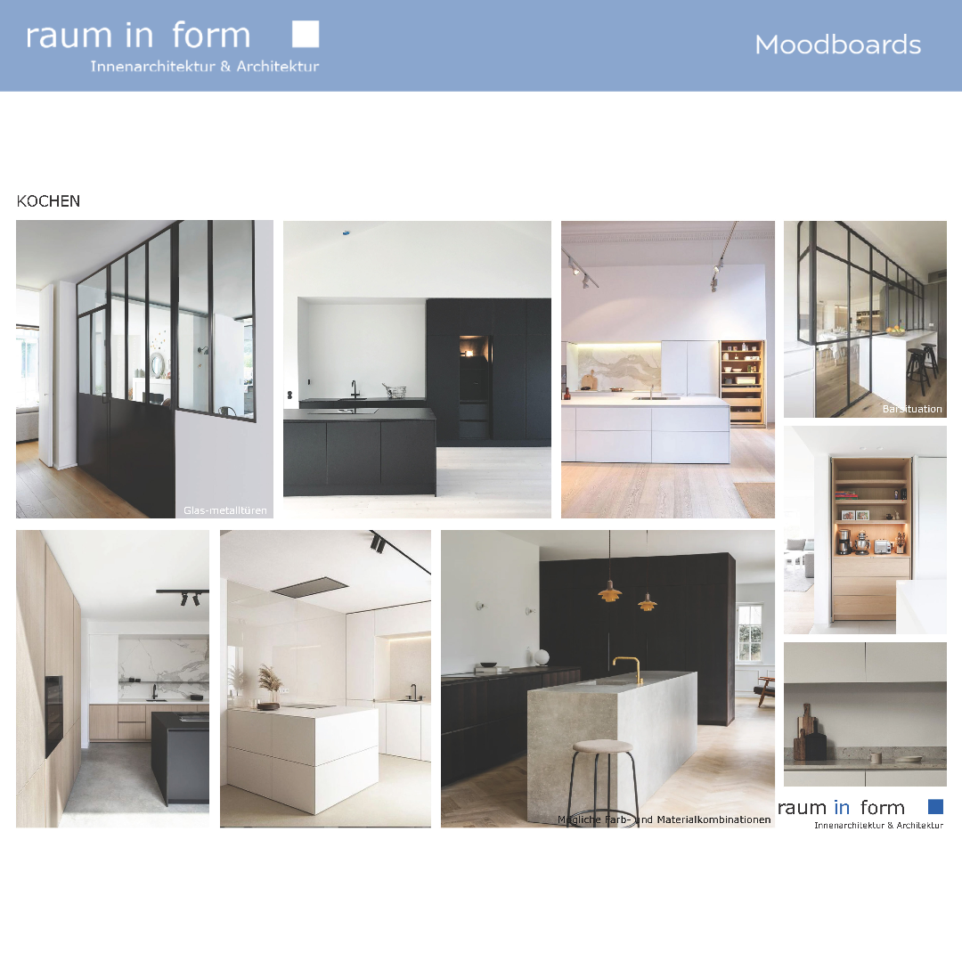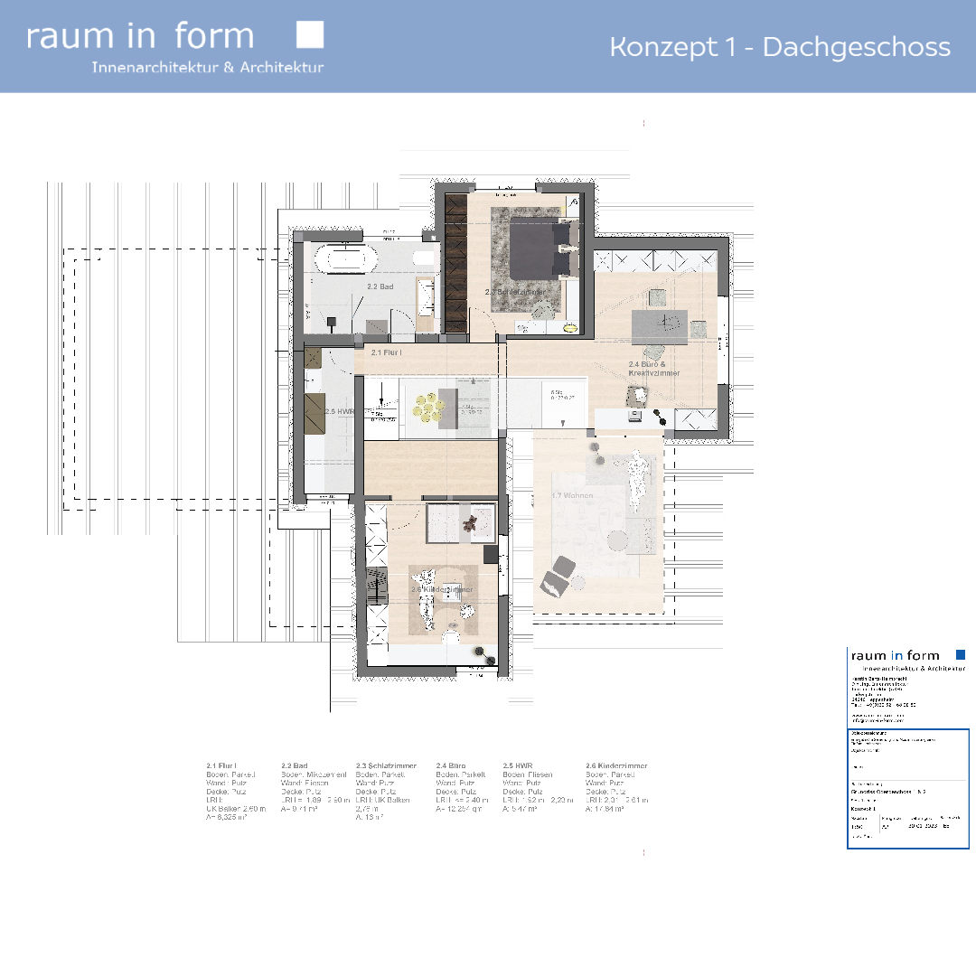 In einem ausführlichen Konzept- Brainstorming und unter Berücksichtigung der von den Bauherren definierten Wünsche und Anforderungen, entwickelt das raum in form- Projektteam mehrere kreative und individuelle Ansätze zur innenarchitektonischen Gestaltung des in „Split-Level-“ Bauweise in den 1980-er Jahren errichteten Fachwerkhauses. Die im Anschluss erarbeiteten individuellen Konzeptentwürfe für die Modernisierung des Fachwerkhauses wurden den Bauherren nur zwei Monate nach der Auftragserteilung in einer umfangreichen Konzeptvorstellung und in Verbindung mit der Präsentation der ganzheitlichen Material-, Produkt- und Farbvorschläge präsentiert.