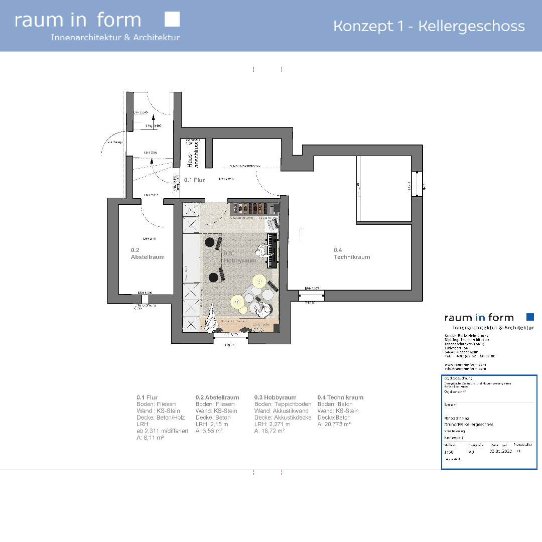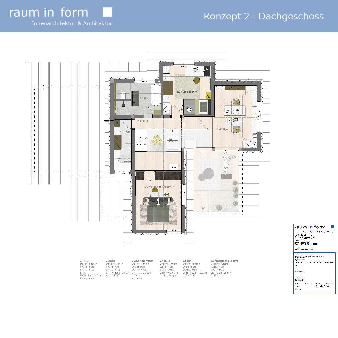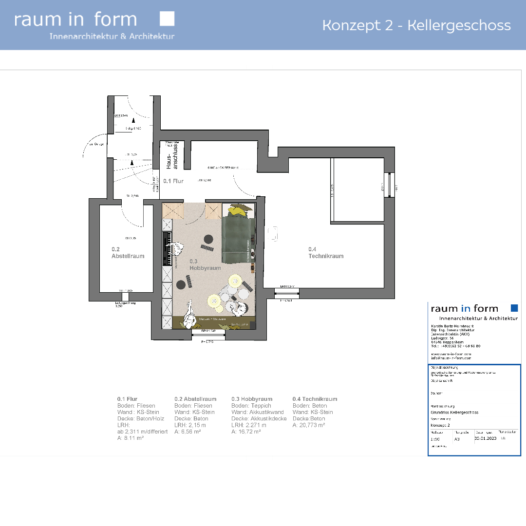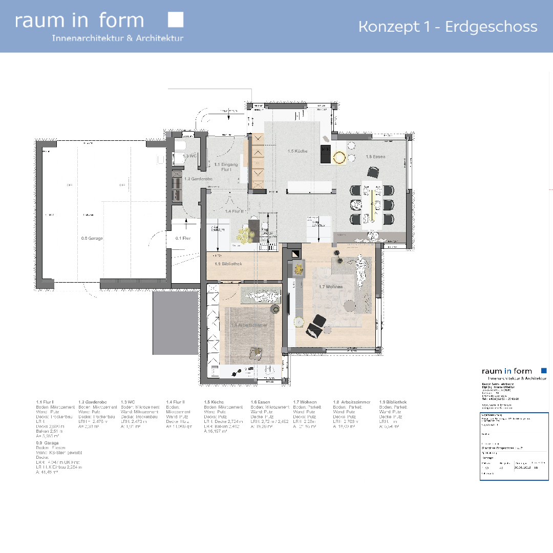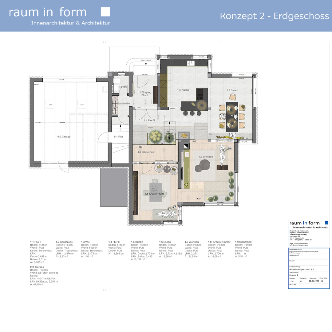 Für das Einfamilienhaus wurden pro Geschoss zwei unterschiedliche Konzepte erarbeitet, welche im Anschluss an die Konzeptpräsentation und nach den nachfolgenden intensiven Abstimmungen zwischen den Bauherren und dem Projektteam derzeit zu einem Finalkonzept zusammengefügt werden.