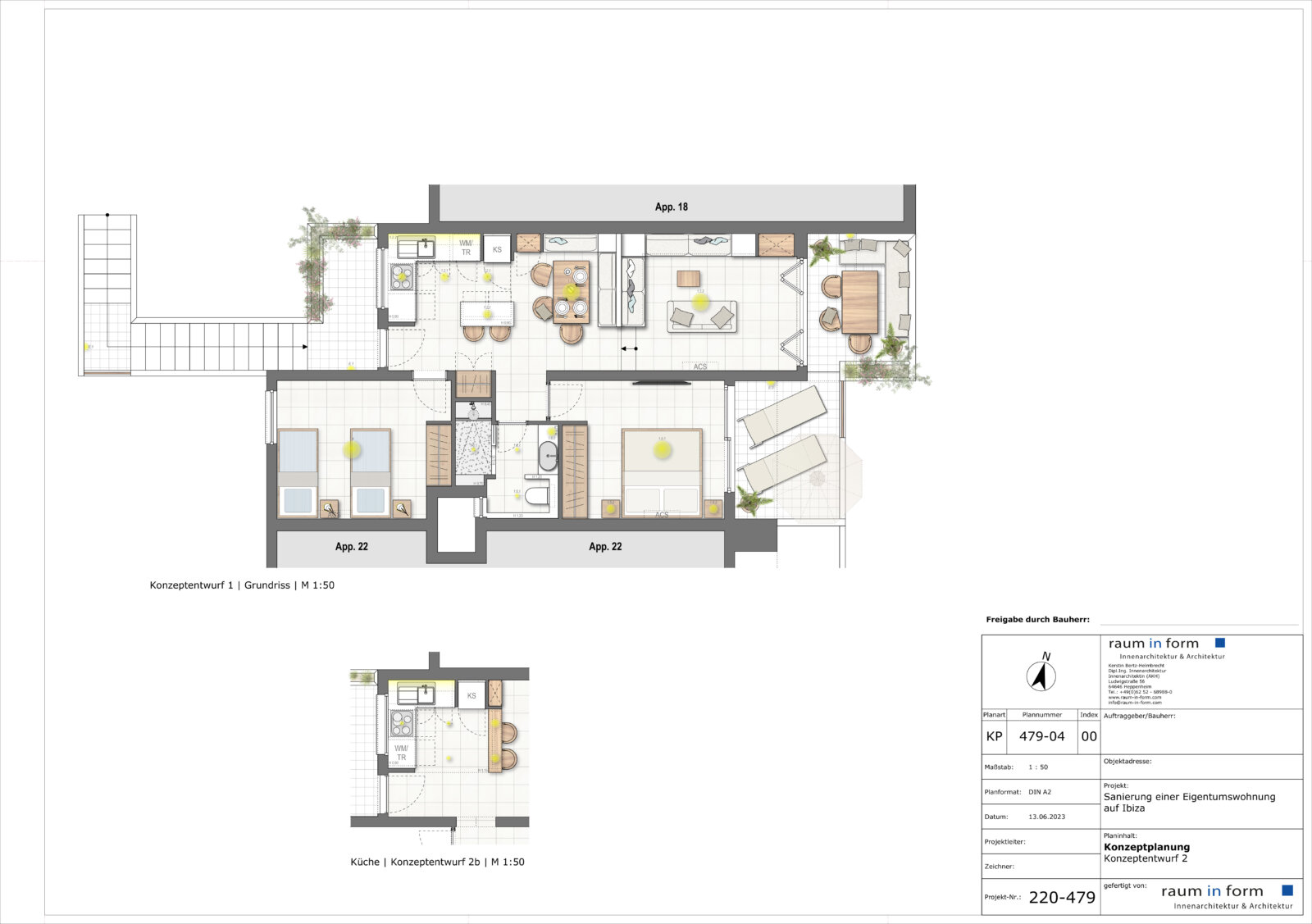 Infolge der Beauftragung von „raum in form– Innenarchitektur & Architektur“ Ende April 2023 mit der Grundlagenerarbeitung, den Konzeptplanungen und der Kostenschätzung für die Baukosten für die Sanierung der Eigentumswohnung, wurde direkt nach der Auftragserteilung erste Konzeptskizzen erarbeitet. Das dafür notwendige Aufmaß konnte aufgrund der ständigen Präsenz vor Ort auf Ibiza bereits kurz nach der Auftragserteilung durchgeführt werden.