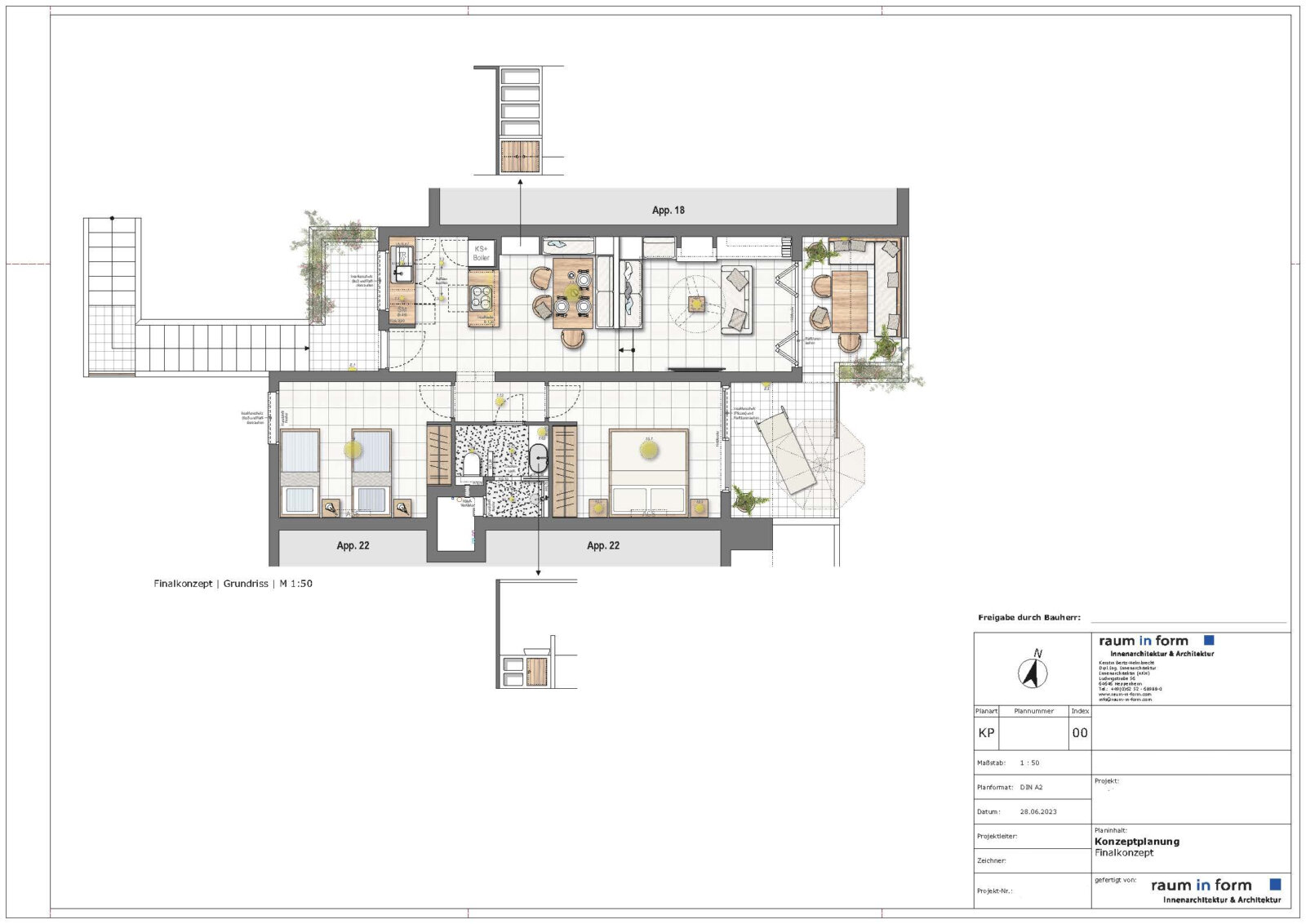 Nach der Fertigstellung der Konzeptplanungen ist „raum in form– Innenarchitektur & Architektur“ auch für die Erarbeitung sämtlicher Ausführungsplanungen sowie für die Vorbereitung und Durchführung der Vergabe an die verschiedenen Gewerke aus dem über viele Jahre hinweg gewachsenen Handwerkernetzwerk auf den Balearen, vorgesehen.