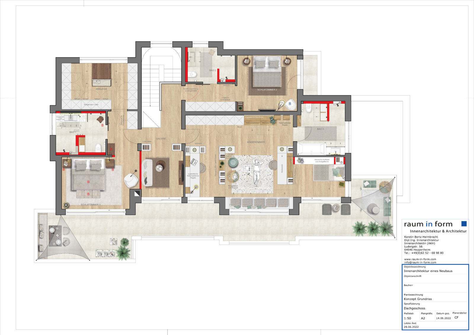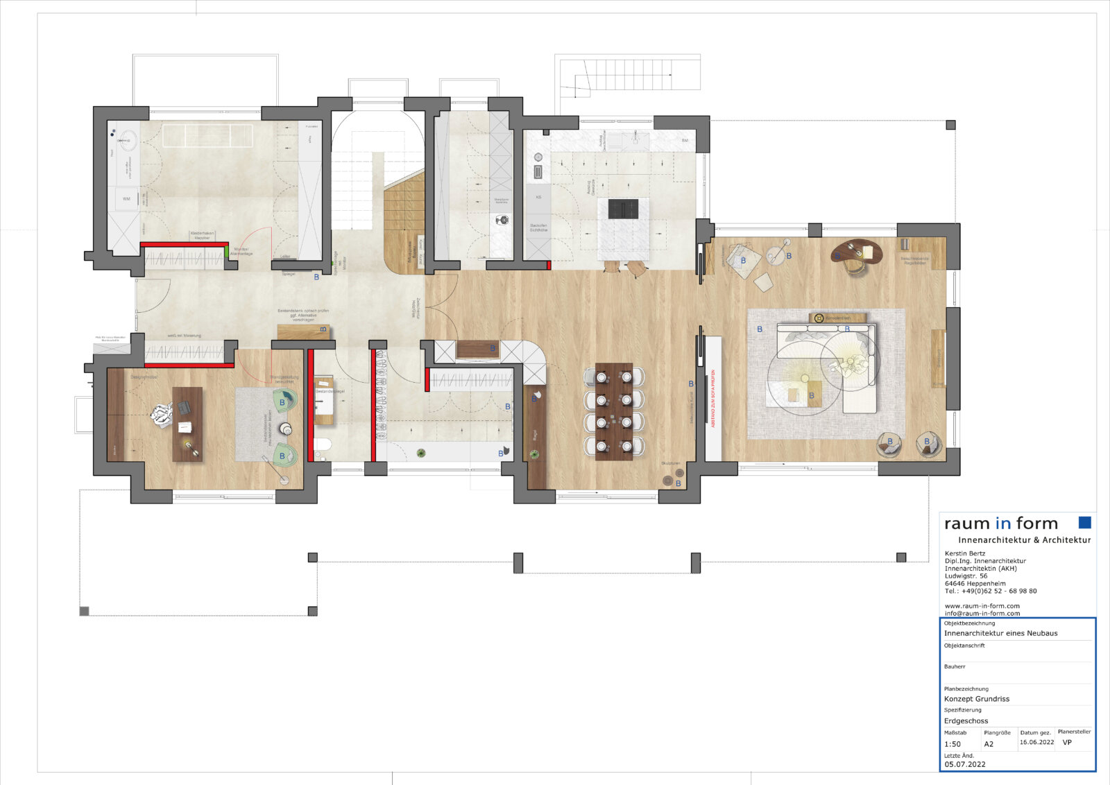 Der Auftrag umfasst sowohl die Konzeption der Grundrisse und Ansichten der einzelnen Geschosse wie auch das komplette Design sämtlicher Ausstattungselemente, die Unterbreitung von Materialvorschlägen sowie die Konzeption der kompletten Möblierung und aller weiteren Einrichtungsgegenstände. Dabei nutzt das dreiköpfige Projektteam rund um die Unternehmensinhaberin und Innenarchitektin Kerstin Bertz-Helmbrecht das seit über zwei Jahrzehnten bestehende Lieferanten- Netzwerk von raum in form- Objekteinrichtungen, das aus über 200 renommierten und innovativen Herstellern besteht. Nach Abschluss der Einrichtungskonzeption und Auswahl der Ausstattungsgegenstände wird derzeit auf Grundlage des Finalkonzeptes ein ganzheitliches Beleuchtungskonzept entwickelt sowie alle Ausführungsplanungen für die einzelnen Gewerke erstellt.
