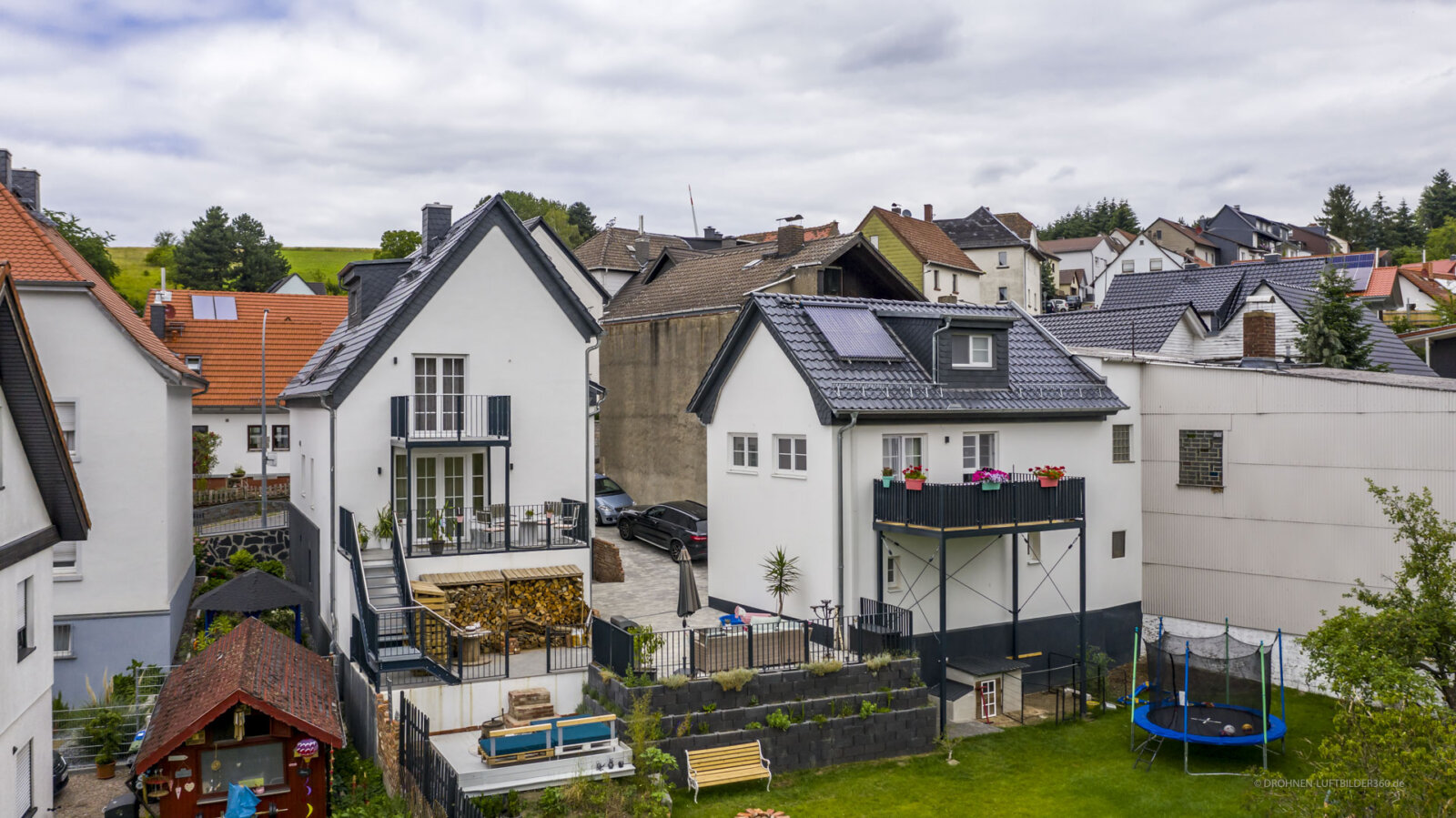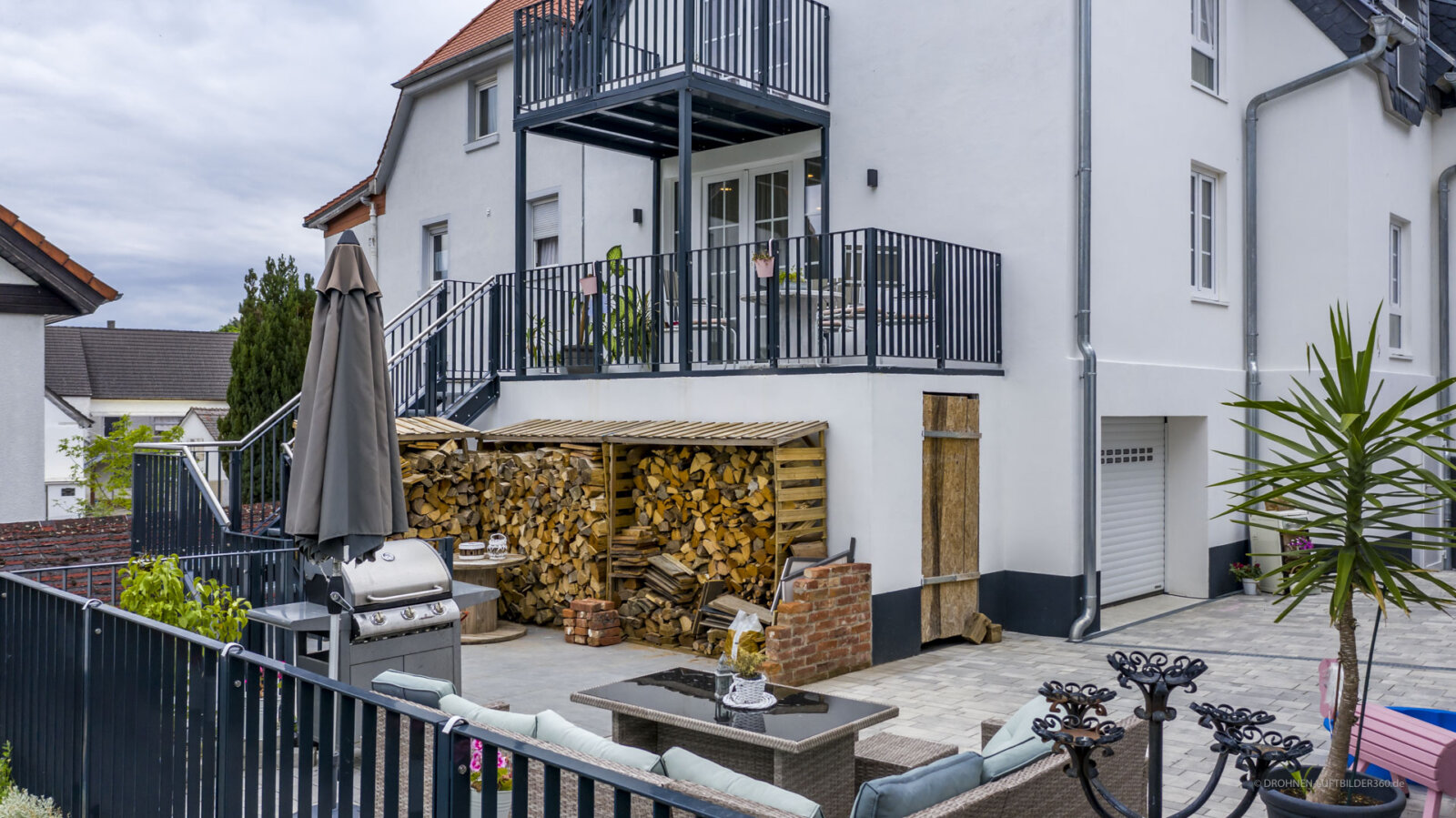 Auch für die Scheune wurden mehrere Konzepte entwickelt, die in der Scheune geplante Wohnung ist zur Vermietung vorgesehen und kann später von einem der Kinder genutzt werden. Im Außenbereich wurde ein großer Freiplatz gestaltet und umfangreiche Pflasterarbeiten durchgeführt, um mehrere Fahrzeuge im Hof parken zu können. Das terrassierte Gelände wird über eine Treppe erschlossen. Der Garten grenzt direkt an einen natürlichen Bach und wurde mit einem Pool ausgestattet. Zusätzlich wurden im Garten verschiedene Spielgeräte für die Kinder eingeplant und errichtet.