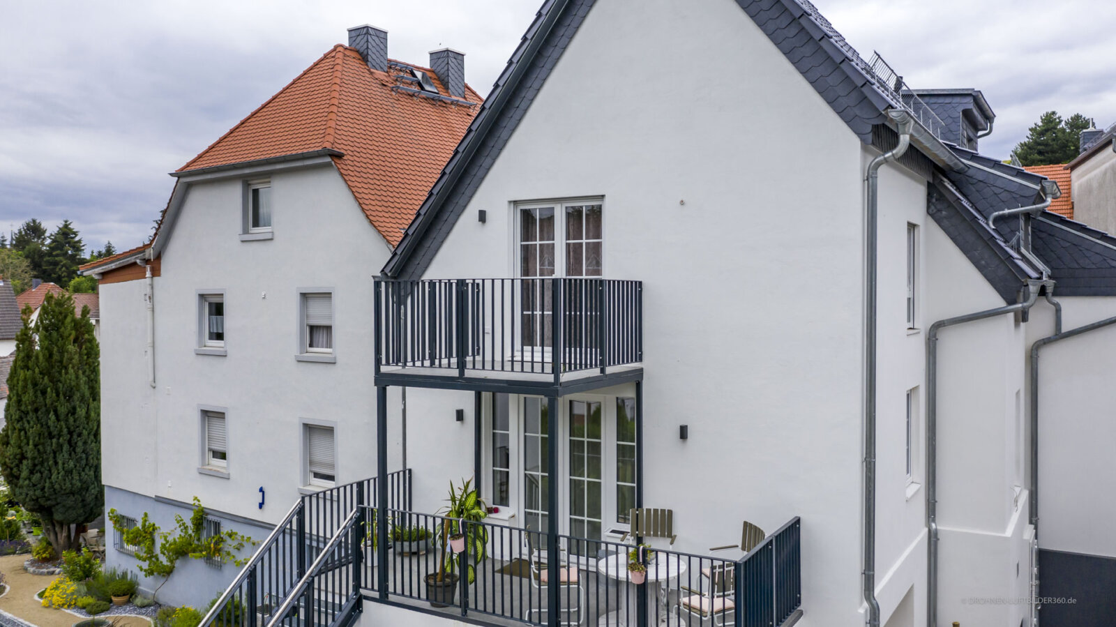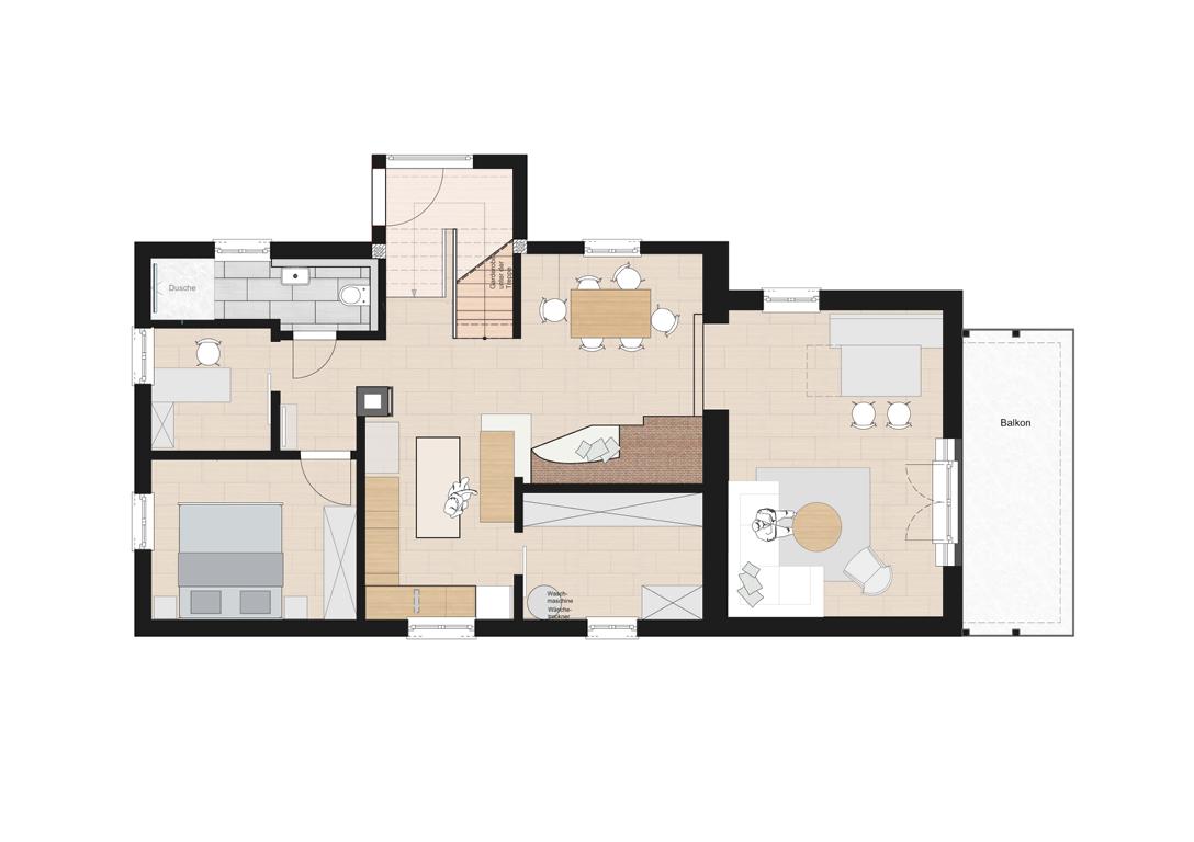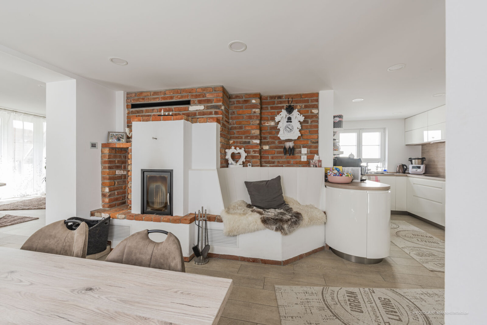Der Eingangsbereich, der in Verbindung mit dem Treppenaufgang stand, musste nach eingehenden statischen Untersuchungen komplett abgerissen werden, da festgestellt wurde, dass keine Fundamente vorhanden waren. Daher wurde auch für den Neubau dieses Bereichs ein Bauantrag gestellt, um den Eingangsbereich inklusive Treppenhaus neu bauen zu können und so statisch korrekt an das Bestandsgebäude anzubinden. Der neu errichtete Eingangsbereich mit neuer Treppenanlage konnte durch diese Maßnahme so geplant werden, dass unterhalb der Treppe ein großzügiger Garderobenbereich entstand. In den Kellerräumen wurden weiterhin auch Nutzräume untergebracht, wie z.B. die Heizungsanlage. Im Erdgeschoss wünschten sich die Bauherren eine offene Küche mit direktem Zugang an einen vor den Blicken der Gäste geschützten Hauswirtschaftsraum, in dem die Waschmaschine, der Trockner und verschiedene Regale Platz finden. Außerdem sollte eine beheizte Sitzmöglichkeit, die direkt an den Kamin angebunden ist, als Übergang zum Essbereich dienen. Von hier wurde ein großzügiger Durchgang zum jetzigen Wohnbereich geschaffen, der durch bodentiefe Fenster einen hervorragenden Blick mit Durchgang zur großen Terrasse bietet. Von der Terrasse aus kann man über eine neu geplante und gebaute Treppenanlage den weitläufigen Garten erreichen. Zur Straßenseite hin ist im Erdgeschoss zum einen ein Gästebereich mit Schlafmöglichkeit und Badezimmer entstanden und zum anderen ein Arbeitszimmer für die Bauherrin.