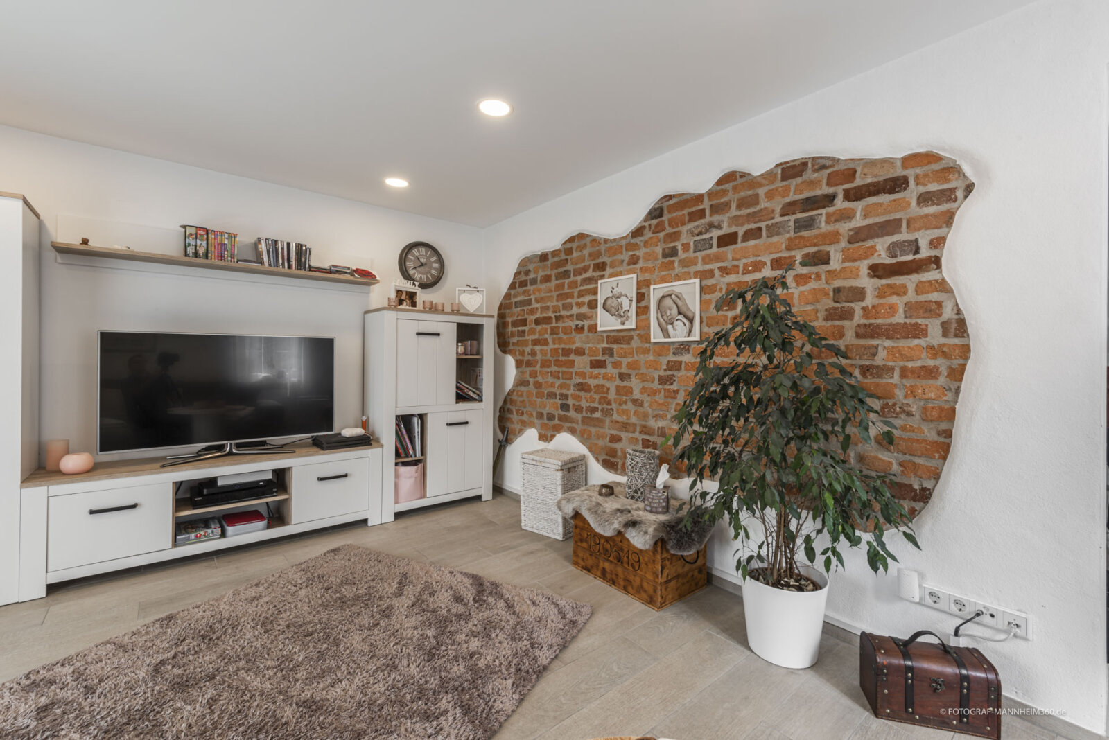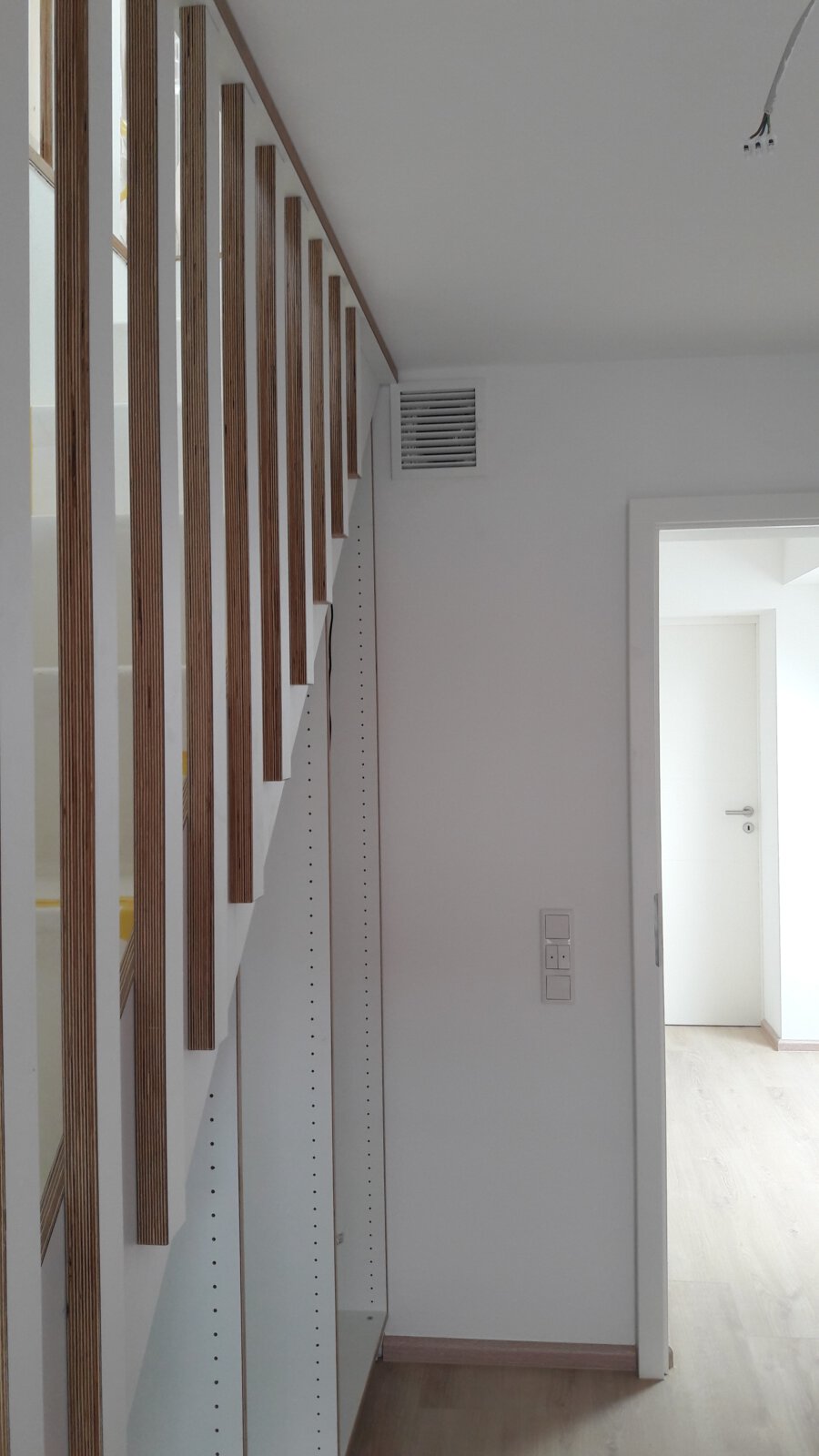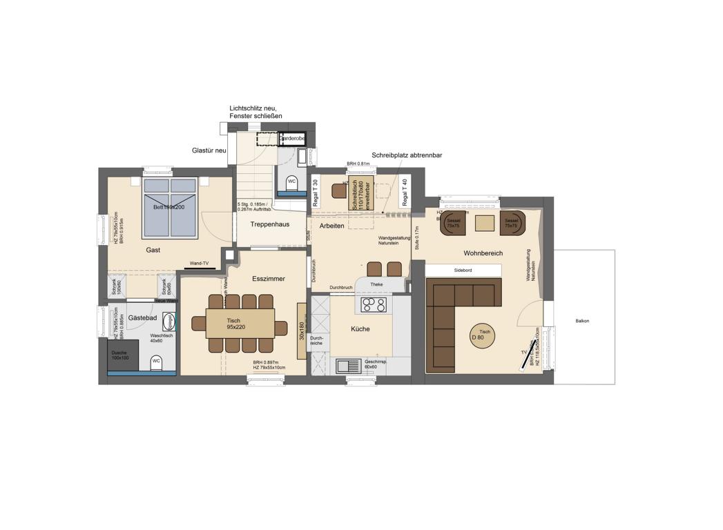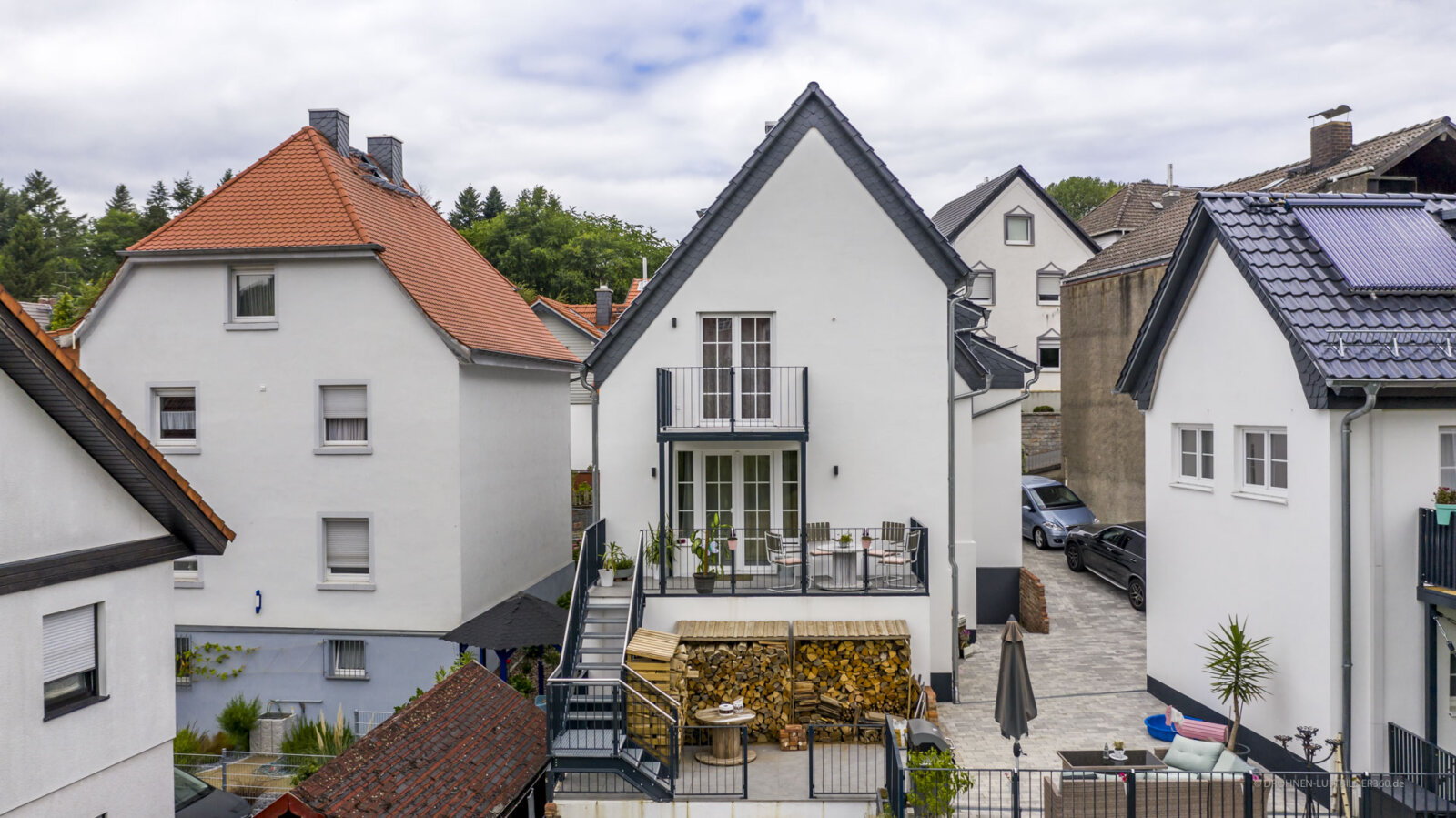 Der Eingangsbereich, der in Verbindung mit dem Treppenaufgang stand, musste nach eingehenden statischen Untersuchungen komplett abgerissen werden, da festgestellt wurde, dass keine Fundamente vorhanden waren. Daher wurde auch für den Neubau dieses Bereichs ein Bauantrag gestellt, um den Eingangsbereich inklusive Treppenhaus neu bauen zu können und so statisch korrekt an das Bestandsgebäude anzubinden. Der neu errichtete Eingangsbereich mit neuer Treppenanlage konnte durch diese Maßnahme so geplant werden, dass unterhalb der Treppe ein großzügiger Garderobenbereich entstand. In den Kellerräumen wurden weiterhin auch Nutzräume untergebracht, wie z.B. die Heizungsanlage. Im Erdgeschoss wünschten sich die Bauherren eine offene Küche mit direktem Zugang an einen vor den Blicken der Gäste geschützten Hauswirtschaftsraum, in dem die Waschmaschine, der Trockner und verschiedene Regale Platz finden. Außerdem sollte eine beheizte Sitzmöglichkeit, die direkt an den Kamin angebunden ist, als Übergang zum Essbereich dienen. Von hier wurde ein großzügiger Durchgang zum jetzigen Wohnbereich geschaffen, der durch bodentiefe Fenster einen hervorragenden Blick mit Durchgang zur großen Terrasse bietet. Von der Terrasse aus kann man über eine neu geplante und gebaute Treppenanlage den weitläufigen Garten erreichen. Zur Straßenseite hin ist im Erdgeschoss zum einen ein Gästebereich mit Schlafmöglichkeit und Badezimmer entstanden und zum anderen ein Arbeitszimmer für die Bauherrin.