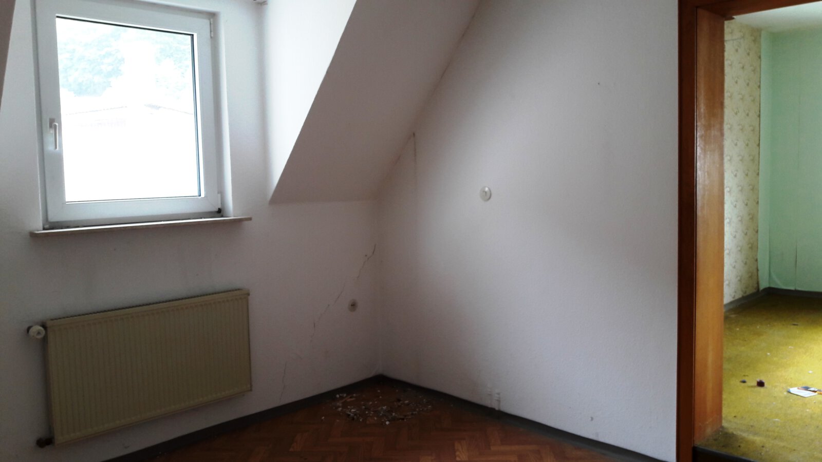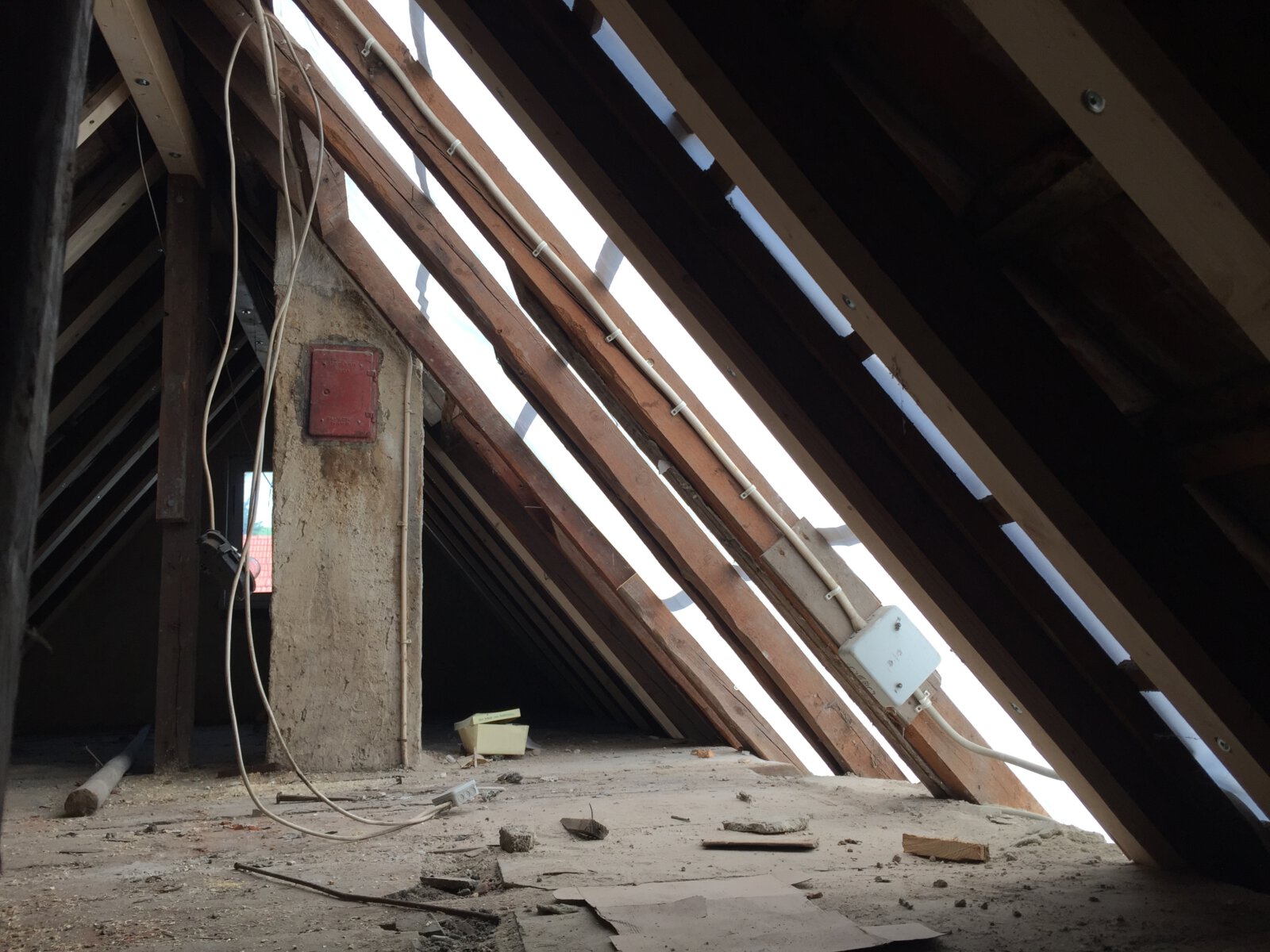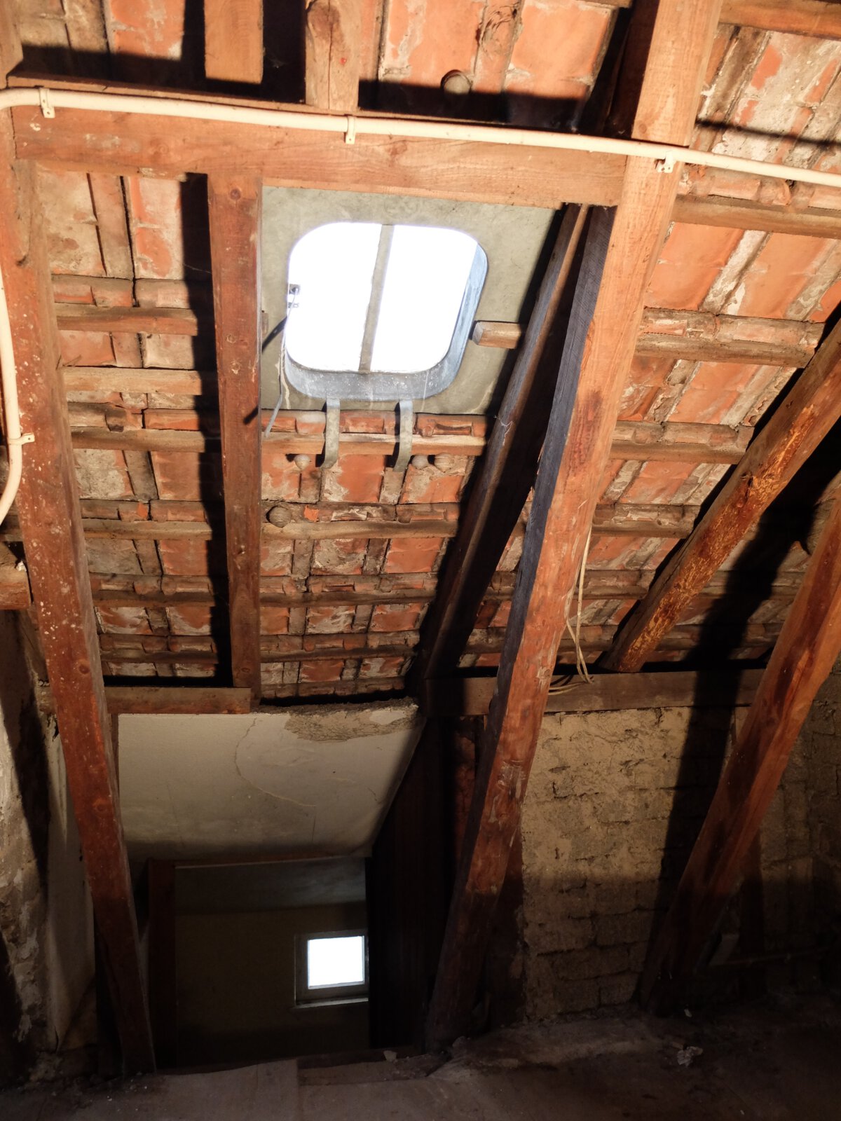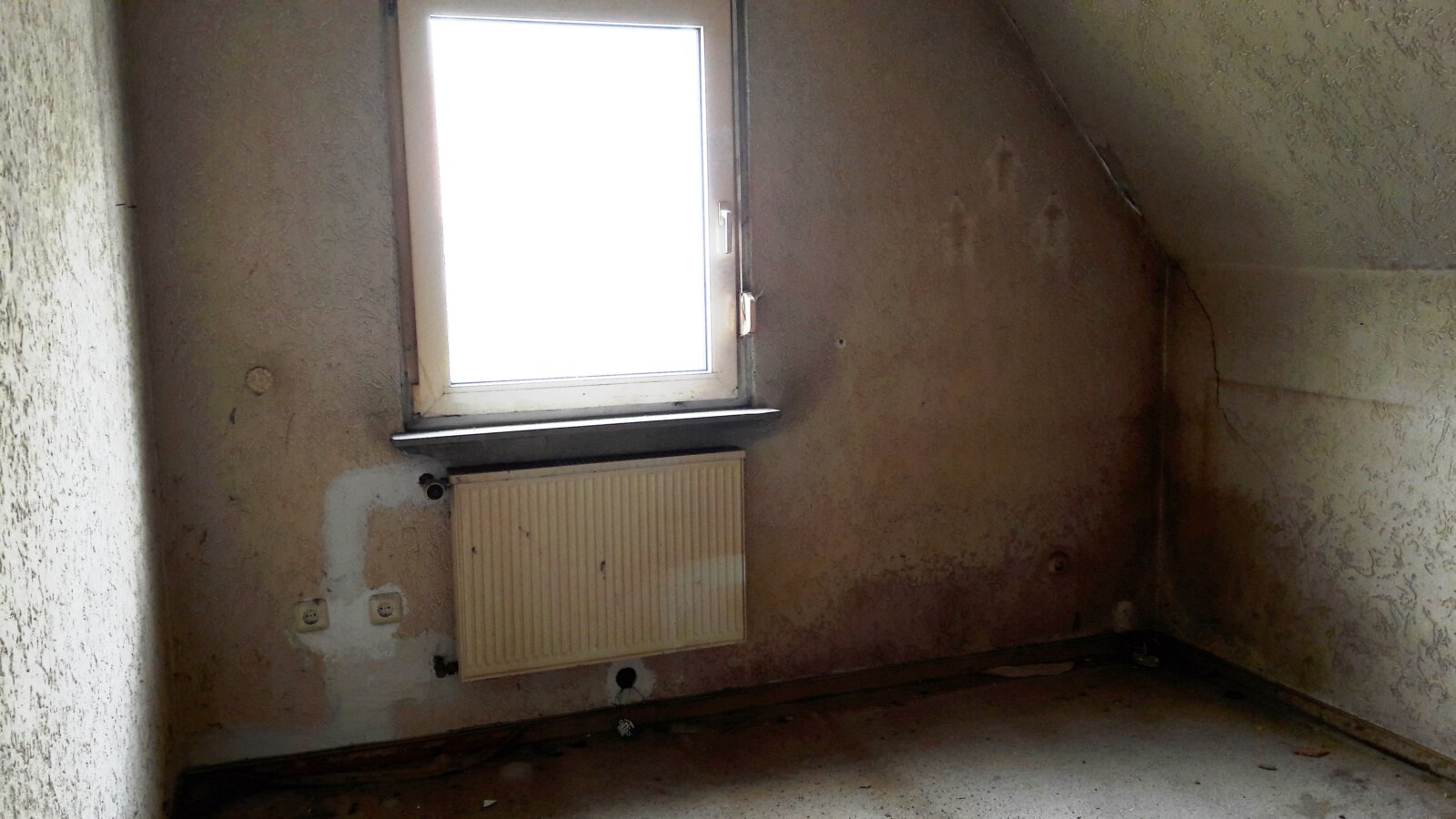 Das Haupthaus und Nebengebäude war bei Ankauf durch unsere Bauherren in einem sehr schlechten Bauzustand- typisch für die 1950-er Jahre waren dunkelbraune Fliesen, abgehängte Holzdecken, kleine Fenster und eine unpraktische und eher beengte Raumaufteilung. Außerdem war das Haus bereits von Schimmel befallen, besaß diverse unterschiedliche Bodenniveaus und eine alte, ausgetretene und marode Treppe, die nicht bestehen bleiben konnte. Dies unter anderem auch aus dem Grund, dass diese im Dachgeschoss nicht genug Kopfhöhe bot.