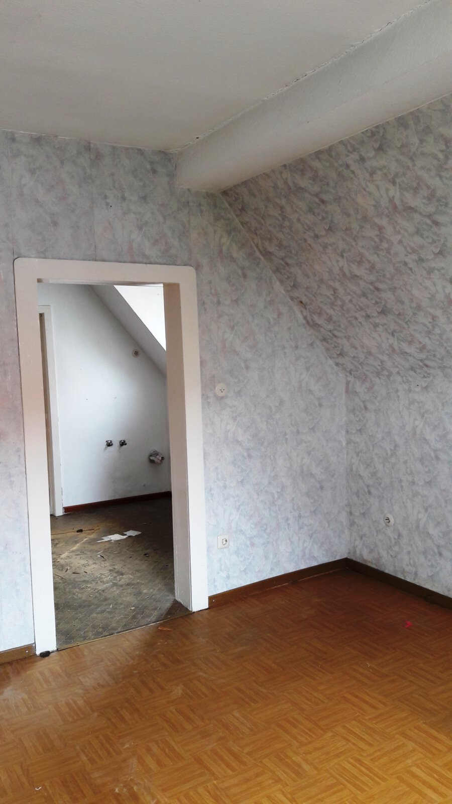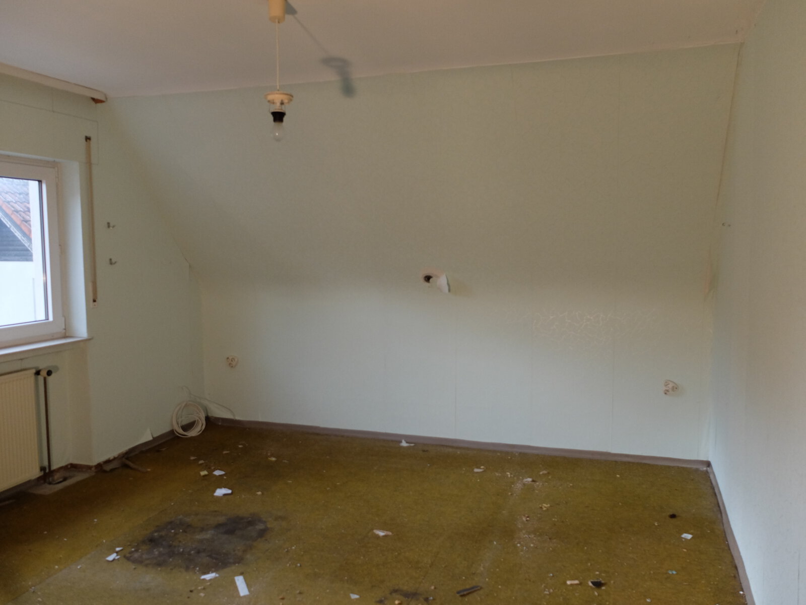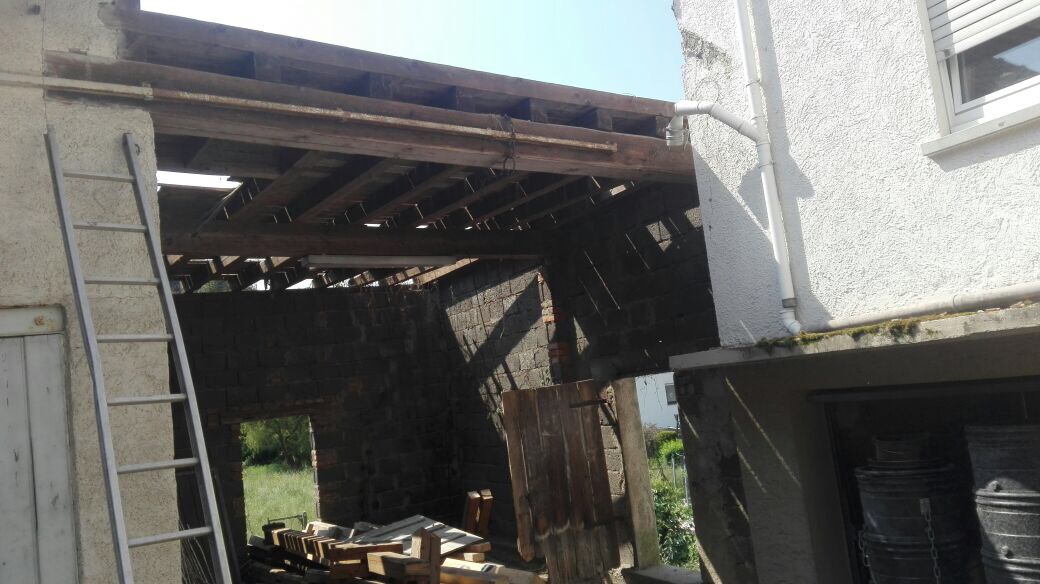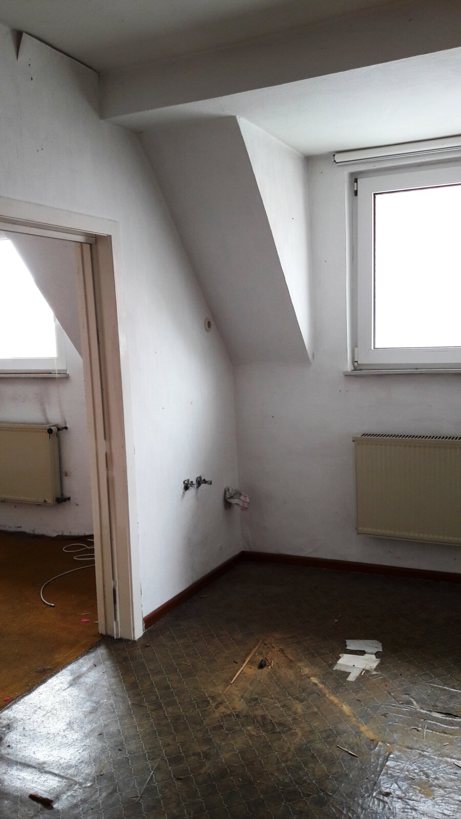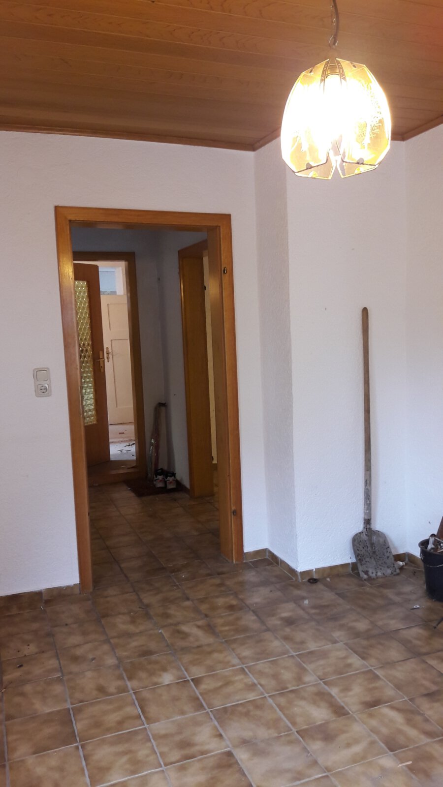 Das Haupthaus und Nebengebäude war bei Ankauf durch unsere Bauherren in einem sehr schlechten Bauzustand- typisch für die 1950-er Jahre waren dunkelbraune Fliesen, abgehängte Holzdecken, kleine Fenster und eine unpraktische und eher beengte Raumaufteilung. Außerdem war das Haus bereits von Schimmel befallen, besaß diverse unterschiedliche Bodenniveaus und eine alte, ausgetretene und marode Treppe, die nicht bestehen bleiben konnte. Dies unter anderem auch aus dem Grund, dass diese im Dachgeschoss nicht genug Kopfhöhe bot.