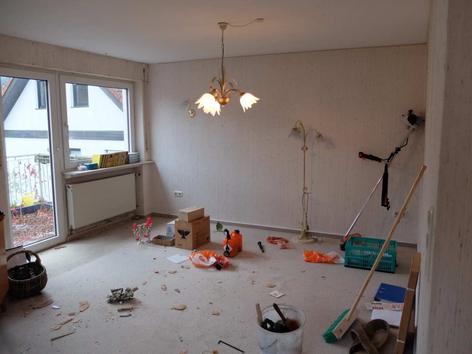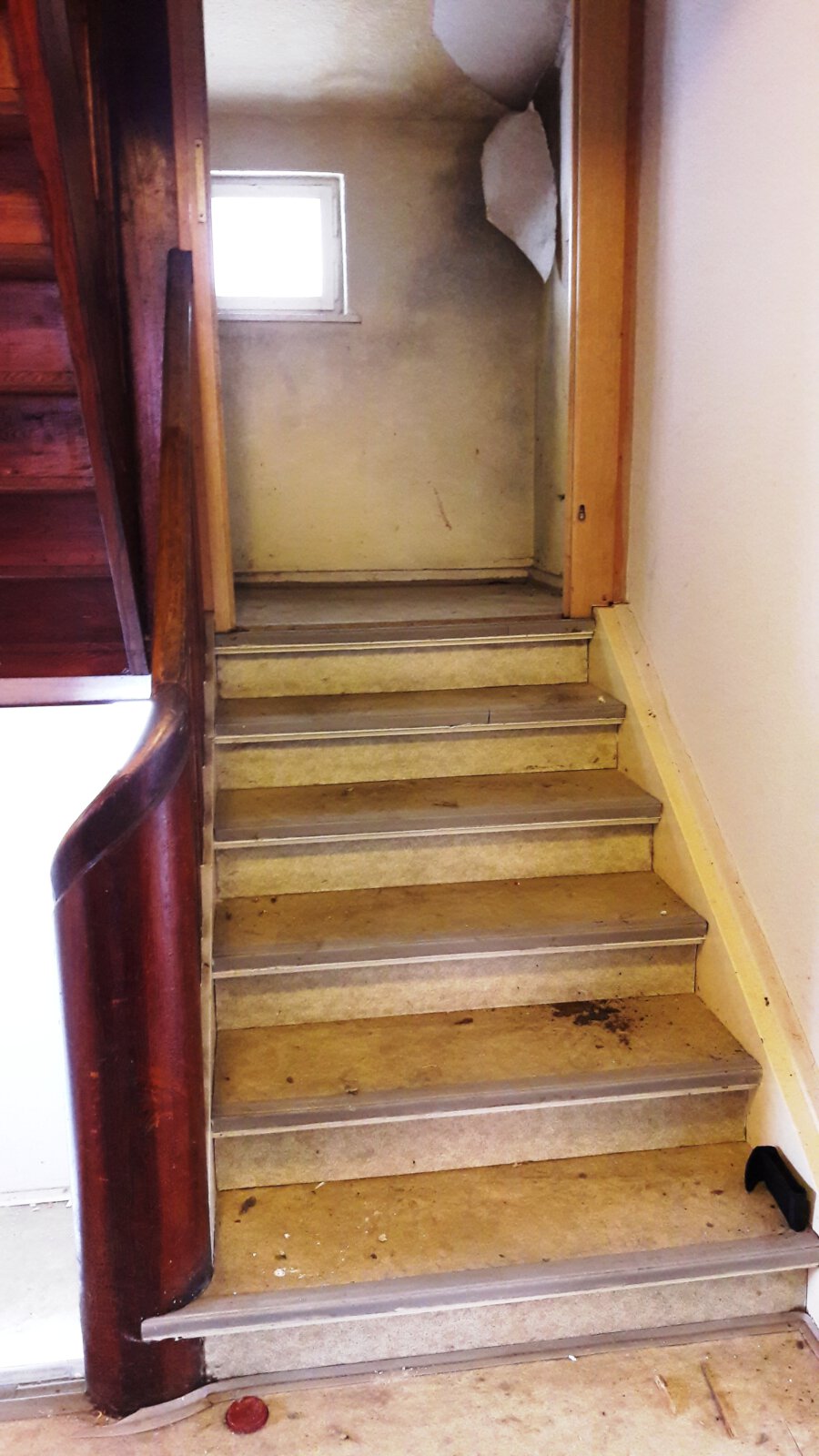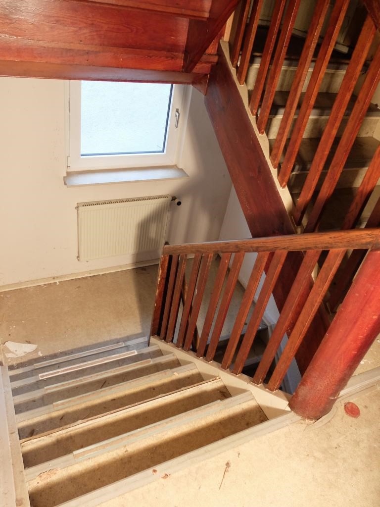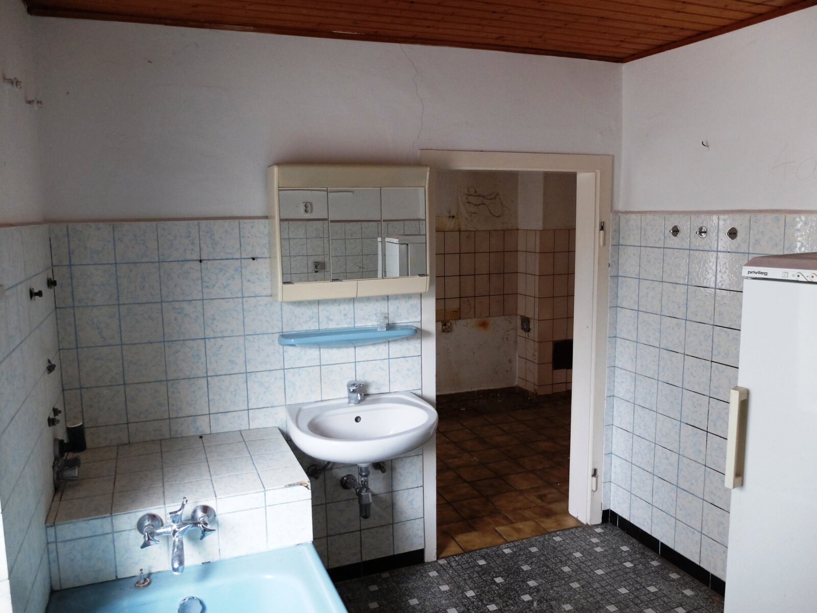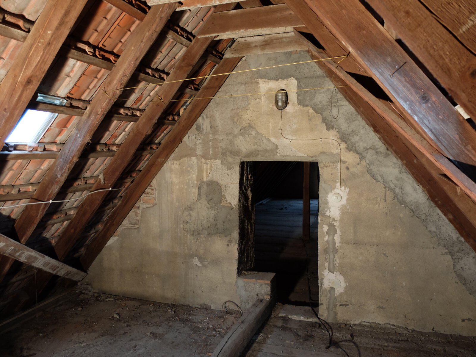 Das Haupthaus und Nebengebäude war bei Ankauf durch unsere Bauherren in einem sehr schlechten Bauzustand- typisch für die 1950-er Jahre waren dunkelbraune Fliesen, abgehängte Holzdecken, kleine Fenster und eine unpraktische und eher beengte Raumaufteilung. Außerdem war das Haus bereits von Schimmel befallen, besaß diverse unterschiedliche Bodenniveaus und eine alte, ausgetretene und marode Treppe, die nicht bestehen bleiben konnte. Dies unter anderem auch aus dem Grund, dass diese im Dachgeschoss nicht genug Kopfhöhe bot.