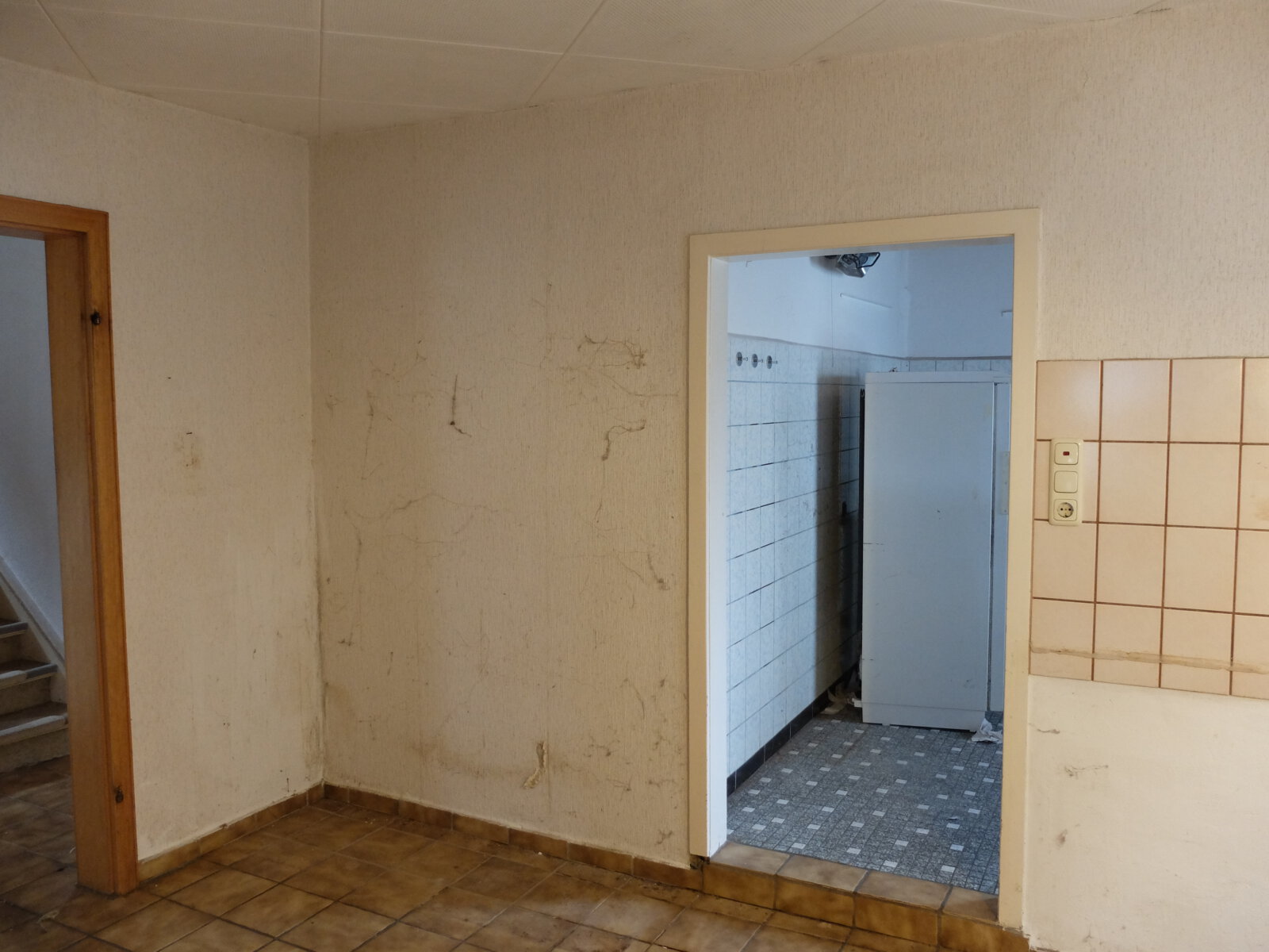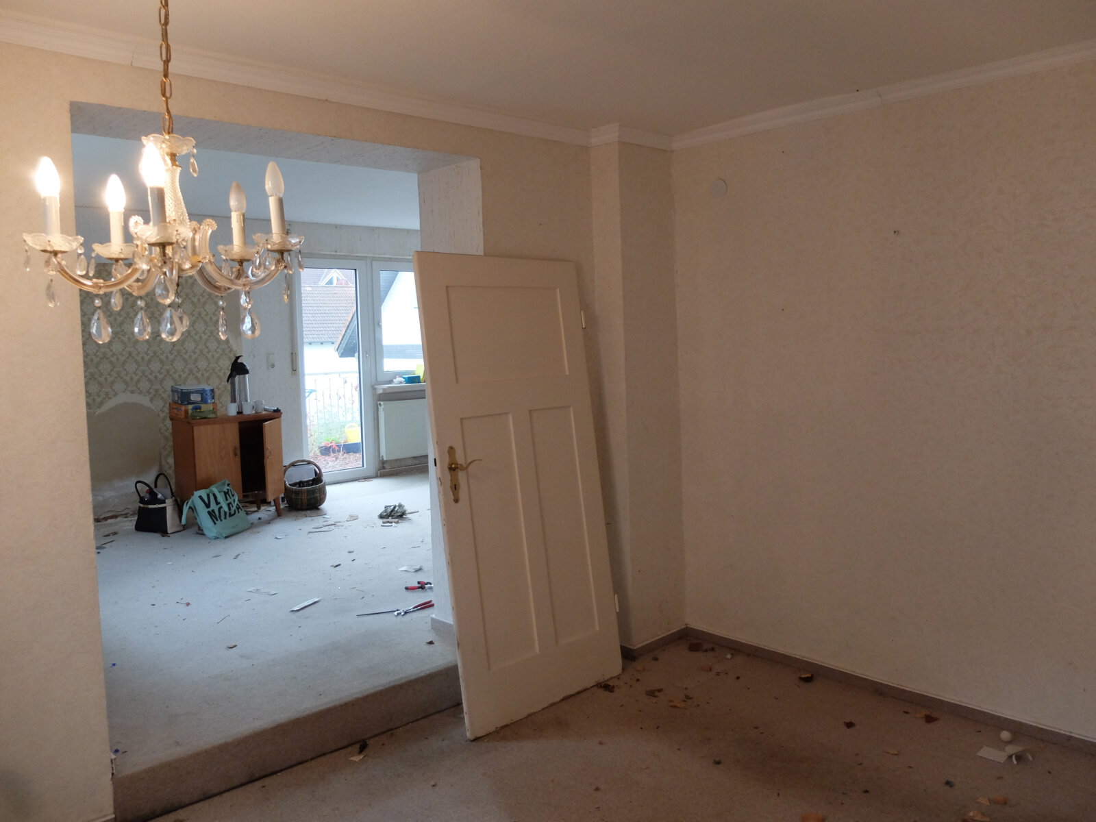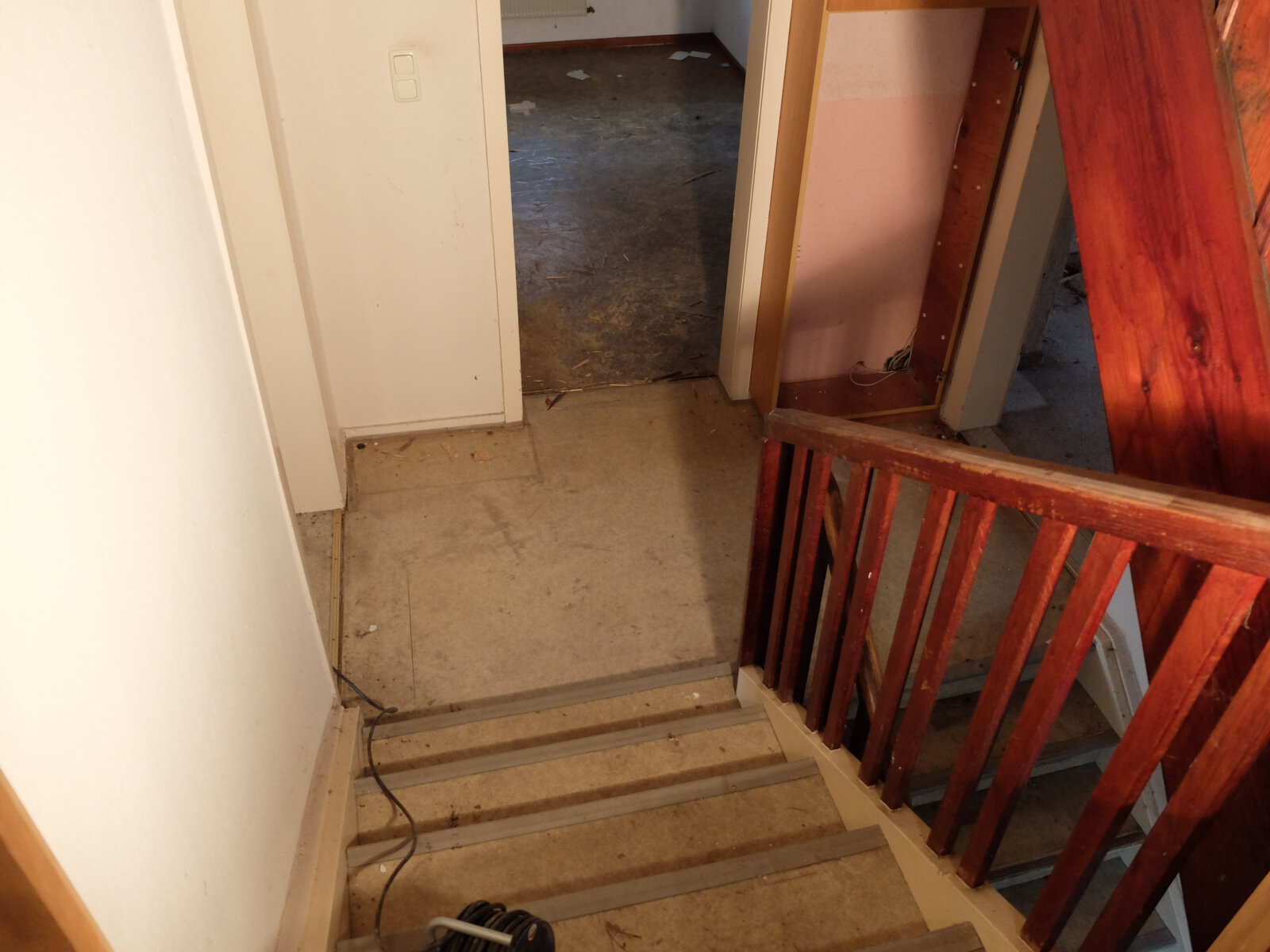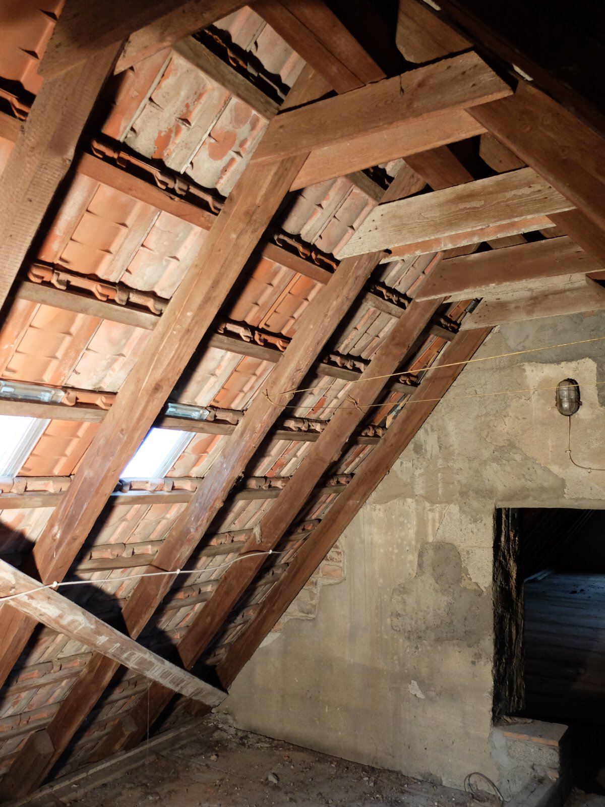 Das Haupthaus und Nebengebäude war bei Ankauf durch unsere Bauherren in einem sehr schlechten Bauzustand- typisch für die 1950-er Jahre waren dunkelbraune Fliesen, abgehängte Holzdecken, kleine Fenster und eine unpraktische und eher beengte Raumaufteilung. Außerdem war das Haus bereits von Schimmel befallen, besaß diverse unterschiedliche Bodenniveaus und eine alte, ausgetretene und marode Treppe, die nicht bestehen bleiben konnte. Dies unter anderem auch aus dem Grund, dass diese im Dachgeschoss nicht genug Kopfhöhe bot.