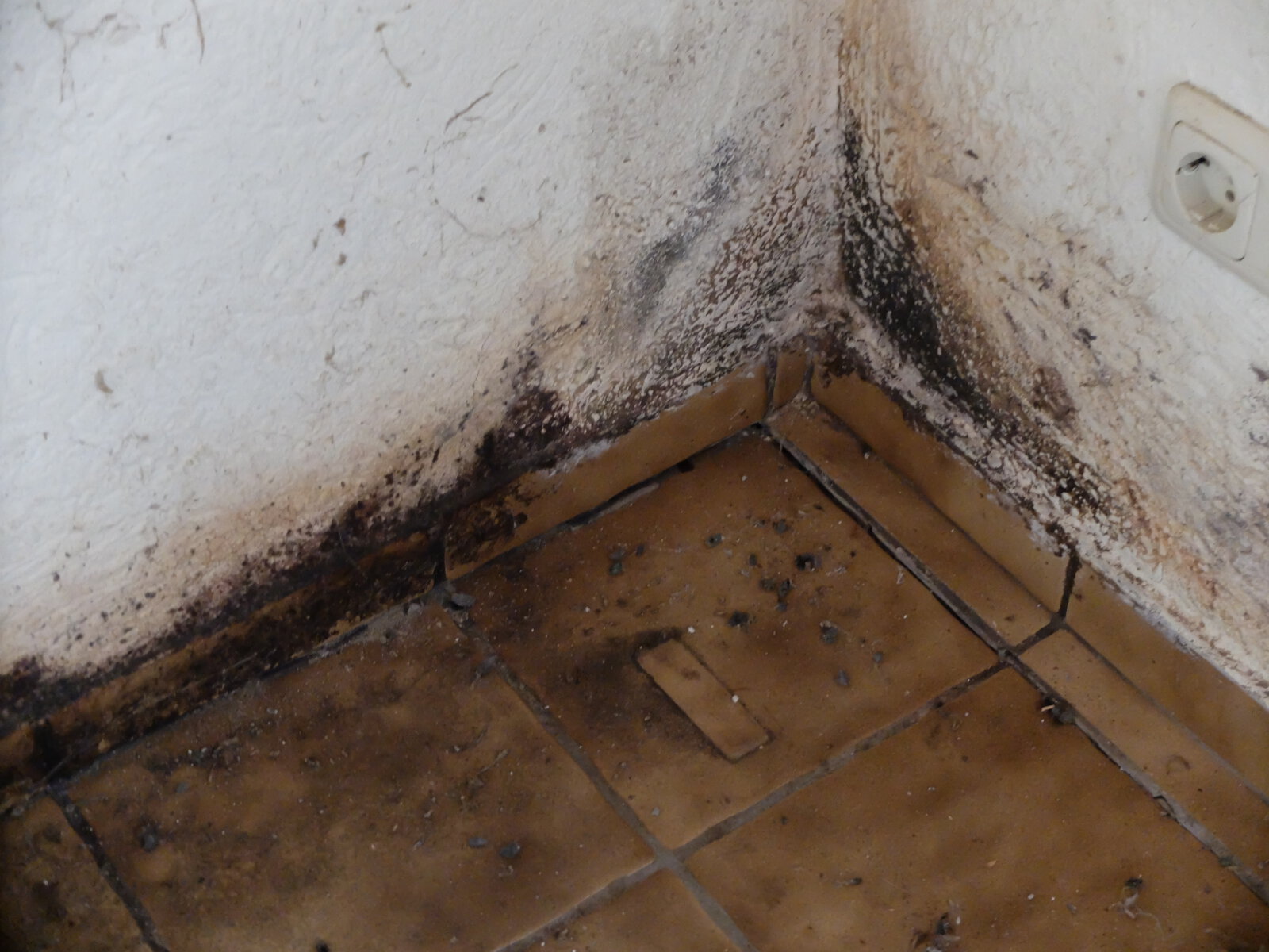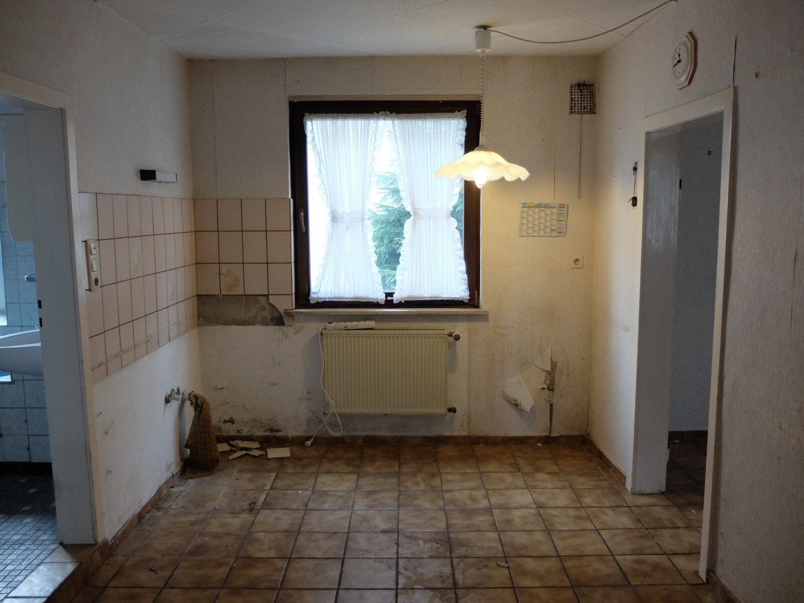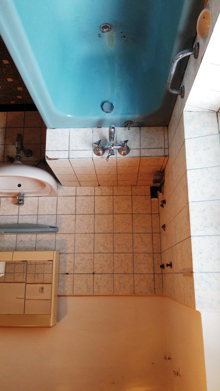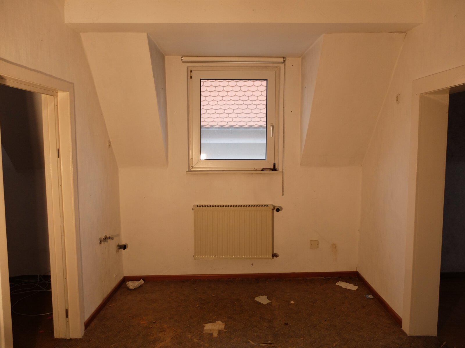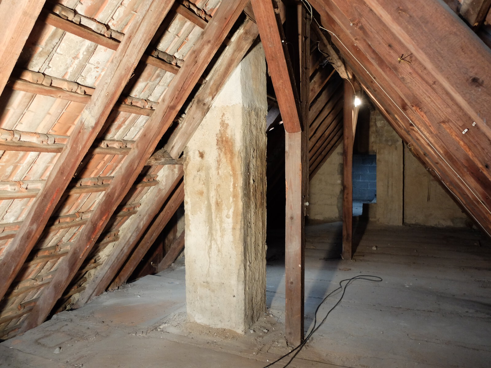 Das Haupthaus und Nebengebäude war bei Ankauf durch unsere Bauherren in einem sehr schlechten Bauzustand- typisch für die 1950-er Jahre waren dunkelbraune Fliesen, abgehängte Holzdecken, kleine Fenster und eine unpraktische und eher beengte Raumaufteilung. Außerdem war das Haus bereits von Schimmel befallen, besaß diverse unterschiedliche Bodenniveaus und eine alte, ausgetretene und marode Treppe, die nicht bestehen bleiben konnte. Dies unter anderem auch aus dem Grund, dass diese im Dachgeschoss nicht genug Kopfhöhe bot.