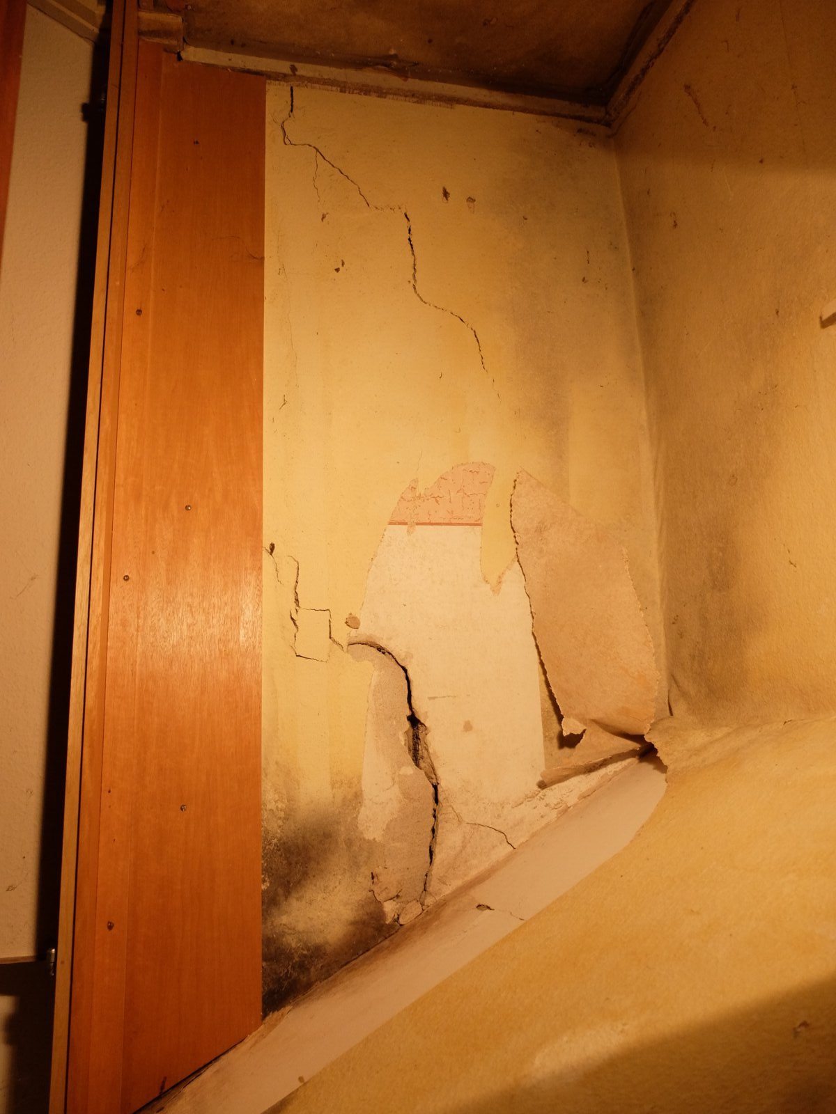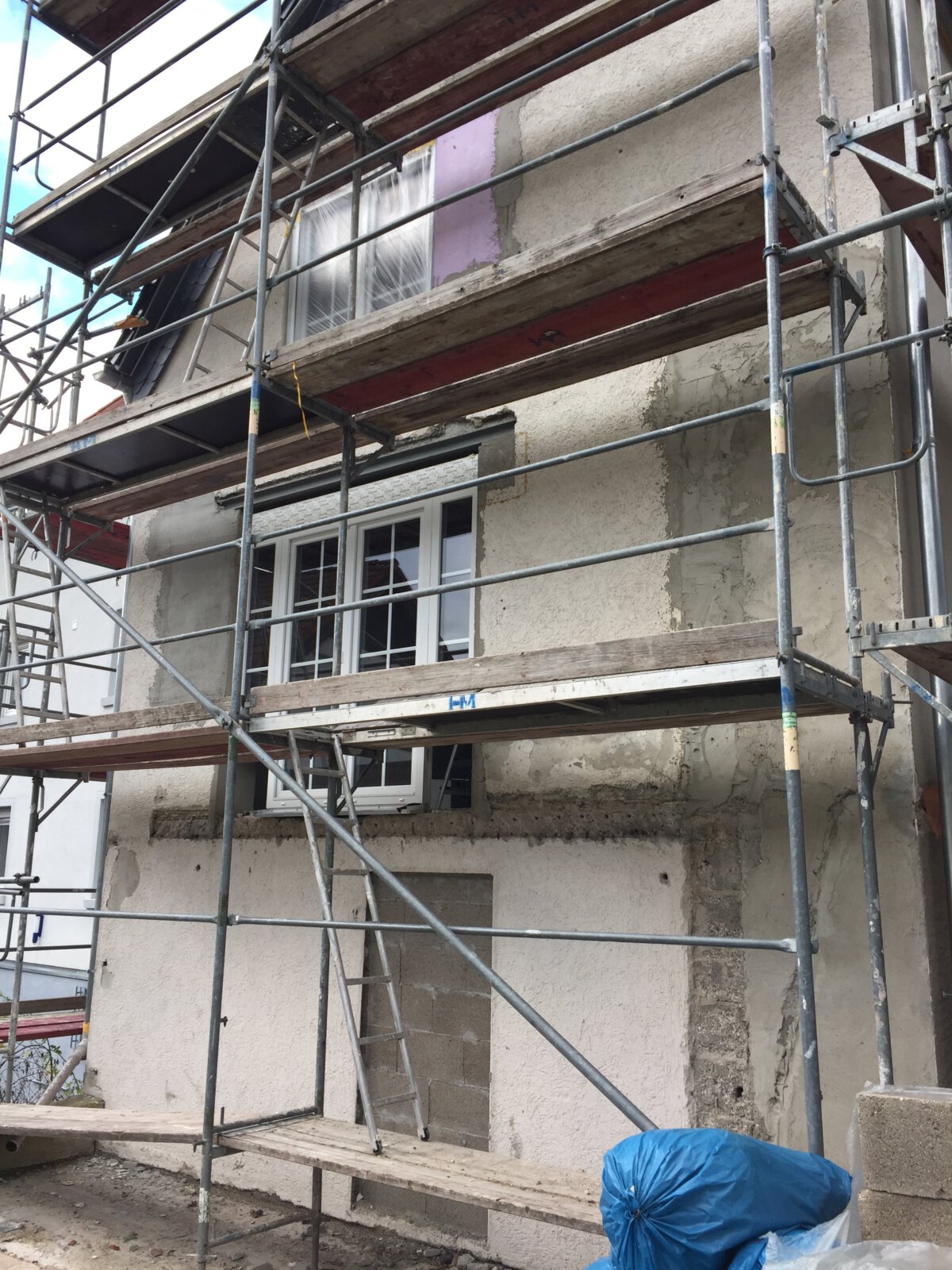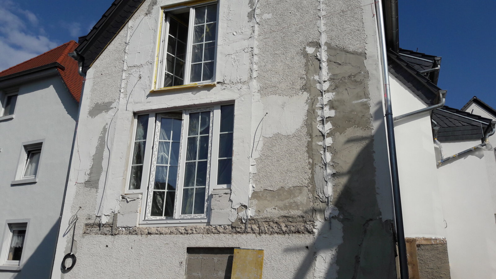 Den größten Sanierungsbedarf wies die Fassade auf- diese hatte vor allem im Eingangsbereich grossflächige Risse, welche nach eingehender Untersuchung durch einen Statiker aus dem raum in form- Netzwerk zum Abriss dieses Bereichs führten, da keine Fundamente vorhanden waren.