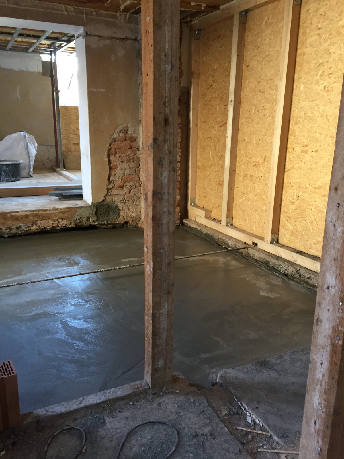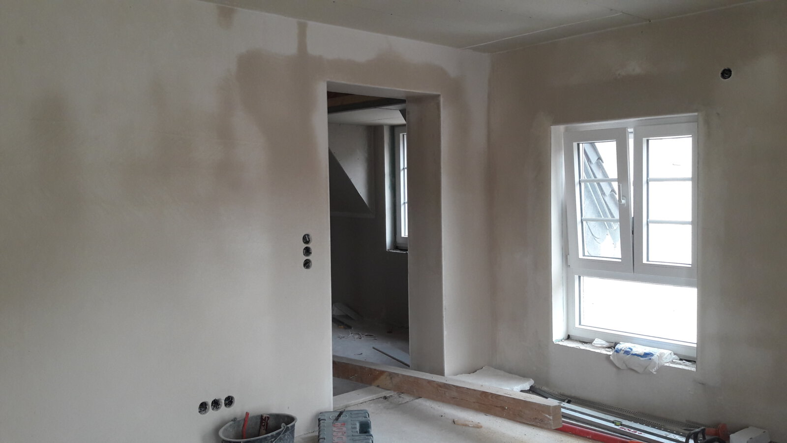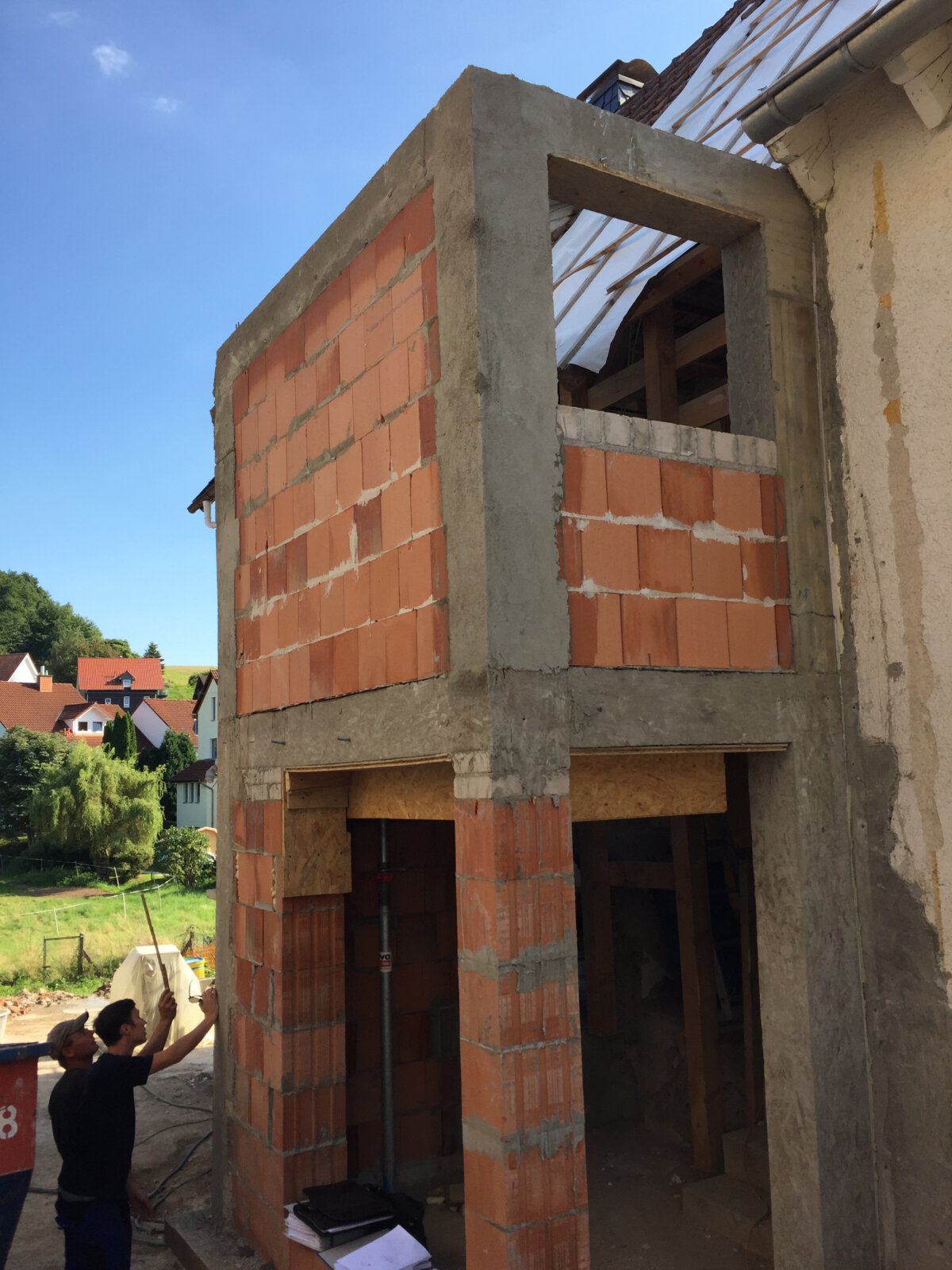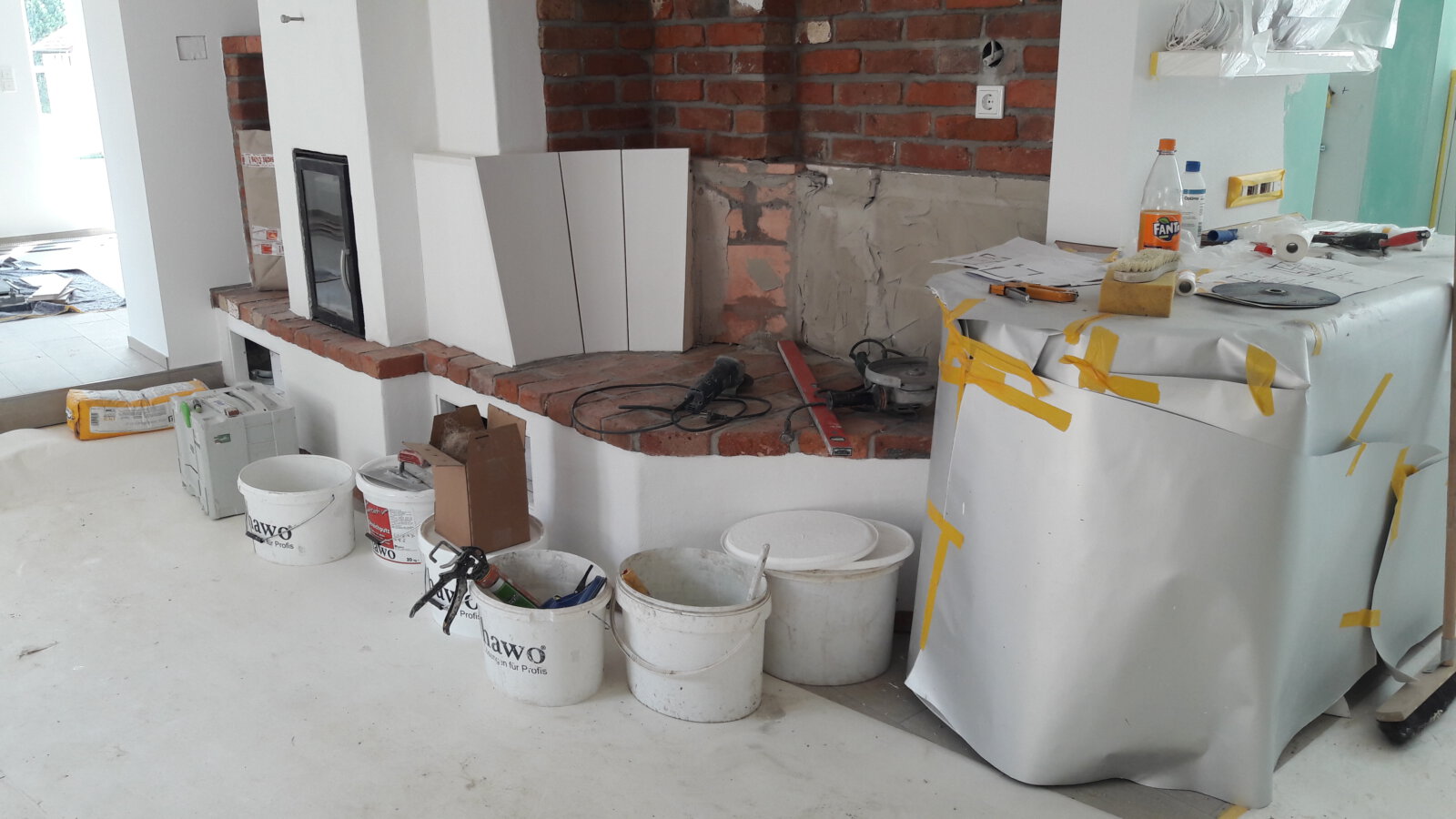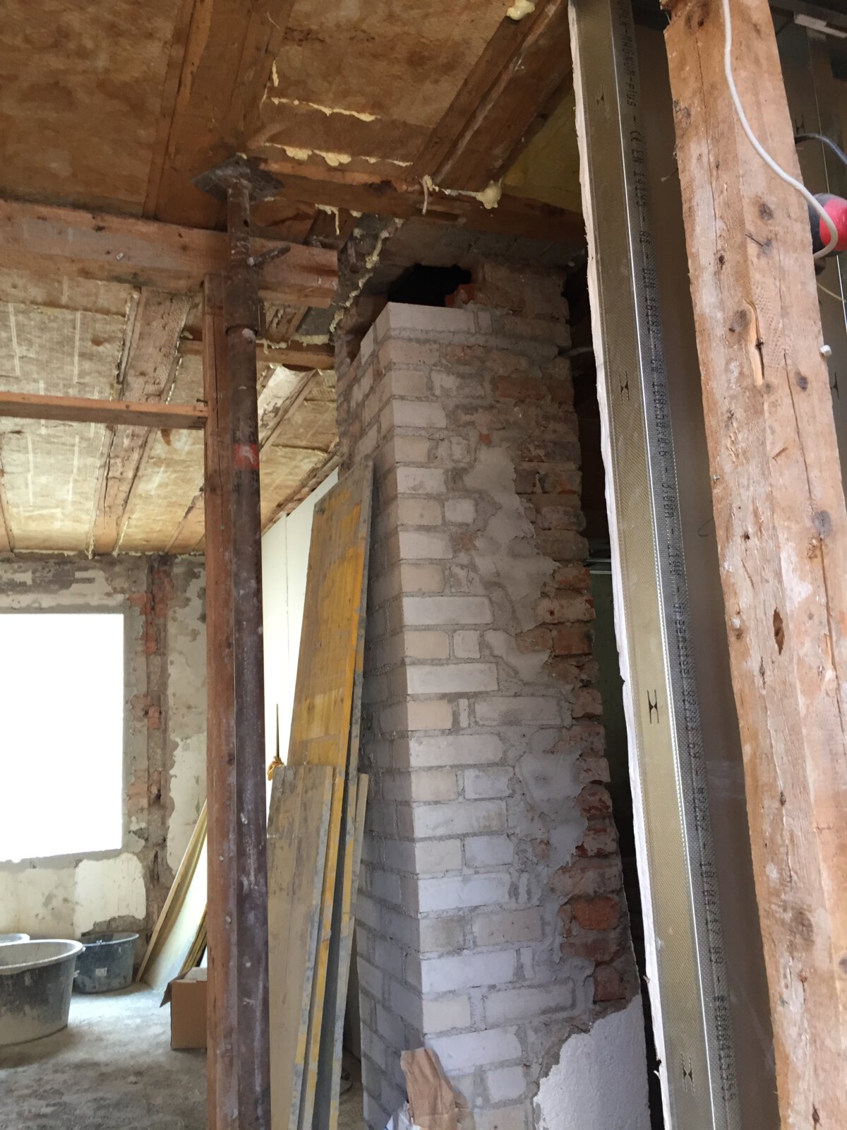 Das Gebäude musste zunächst komplett entkernt werden, um den verschiedenen baulichen Mängel auf den Grund zu gehen und die entsprechend schadhaften Stellen freizulegen. Teilweise waren die Holzdecken so marode, dass komplette Decken ausgetauscht werden mussten- es mussten neue Träger eingezogen werden und Teile der Decken mussten neu ausbetoniert werden. Die bestehende Treppe musste ebenso nach gründlicher statischer Untersuchung durch einen Treppen-Neubau ersetzt werden. Die im Konzept geplanten Fenster wurden nach den Wünschen der Bauherren vergrößert und Brüstungen wurden nach unten versetzt, um mehr Licht in die Räume einfallen zu lassen. Eine weitere Herausforderung stellte der neu zu planende offene Kamin dar, der als Mittelpunkt und Übergang von Küche, Essbereich zum Wohnbereich dienen sollte. Dies fand in Zusammenarbeit mit einem sehr kompetenten Heizungsbauer statt, welcher eine individuelle Lösung präsentierte und umsetzte.