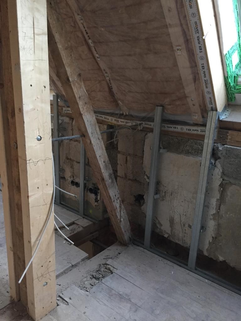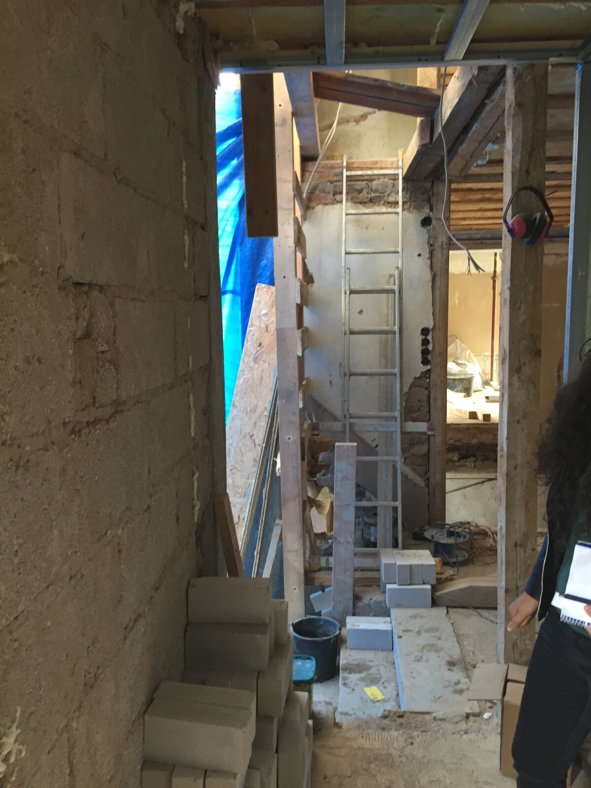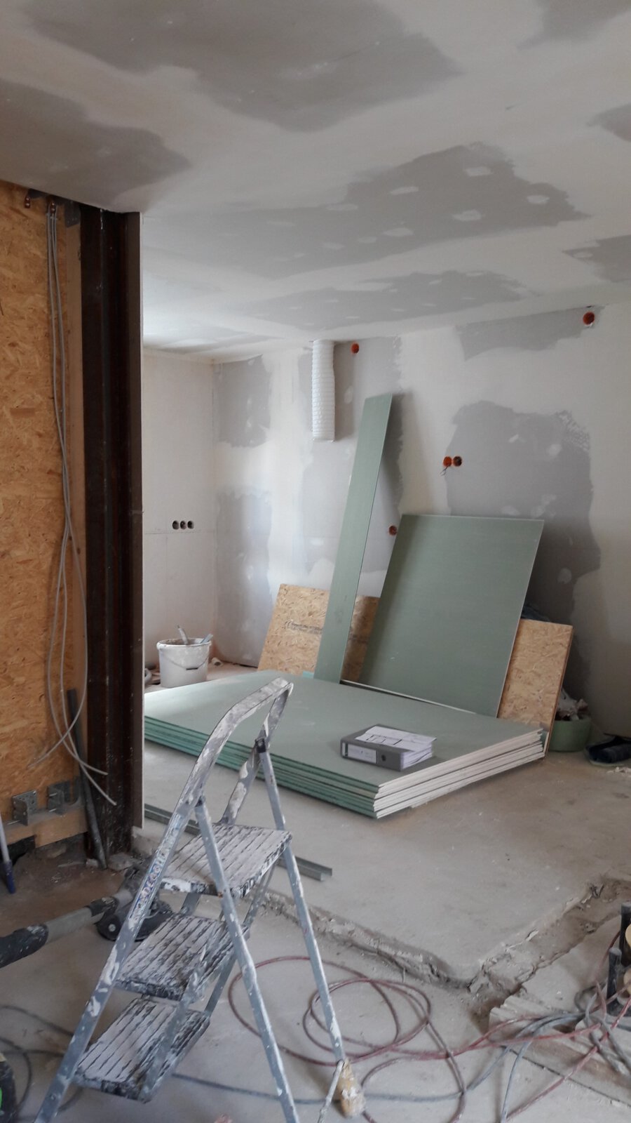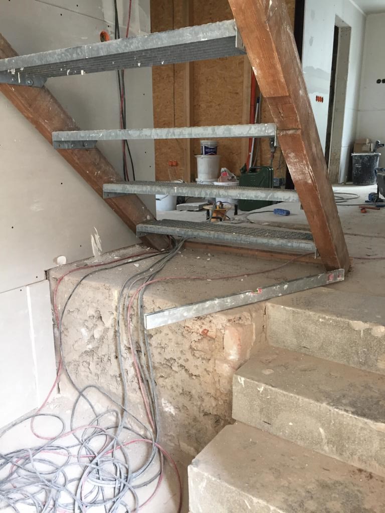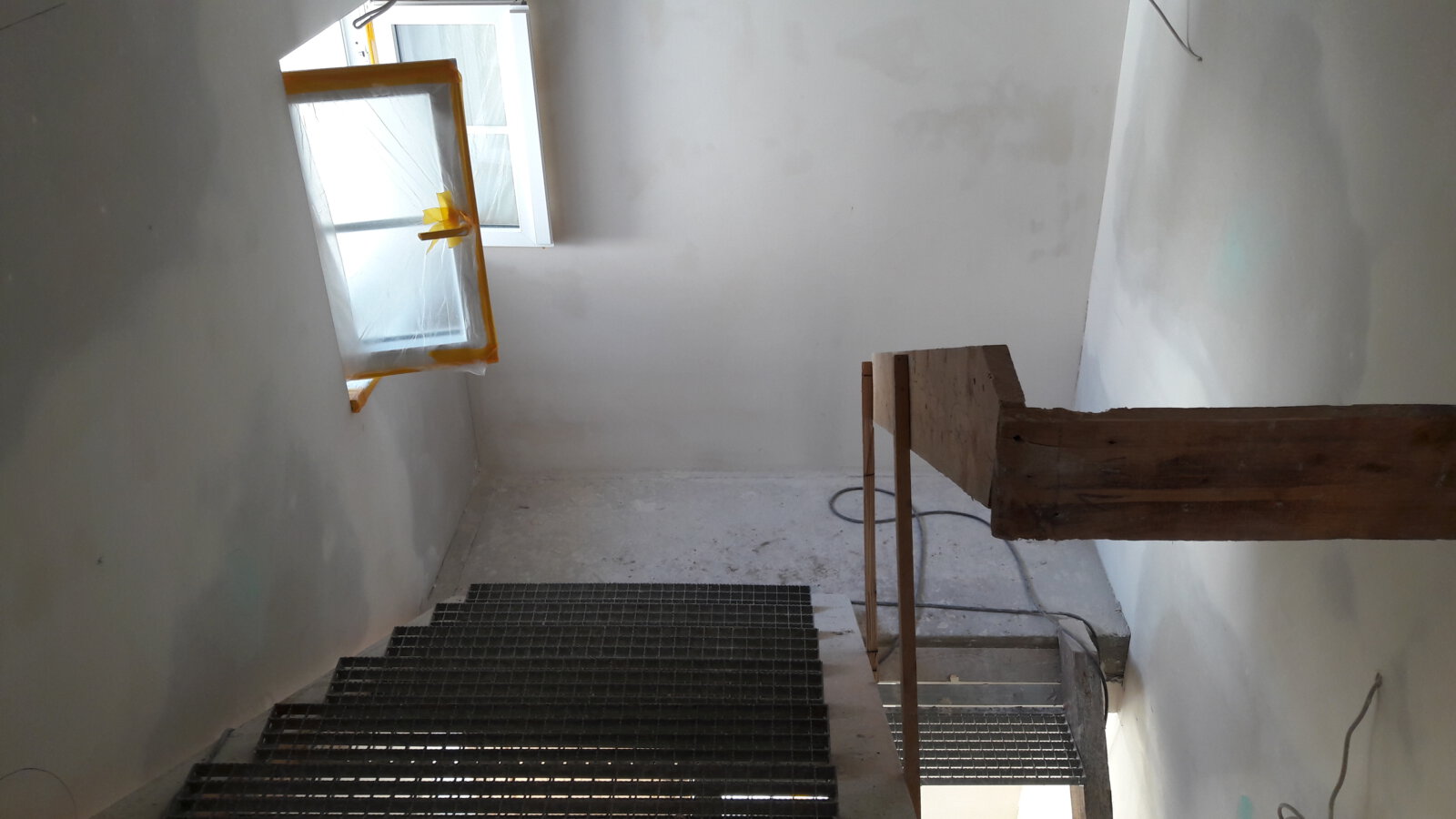 Das Gebäude musste zunächst komplett entkernt werden, um den verschiedenen baulichen Mängel auf den Grund zu gehen und die entsprechend schadhaften Stellen freizulegen. Teilweise waren die Holzdecken so marode, dass komplette Decken ausgetauscht werden mussten- es mussten neue Träger eingezogen werden und Teile der Decken mussten neu ausbetoniert werden. Die bestehende Treppe musste ebenso nach gründlicher statischer Untersuchung durch einen Treppen-Neubau ersetzt werden. Die im Konzept geplanten Fenster wurden nach den Wünschen der Bauherren vergrößert und Brüstungen wurden nach unten versetzt, um mehr Licht in die Räume einfallen zu lassen. Eine weitere Herausforderung stellte der neu zu planende offene Kamin dar, der als Mittelpunkt und Übergang von Küche, Essbereich zum Wohnbereich dienen sollte. Dies fand in Zusammenarbeit mit einem sehr kompetenten Heizungsbauer statt, welcher eine individuelle Lösung präsentierte und umsetzte.