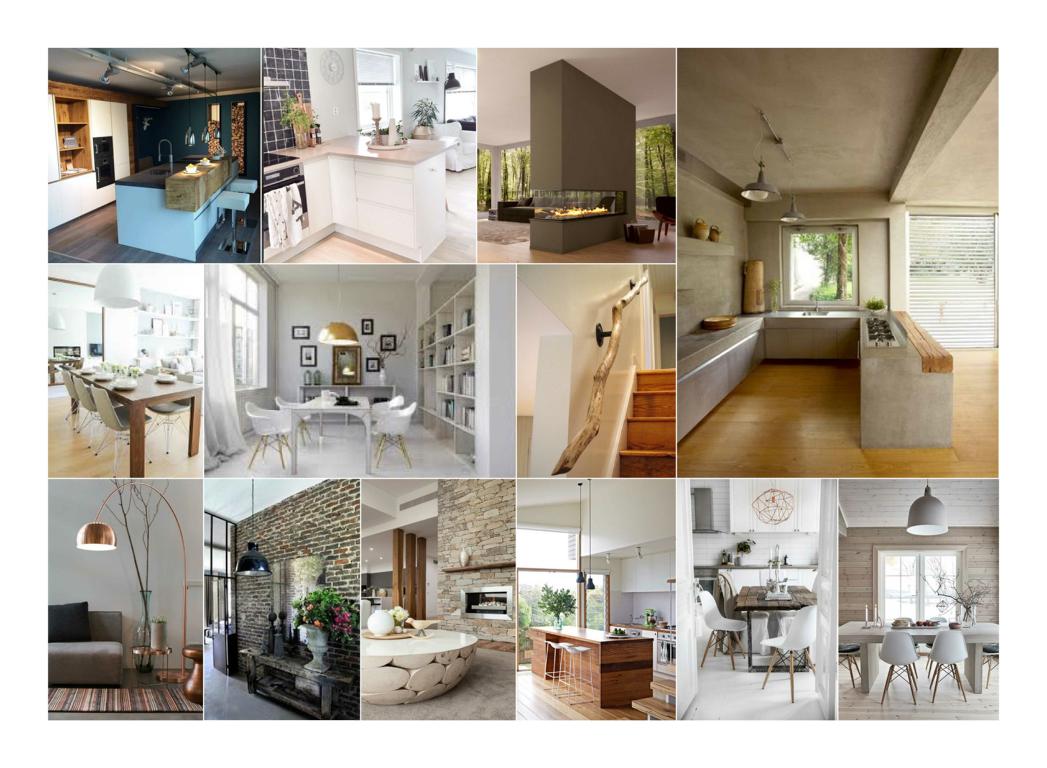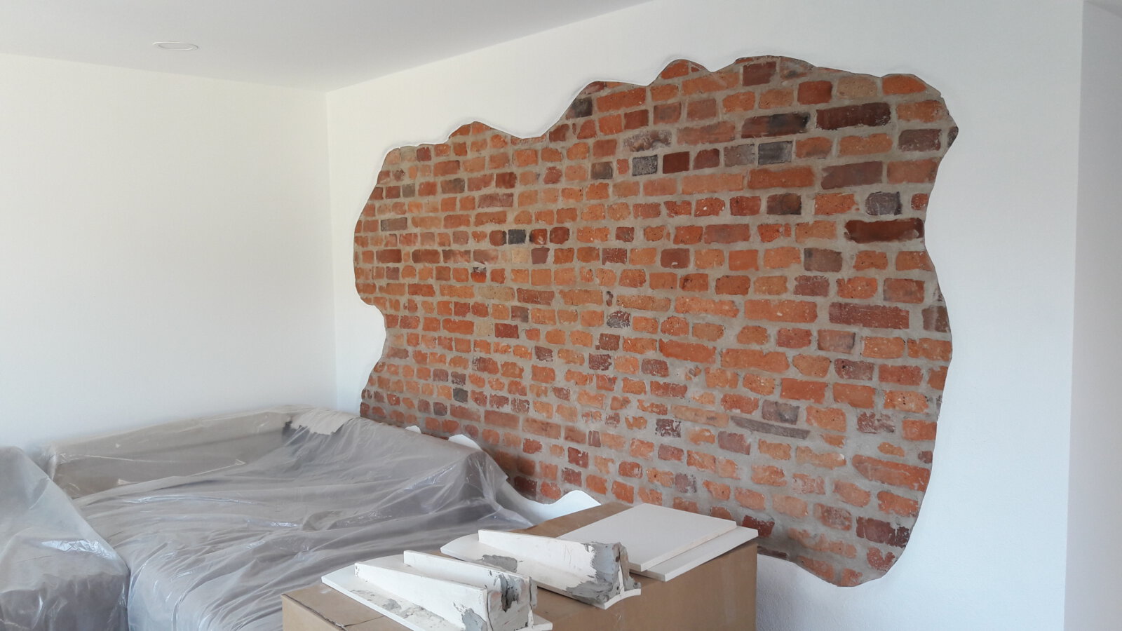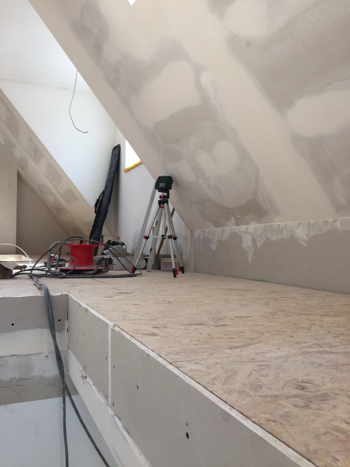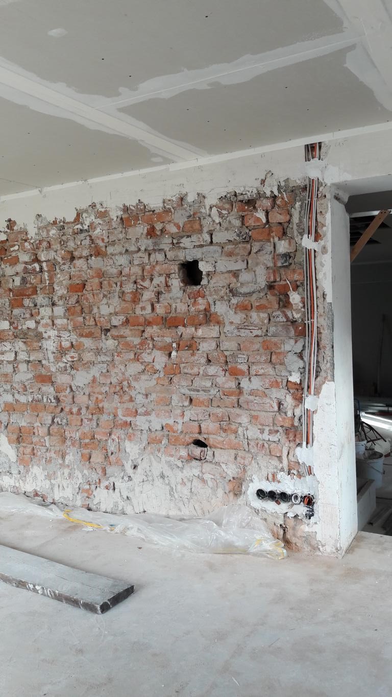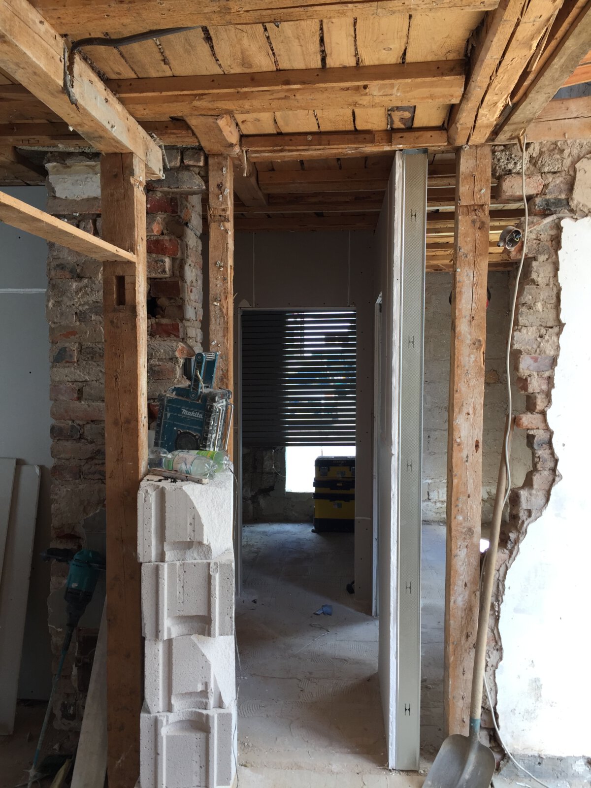 Das Gebäude musste zunächst komplett entkernt werden, um den verschiedenen baulichen Mängel auf den Grund zu gehen und die entsprechend schadhaften Stellen freizulegen. Teilweise waren die Holzdecken so marode, dass komplette Decken ausgetauscht werden mussten- es mussten neue Träger eingezogen werden und Teile der Decken mussten neu ausbetoniert werden. Die bestehende Treppe musste ebenso nach gründlicher statischer Untersuchung durch einen Treppen-Neubau ersetzt werden. Die im Konzept geplanten Fenster wurden nach den Wünschen der Bauherren vergrößert und Brüstungen wurden nach unten versetzt, um mehr Licht in die Räume einfallen zu lassen. Eine weitere Herausforderung stellte der neu zu planende offene Kamin dar, der als Mittelpunkt und Übergang von Küche, Essbereich zum Wohnbereich dienen sollte. Dies fand in Zusammenarbeit mit einem sehr kompetenten Heizungsbauer statt, welcher eine individuelle Lösung präsentierte und umsetzte.
