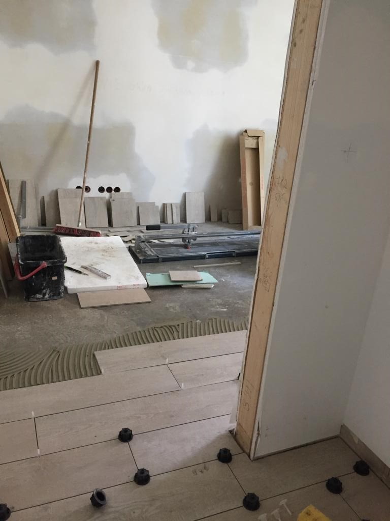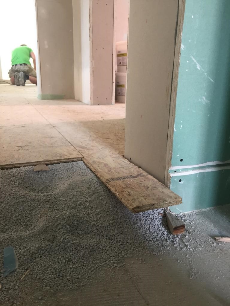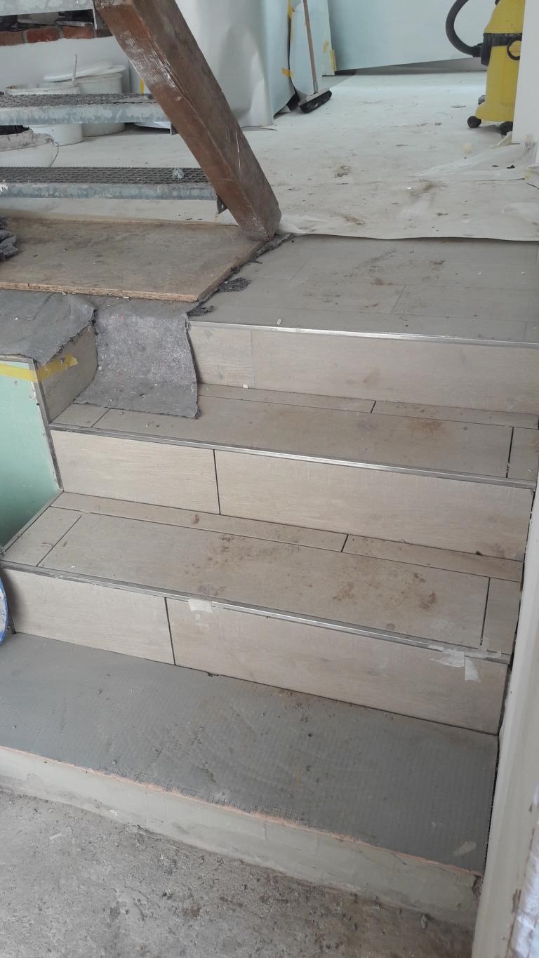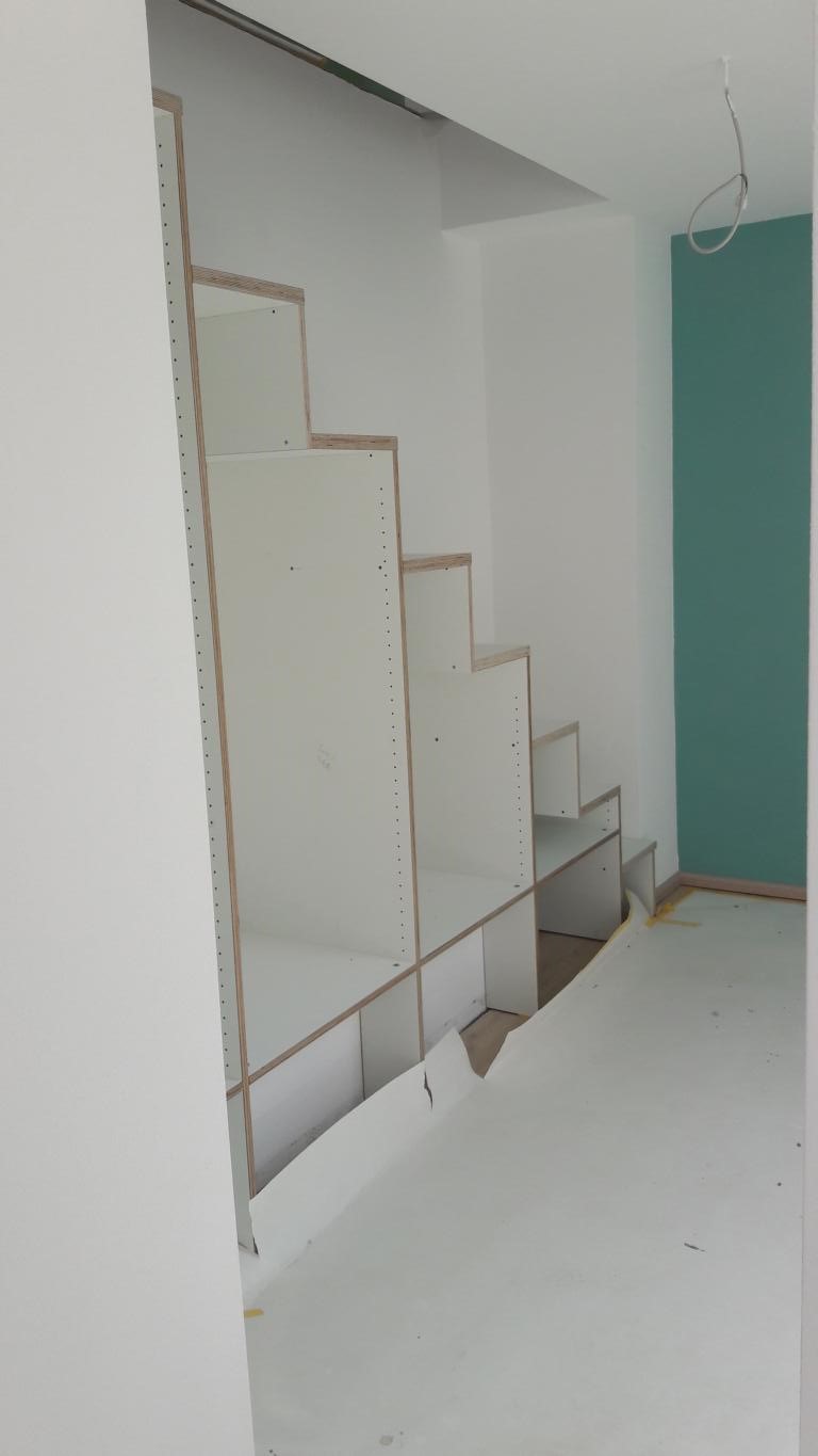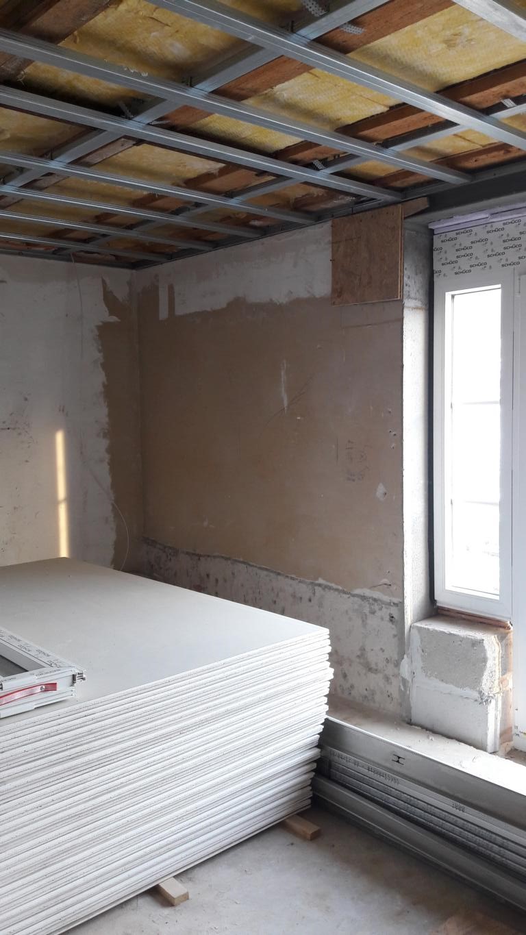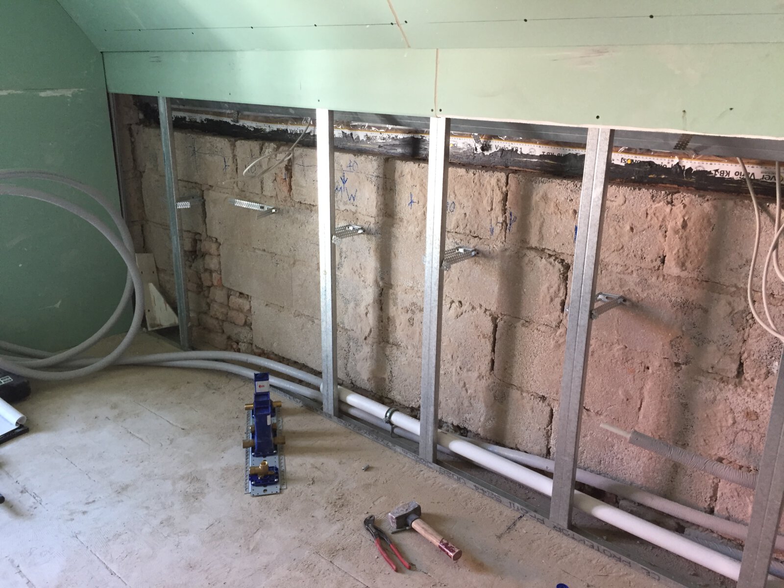 Das Gebäude musste zunächst komplett entkernt werden, um den verschiedenen baulichen Mängel auf den Grund zu gehen und die entsprechend schadhaften Stellen freizulegen. Teilweise waren die Holzdecken so marode, dass komplette Decken ausgetauscht werden mussten- es mussten neue Träger eingezogen werden und Teile der Decken mussten neu ausbetoniert werden. Die bestehende Treppe musste ebenso nach gründlicher statischer Untersuchung durch einen Treppen-Neubau ersetzt werden. Die im Konzept geplanten Fenster wurden nach den Wünschen der Bauherren vergrößert und Brüstungen wurden nach unten versetzt, um mehr Licht in die Räume einfallen zu lassen. Eine weitere Herausforderung stellte der neu zu planende offene Kamin dar, der als Mittelpunkt und Übergang von Küche, Essbereich zum Wohnbereich dienen sollte. Dies fand in Zusammenarbeit mit einem sehr kompetenten Heizungsbauer statt, welcher eine individuelle Lösung präsentierte und umsetzte.