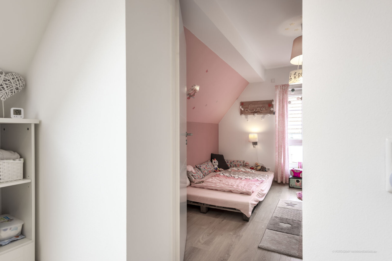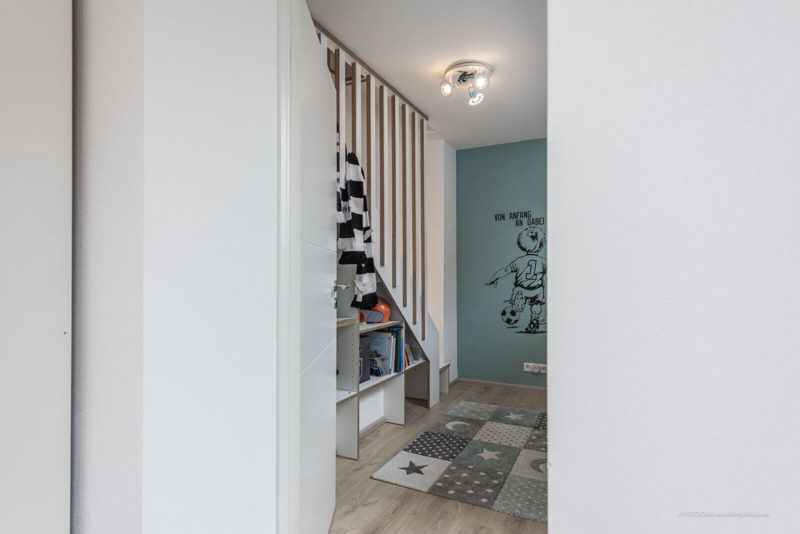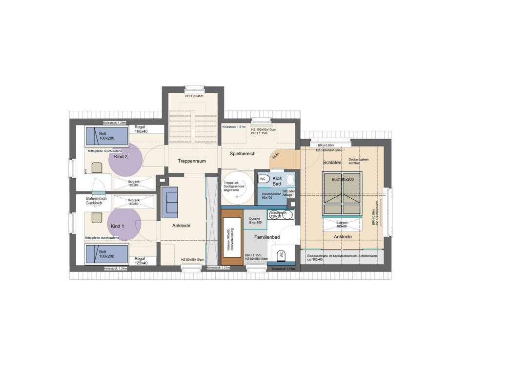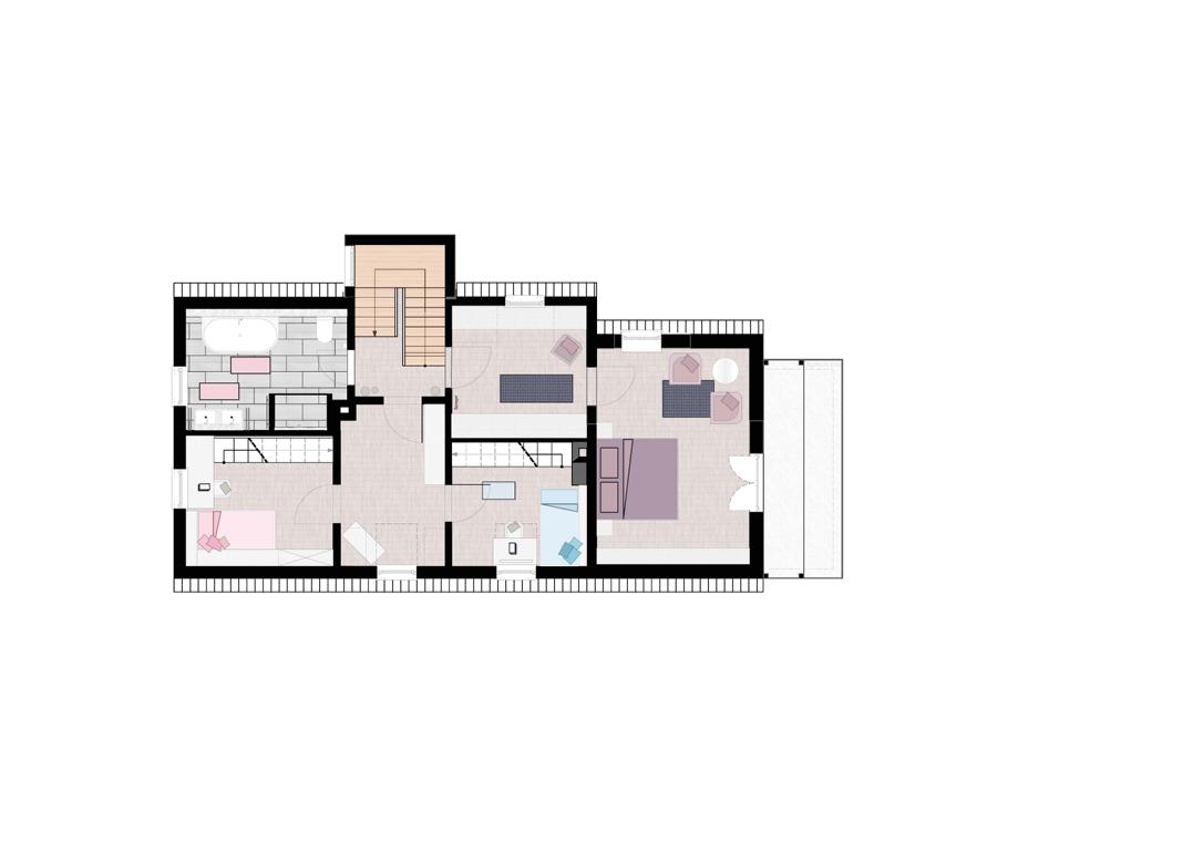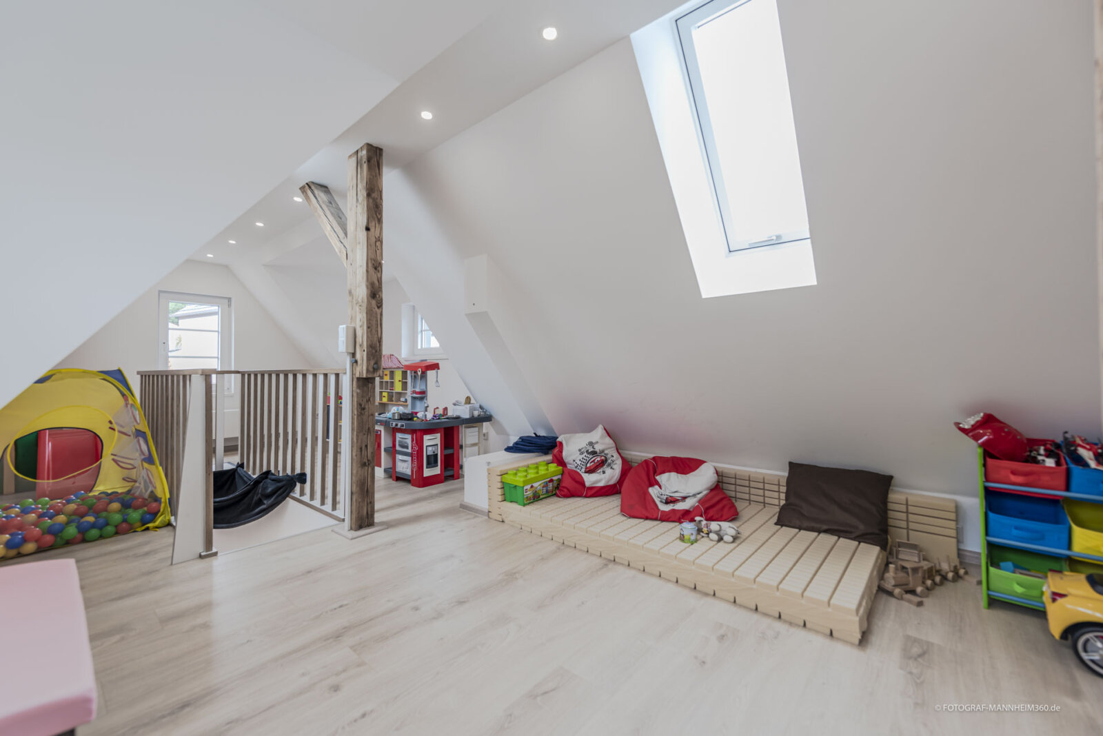 Über die neue Treppenanlage ist das Obergeschoss, in welchem sich die Privaträume der Familie befinden, zu erreichen. Nach mehreren ideenreichen Konzeptvorschlägen und Anpassungen des raum in form- Planungsteams in Kombination mit den Wünschen und Ideen der Bauherren bezüglich der Planung des Obergeschosses, entschlossen sich die Bauherren, die Schlafräume in Richtung der ruhigen Gartenseite an der Rückseite des Gebäudes vorzusehen. Das Master-Schlafzimmer erreicht man durch das weiträumige Ankleidezimmer der Bauherren. Ebenfalls zur Gartenseite gerichtet, befinden sich die beiden Kinderzimmer, welche über ein gemeinsames Spielzimmer erreicht werden. In diesem Vorraum befindet sich auch ein nützlicher Wäscheabwurf, der direkt in den Hauswirtschaftsraum führt. Die Besonderheit der Kinderzimmer besteht darin, dass über ein Treppenaufgang, der von beiden Zimmern zu erreichen ist, das neu ausgebaute Dachgeschoss erschlossen werden kann. Hier befindet sich eine Spieloase für die beiden Jüngsten. Ursprünglich war eine weitere Treppe über das Master-Schlafzimmer in das Dachgeschoss geplant, um Staumöglichkeiten zu schaffen. Allerdings entschied die Bauherrin, diesen Bereich ihren Kindern zu überlassen. Auf der Obergeschossebene befindet sich neben den Schlafzimmern der Familie auch das luxuriöse Master-Badezimmer, welches von allen Familienmitgliedern gemeinsam genutzt wird.