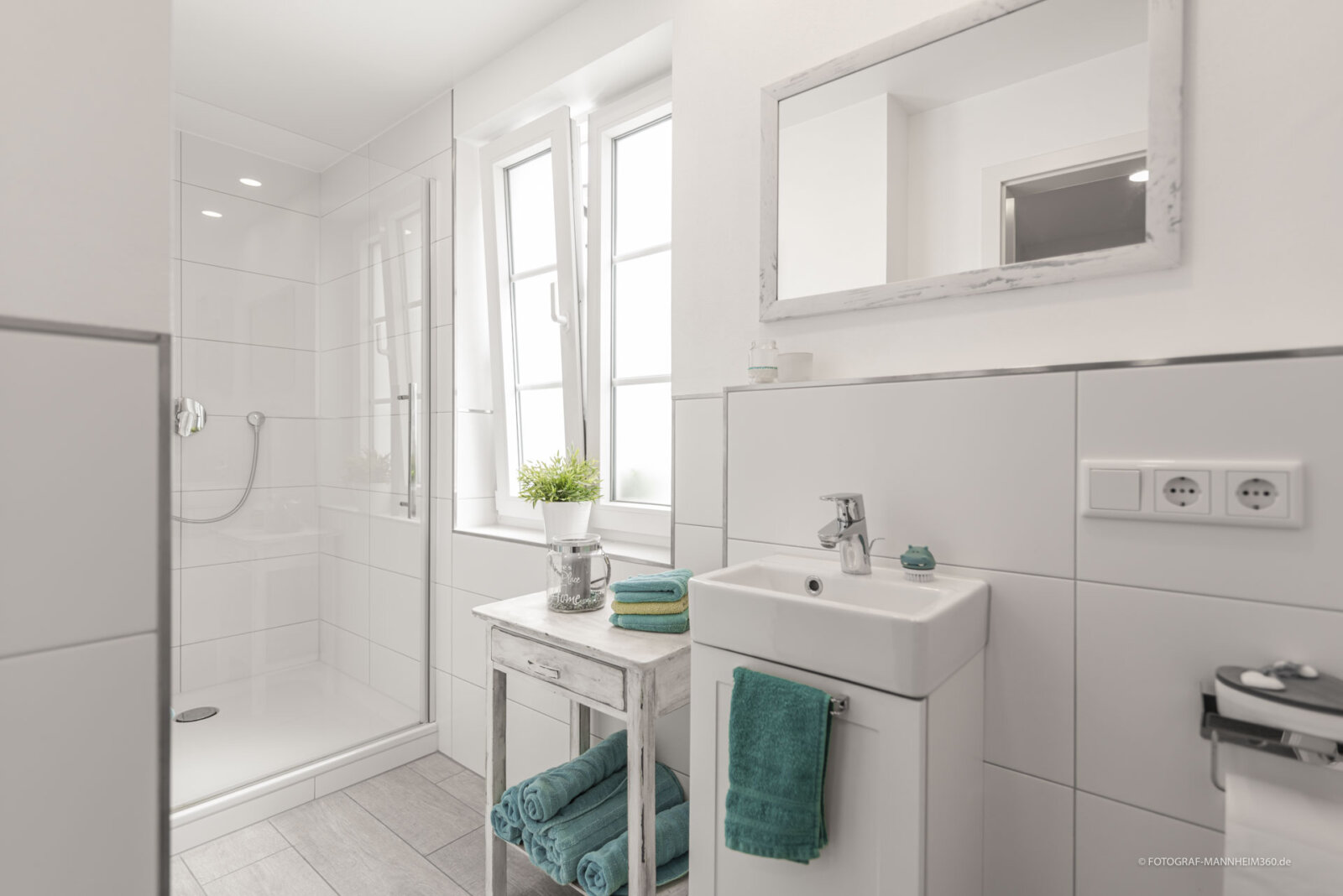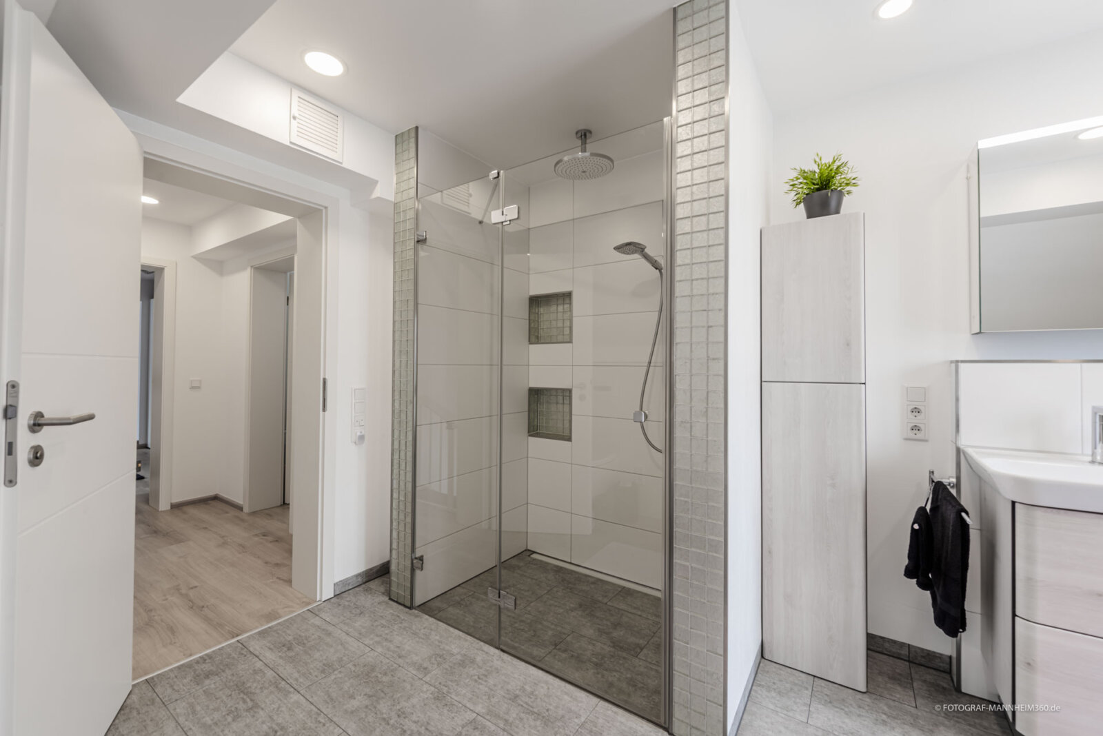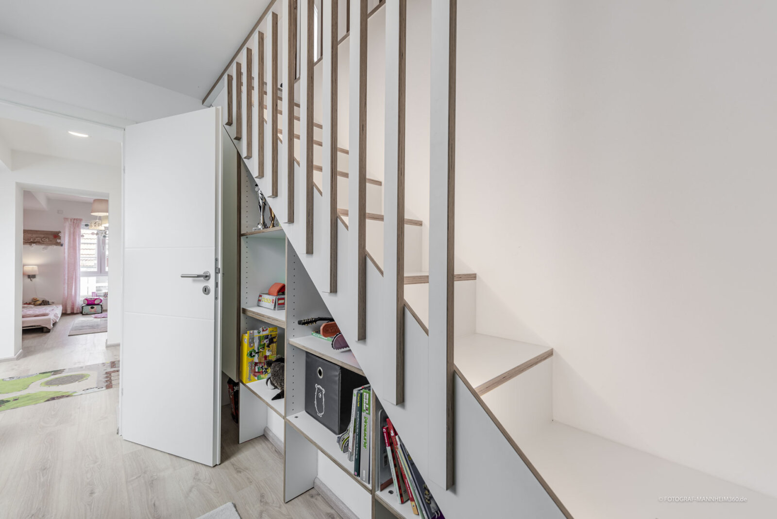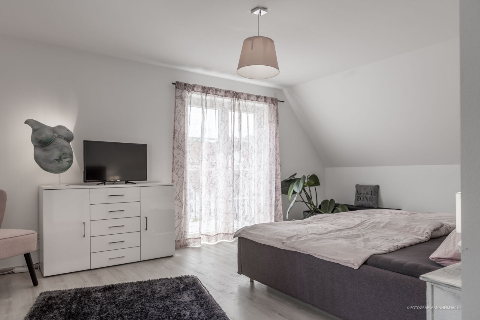 Über die neue Treppenanlage ist das Obergeschoss, in welchem sich die Privaträume der Familie befinden, zu erreichen. Nach mehreren ideenreichen Konzeptvorschlägen und Anpassungen des raum in form- Planungsteams in Kombination mit den Wünschen und Ideen der Bauherren bezüglich der Planung des Obergeschosses, entschlossen sich die Bauherren, die Schlafräume in Richtung der ruhigen Gartenseite an der Rückseite des Gebäudes vorzusehen. Das Master-Schlafzimmer erreicht man durch das weiträumige Ankleidezimmer der Bauherren. Ebenfalls zur Gartenseite gerichtet, befinden sich die beiden Kinderzimmer, welche über ein gemeinsames Spielzimmer erreicht werden. In diesem Vorraum befindet sich auch ein nützlicher Wäscheabwurf, der direkt in den Hauswirtschaftsraum führt. Die Besonderheit der Kinderzimmer besteht darin, dass über ein Treppenaufgang, der von beiden Zimmern zu erreichen ist, das neu ausgebaute Dachgeschoss erschlossen werden kann. Hier befindet sich eine Spieloase für die beiden Jüngsten. Ursprünglich war eine weitere Treppe über das Master-Schlafzimmer in das Dachgeschoss geplant, um Staumöglichkeiten zu schaffen. Allerdings entschied die Bauherrin, diesen Bereich ihren Kindern zu überlassen. Auf der Obergeschossebene befindet sich neben den Schlafzimmern der Familie auch das luxuriöse Master-Badezimmer, welches von allen Familienmitgliedern gemeinsam genutzt wird.