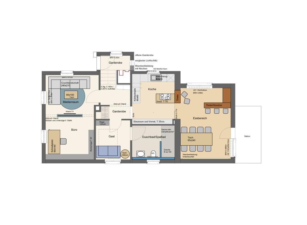 raum in form hatte bereits bei der ersten Vorort-Begehung den Bauherren erste Ideen unterbreitet, wie die zukünftige Nutzung und der benötigte Raumbedarf der jungen Familie in dem Objekt realisiert werden könnte, woraus dann – auch in Einbeziehung des großen Gartengrundstücks, auf dem ebenfalls Freiplätze, Terrassen und Balkone entstanden – mehrere Nutzungskonzepte erarbeitet wurden.