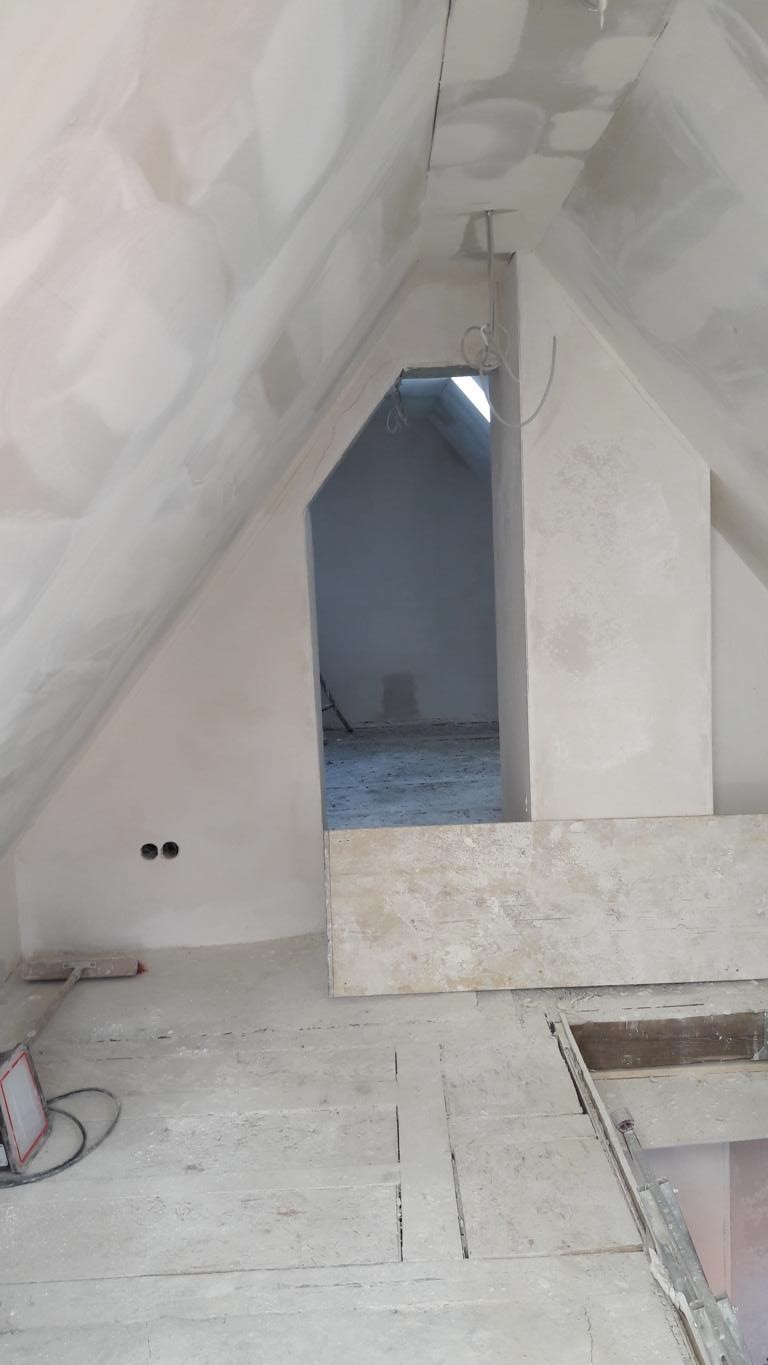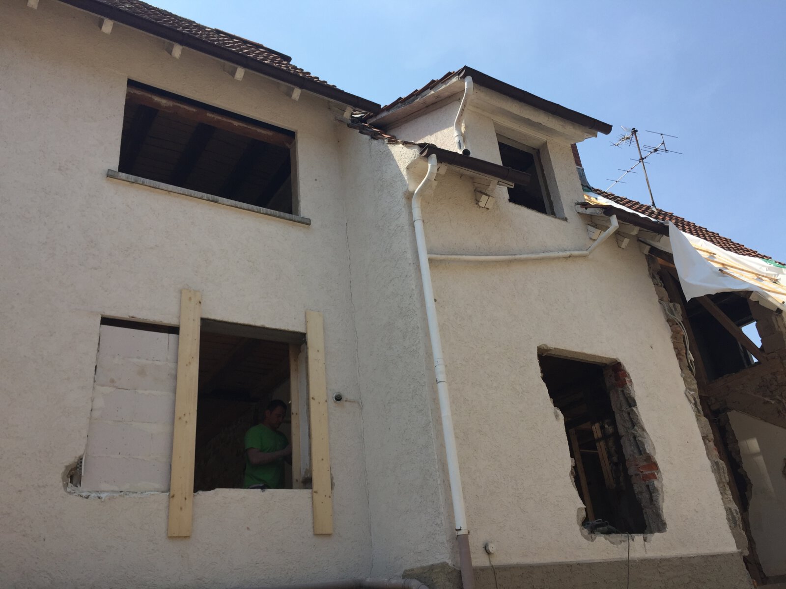 Die im Dachgeschoss bereits vorhandenen Gauben, das gesamte Dachgebälk inklusive der Ziegel waren in einem so schlechten Zustand, dass beschlossen wurde, den Dachstuhl komplett neu zubauen, die Gauben zu erneuern und deren Platzierung zu optimieren. Die zu kleinen Fenster im gesamten Objekt waren ebenfalls in einem sehr schlechten Zustand und wurden komplett durch neue und größere Fenster ersetzt. Die durch raum in form entwickelte Neukonzeption des Hauses sah vor, verschiedene Wände zu entfernen und durch statische Ersatzmaßnahmen, wie dem Einbau mehrerer Unterzüge zu ersetzen , sodass ein offenes und zeitgemäßes Raumszenario geschaffen werden konnte.