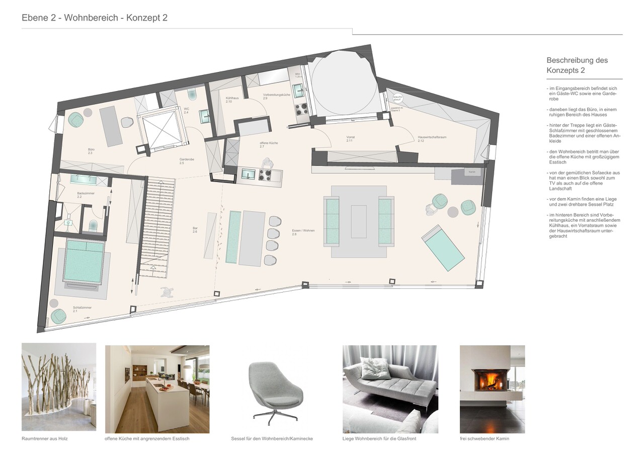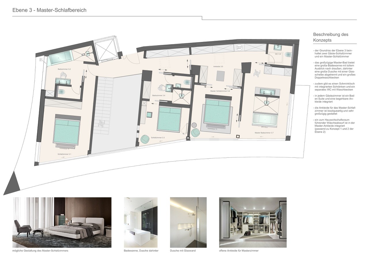 Auf Grundlage der örtlichen Gegebenheiten, Ihres zur Verfügung stehenden Budgets, Ihrer Vorstellungen und Wünsche, erarbeitet das Projektteam mehrere Konzeptvarianten für die verschiedenen Bereiche und Geschosse des zu erstellenden oder zu modernisierenden Objekts. Aufgrund der Qualifikation und der Erfahrung, gepaart mit Talent und kreativem ganzheitlichen Denken und vor allem aufgrund der Leidenschaft jedes Einzelnen unseres Teams für seine Berufung, ist das jeweilige Projektteam in der Lage, Ihnen innerhalb nur weniger Wochen nach Projektstart die ersten Konzeptentwürfe zu präsentieren und gemeinsam mit Ihnen ausführlich zu besprechen.