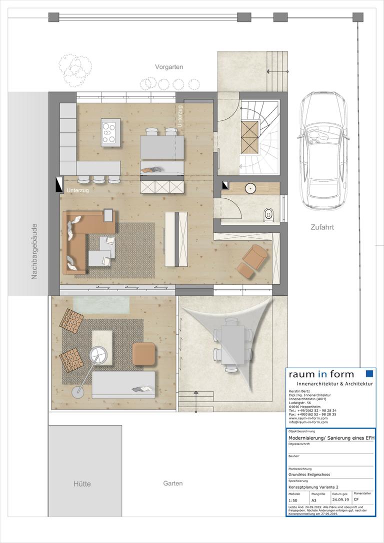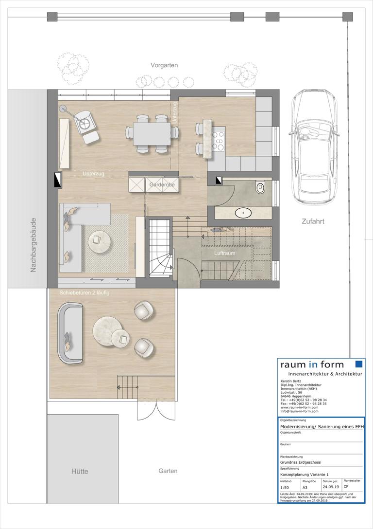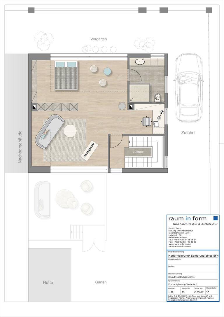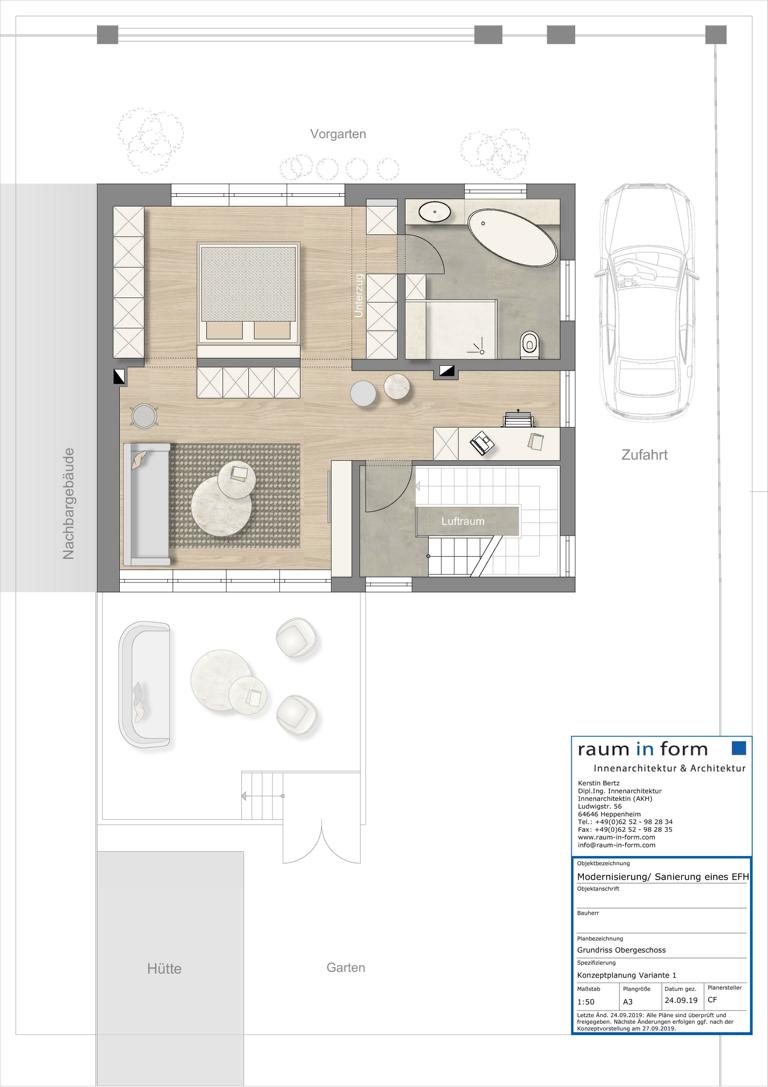 Nach der Auftragserteilung, die z. B. in einem ersten Schritt die Grundlagenerarbeitung (zu der z. B. erste Gespräche mit den genehmigungsrelevanten Behörden wie dem Bauamt gehören) sowie ein Aufmaß des Bestandsgebäudes oder des zu bebauenden Grundstücks umfassen kann, beginnt das meist mehrköpfige Projektteam unter der Leitung eines erfahrenen Architekten oder Innenarchitekten mit der Entwicklung verschiedener Konzeptionen.