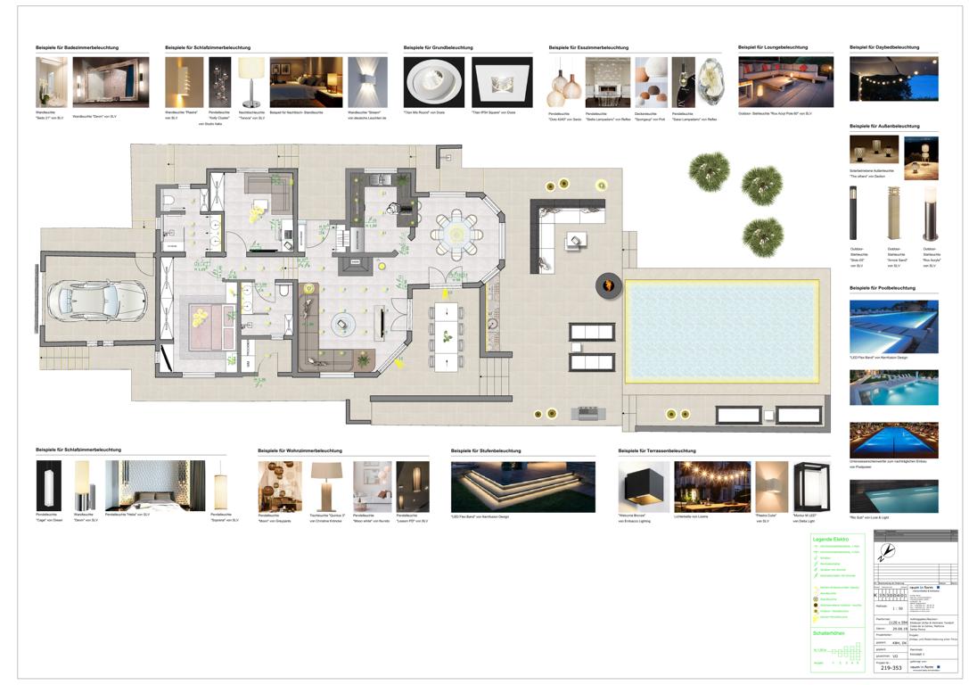 Auf Basis der mit Ihnen abgestimmten finalen Konzeptlanungen entwickeln wir für Sie ganzheitliche Beleuchtungskonzepte unter Berücksichtigung aller neuesten Entwicklungen und Technologien, insbesondere in Bezug auf innovative und energiesparende Lösungen. Die Beleuchtungs- und Elektroplanungen sind dann Grundlage für die weiteren Planungen und unsere Smart- Home Konzepte.