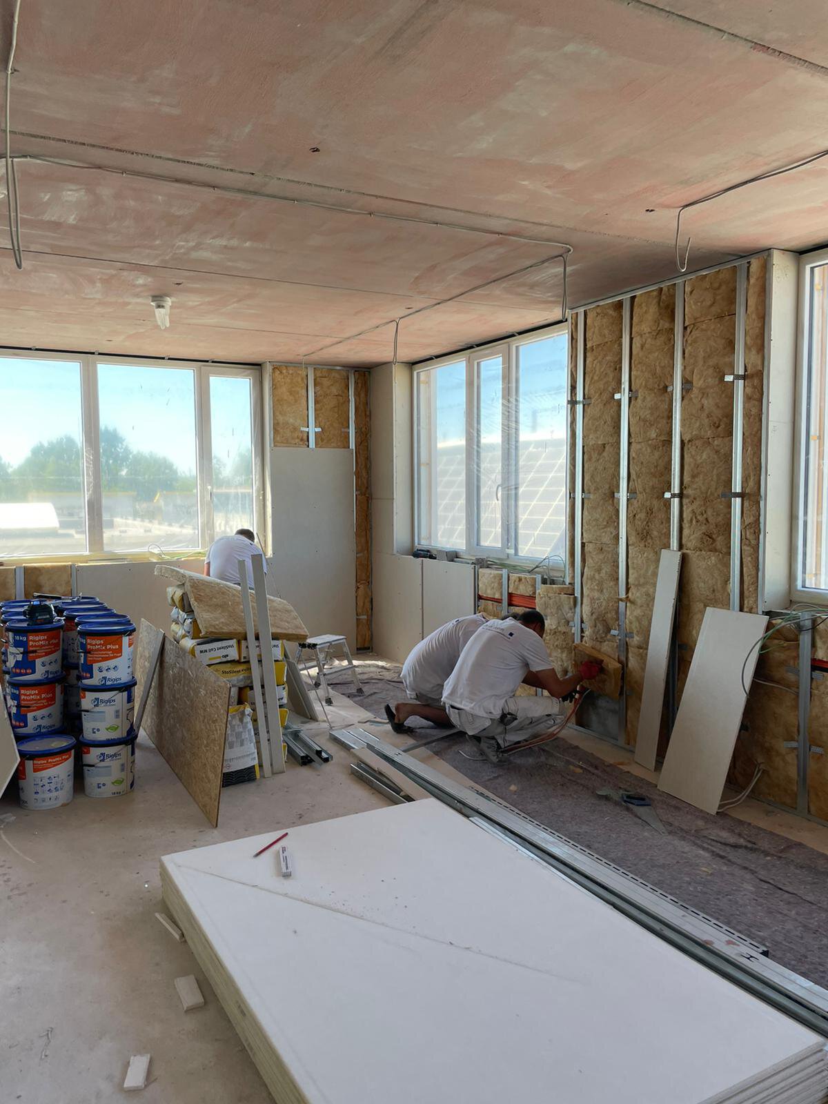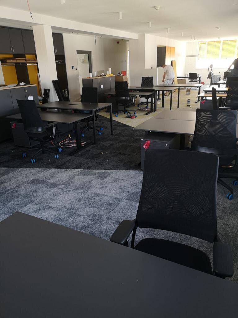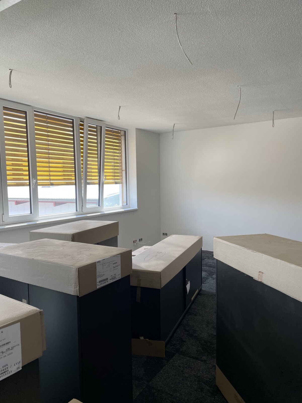 Sämtliche Bauleistungen wurden innerhalb des vor Baubeginn erarbeiteten engmaschigen Bauzeitenplans erbracht- das Objekt wurde nach Fertigstellung der Bauleistungen in den letzten zwei Wochen von raum in form- Objekteinrichtungen unter der Leitung der Unternehmensinhaberin, der Innenarchitektin Kerstin Bertz- Helmbrecht, komplett neu eingerichtet. Sämtliches neues Mobiliar wurde frühzeitig ausgewählt, bestellt und in das raum in form- Zentrallager in Heppenheim geliefert, so dass die Lieferung und Einrichtung des 1. Bauabschnitts des Bürogebäudes ohne jegliche Verzögerungen direkt nach Fertigstellung der Baumaßnahmen erfolgen konnte und die Büros zwei Wochen vor dem geplanten Einzugstermin im September 2022 bezogen werden konnten.