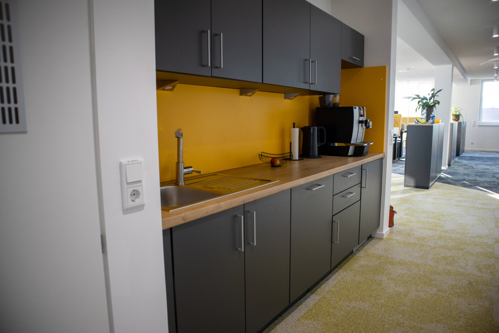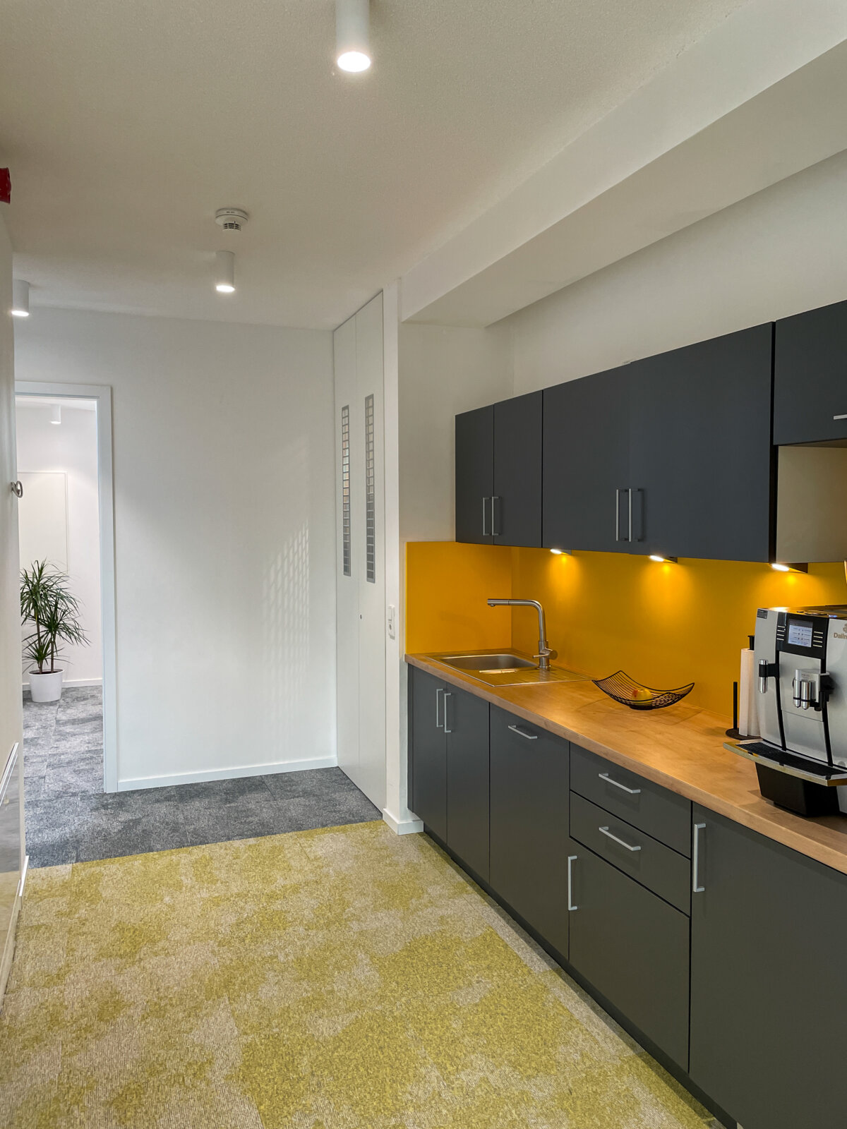 Durch innenarchitektonische Gestaltungsexpertise wurde dieser Riegel in weitere Nutzungsbereiche unterteilt, um die Möglichkeit einer alternativen Nutzung zu gewährleisten. So beinhaltet der Küchenbereich nicht nur eine Getränkestation, einen erhöhten Tresen, der als Kommunikationszone dient, sondern ebenso einen Bereich mit Möglichkeit zum Essen, Austausch und Arbeiten.