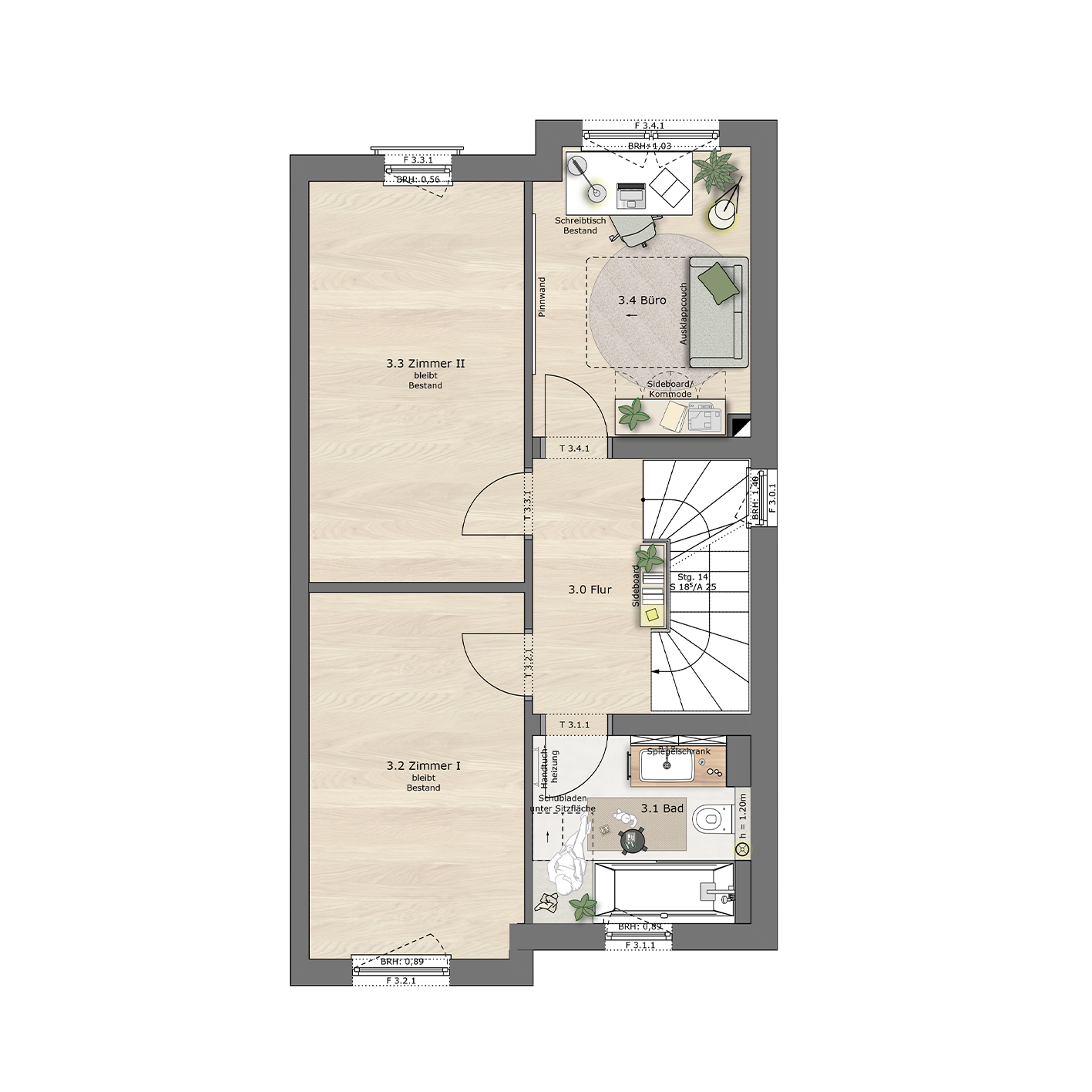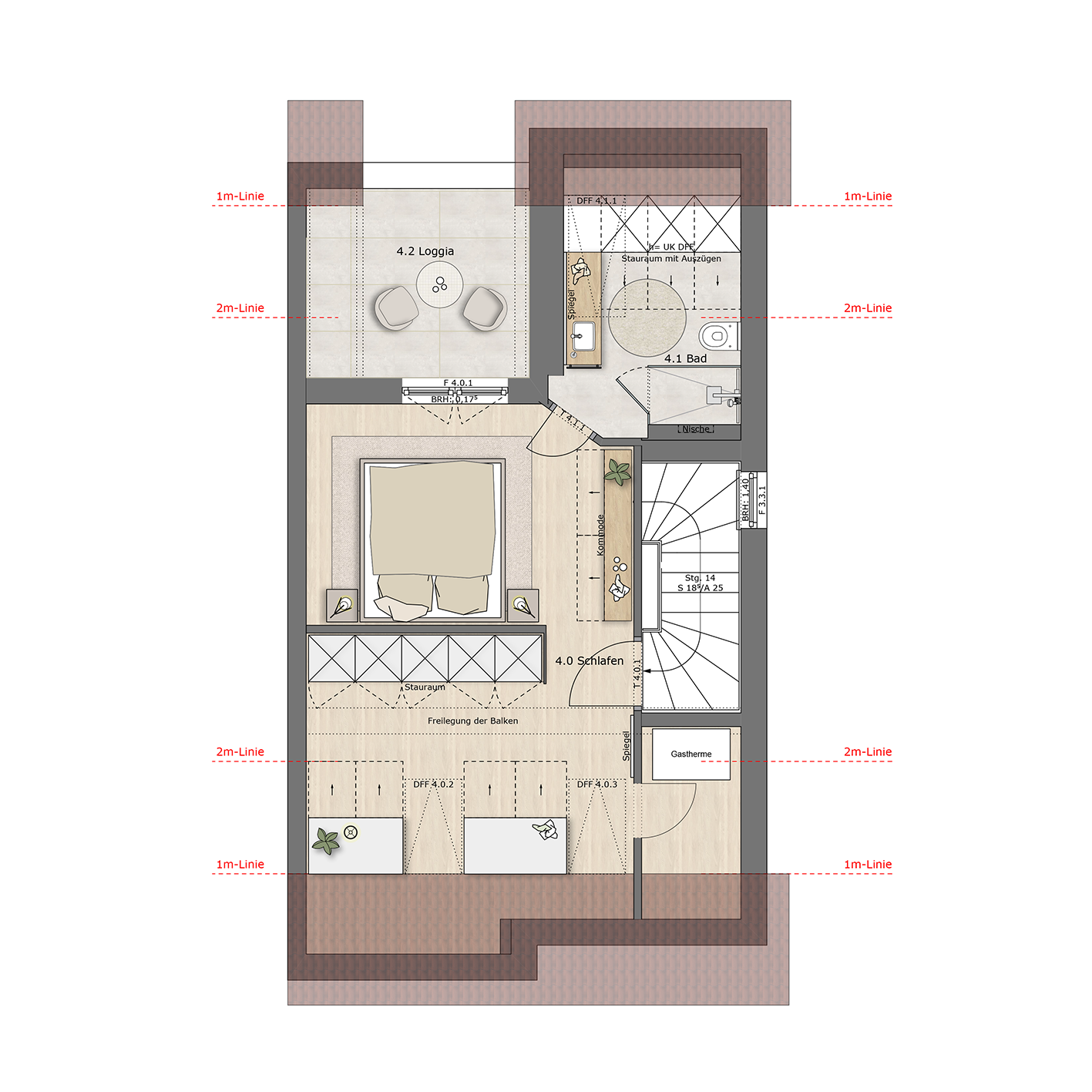 Im Obergeschoss wurde im Badezimmer in diesem Konzept auf die Dusche verzichtet. Stattdessen entstand in einer Nische eine Sitzfläche mit integrierten Schubladen, die zusätzlichen Stauraum bietet und gleichzeitig als gemütliche Ablage dient. Im Dachgeschoss wurde der große Raum durch eine Trockenbauwand geteilt, sodass eine separate Ankleide neben dem Schlafzimmer entstand. Die neu geschaffene Wand wurde als Stellfläche für den Kleiderschrank genutzt. Unter den Dachflächenfenstern in der Schräge sind maßgefertigte Einbauschränke vorgesehen. Auf der Rückseite der neuen Wand ist das Bett geplant, das nun mit Blick in Richtung Loggia und Garten ausgerichtet ist.
