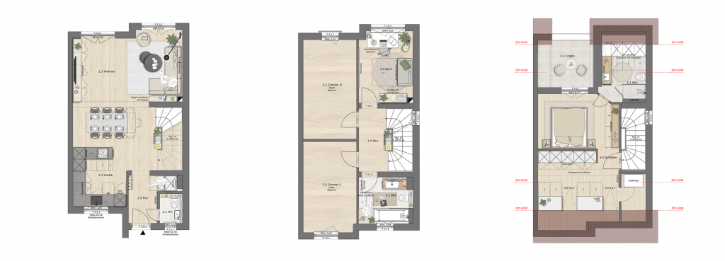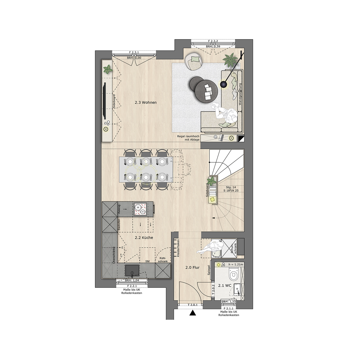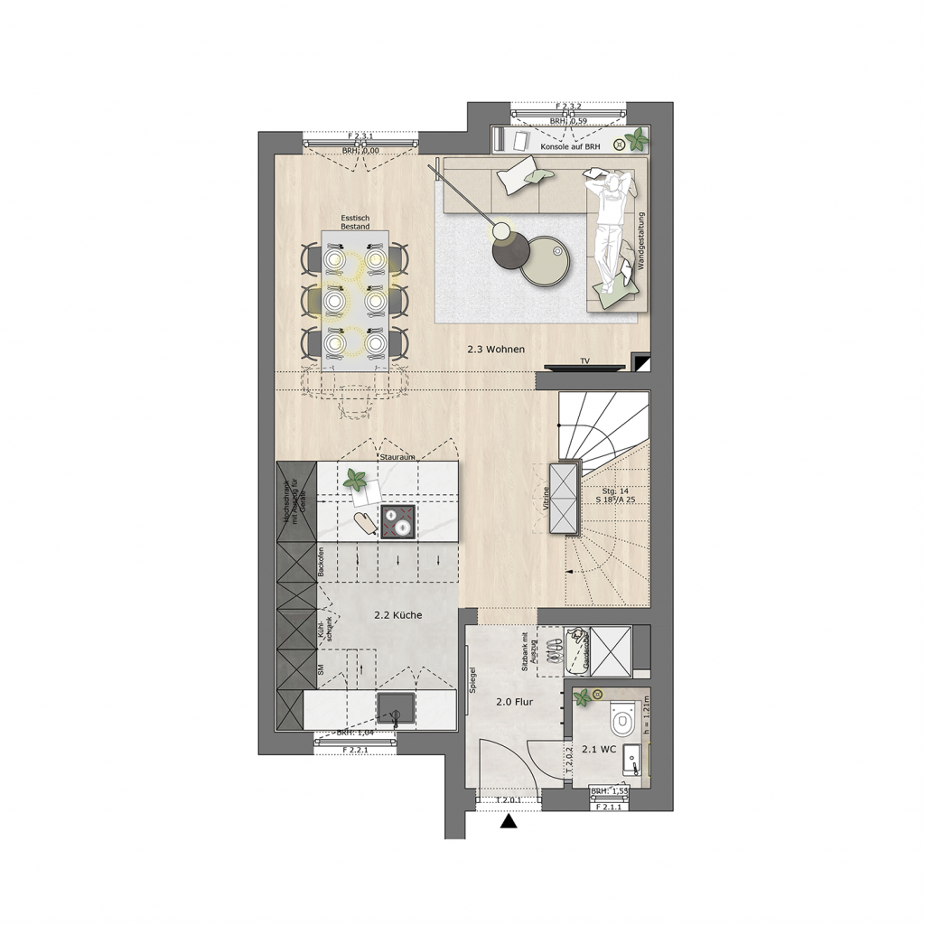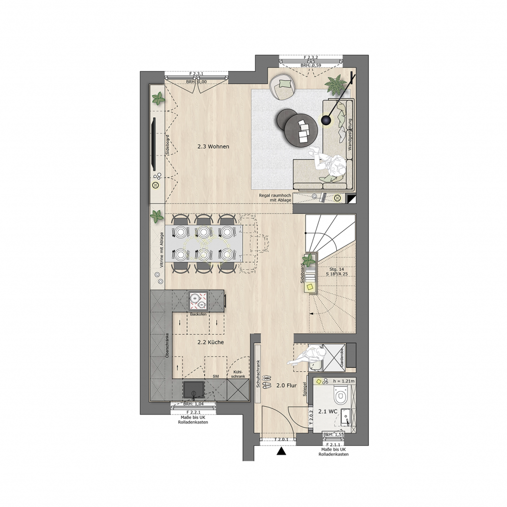 Im Finalkonzept entschieden sich die Bauherren größtenteils für die Ausgestaltung von Konzept 2. Die einzige Ausnahme bildete der Verzicht auf den Einbauschrank im Erdgeschoss, der Ess- und Wohnbereich optisch miteinander verbunden hätte.