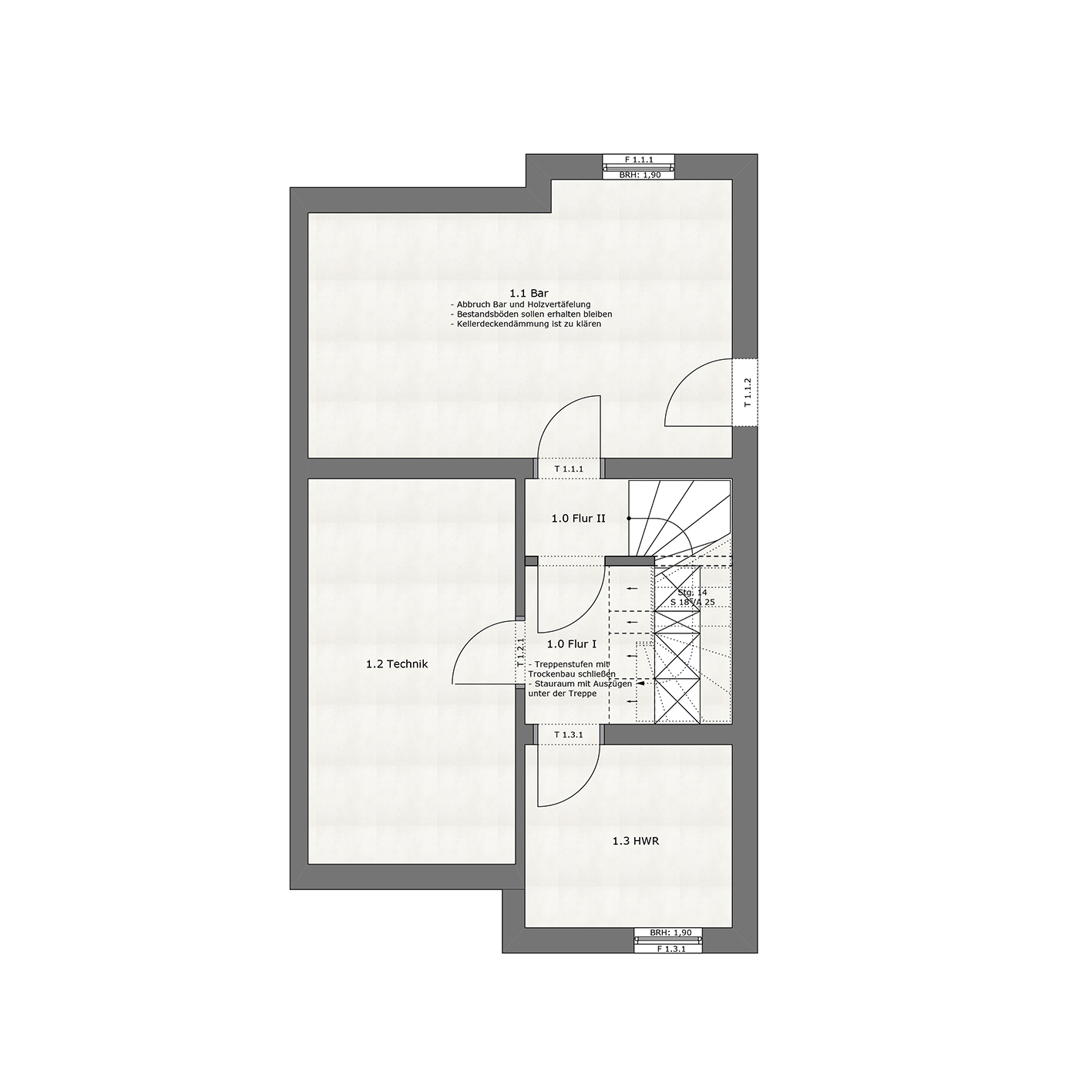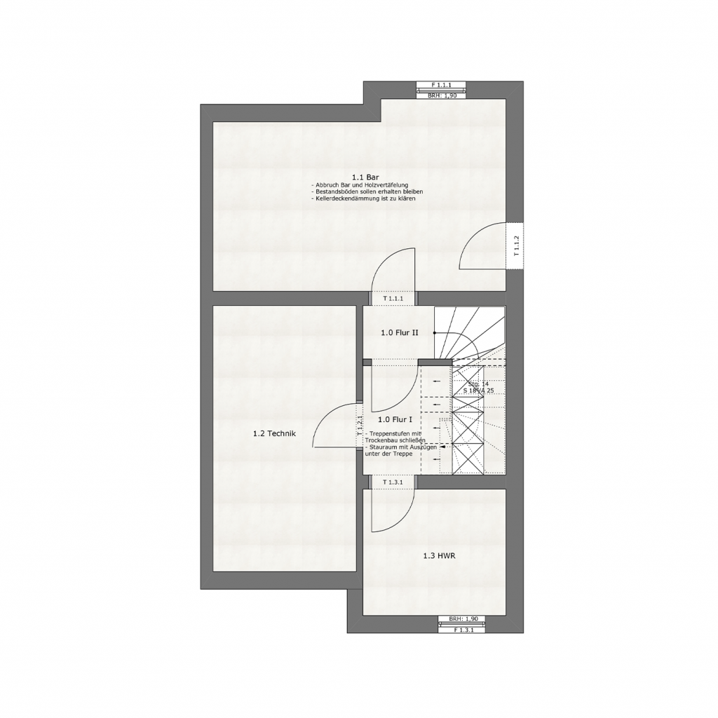Konzept 1 sah vor, im Kellergeschoss eine zusätzliche Trockenbauwand einzuziehen und auch den Treppenaufgang mit Trockenbau zu schließen. So sollte verhindert werden, dass die kalte Kellerluft in den Wohnraum strömt. Der Platz unter der Treppe wurde optimal genutzt: Hier entstand ein maßangefertigter Einbauschrank, der Stauraum für Putzutensilien bietet oder alternativ auch als Erweiterung der Garderobe genutzt werden kann.