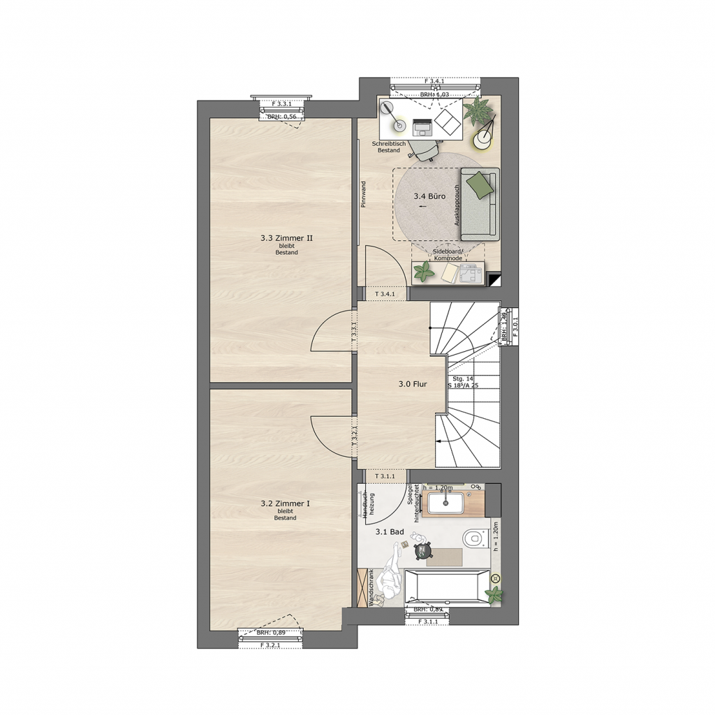 Über das offene Treppenhaus gelangt man in das Obergeschoss, von dort aus wird das Badezimmer, zwei Kinderzimmer sowie ein Büro erschlossen. Das Badezimmer wurde so geplant, dass es neben einer Badewanne auch eine Dusche sowie einen großzügigen Waschtisch mit Spiegelschrank beinhaltet. Das Büro bietet ausreichend Platz für einen Schreibtisch, zusätzlichen Stauraum und eine ausziehbare Couch, sodass hier bei Bedarf Gäste untergebracht werden können.