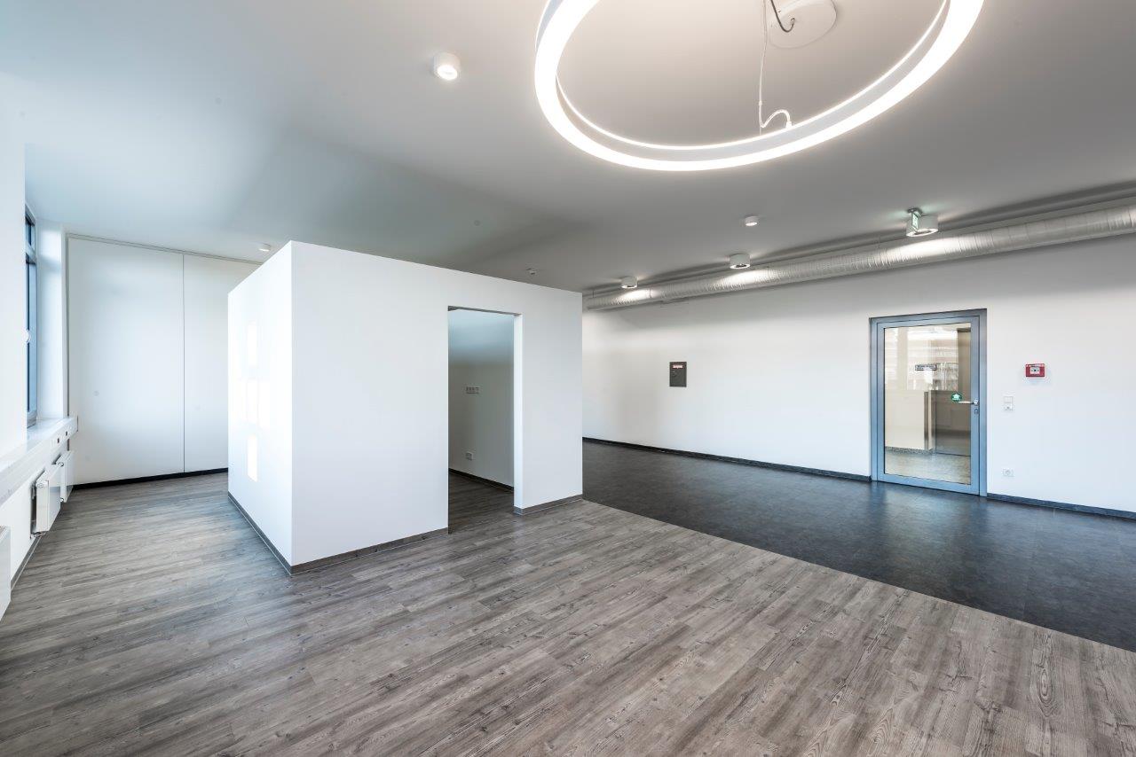 Um eine angepasste, angenehme Arbeitsatmosphäre in dem Gebäude zu erzeugen, entwickelte das Team von Innenarchitekten und Architekten von raum in form – Innenarchitektur & Architektur ein individuelles Beleuchtungskonzept. Hierbei wurde vor allem darauf geachtet, dass die Arbeitsplätze gut ausgeleuchtet sind, ohne jedoch den Mitarbeiter zu blenden. Aus diesem Grund wurden alle Leuchten direkt über dem Arbeitsplatz dimmbar gewählt, während die Grundbeleuchtung in Form von Spots eine angenehme Lichtatmosphäre schafft. Für die Beleuchtung in den Konferenzräumen und über den Gruppenarbeitstischen würde eine Ringleuchte mit rundem Schallschutzelement gewählt, welche farbliche Akzente in der Firmenfarbe setzt und gleichzeitig ein Highlight in der modernen Ausstattung.
