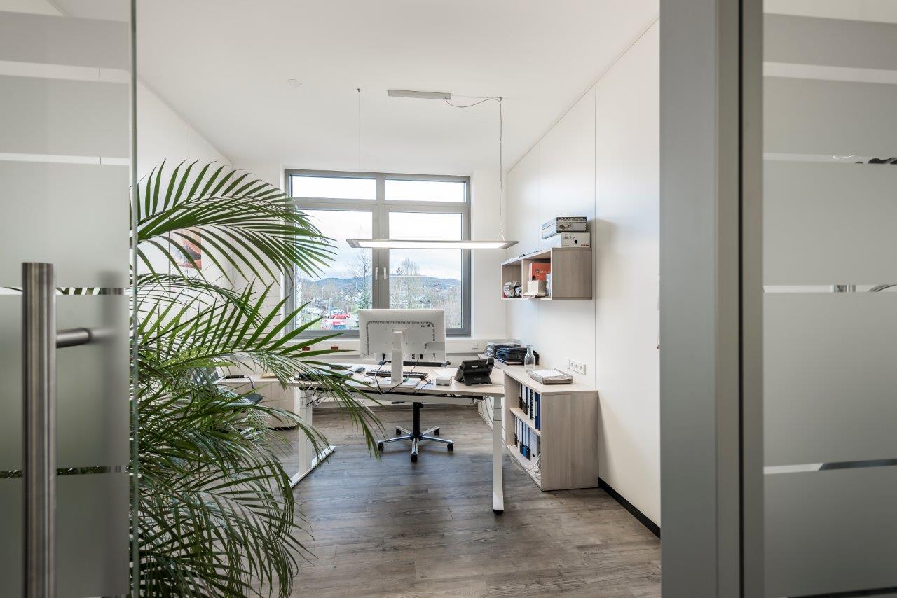 Einen wichtigen Schritt für das Team von raum in form – Innenarchitektur & Architektur stellte die Entwicklung und Gestaltung der individuellen Büro-Trennwände mit raumhohen Glasschiebetüren dar, welche sowohl in Gestalt wie auch Materialität an die Wünsche des Unternehmens angepasst und auf Maß gefertigt und eingebaut wurden. Hierbei wurde in enger Zusammenarbeit der verschiedenen ausführenden Firmen darauf geachtet, dass die Elektroinstallationen möglichst dezent in den Trennwänden verschwinden und den Blick auf die moderne und praktische Büroausstattung lenken.