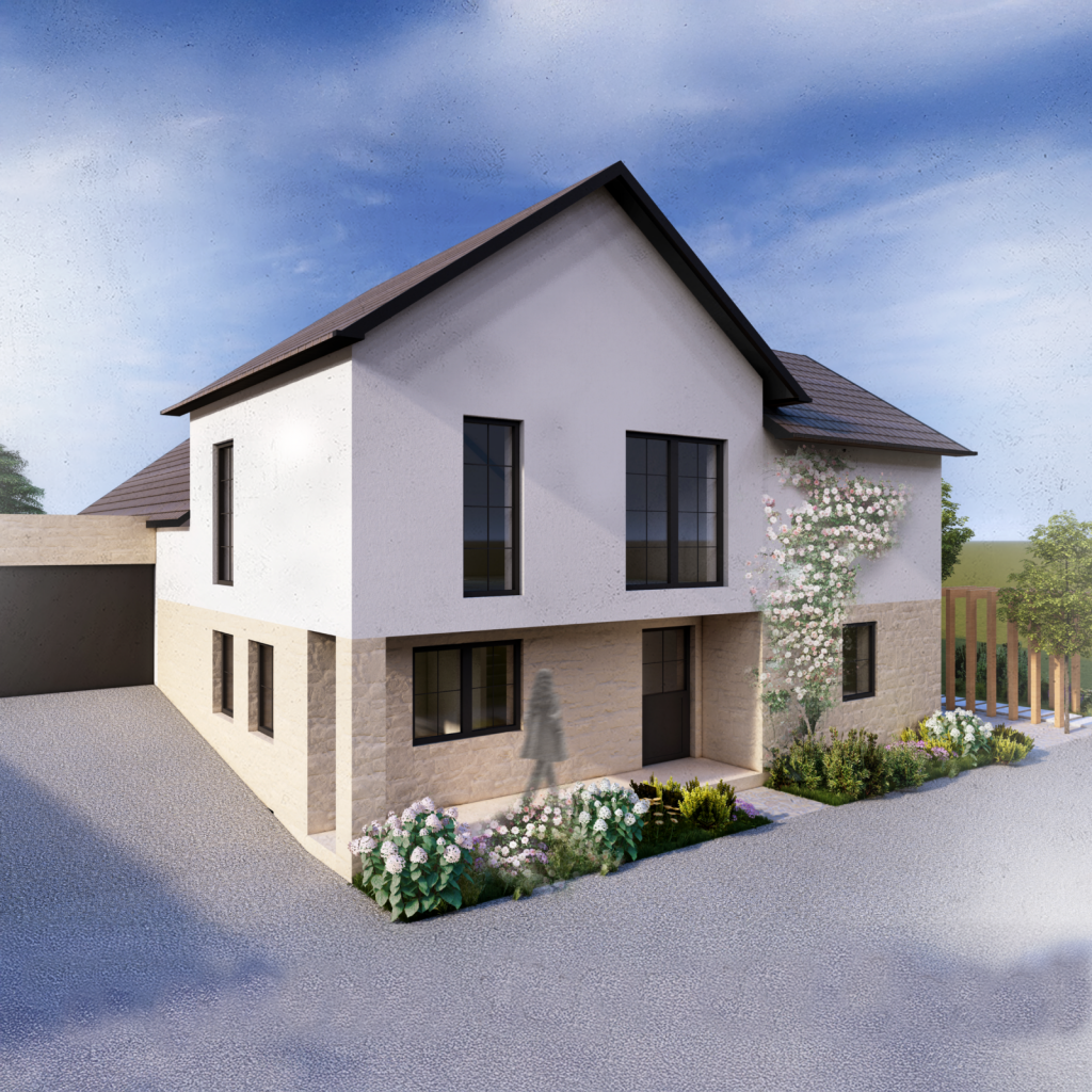 Im Mittelpunkt der Planung steht der Neubau selbst, der sich durch seine U-förmige Gebäudeform und das klassische Satteldach harmonisch in die Hanglage des Grundstücks einfügt. Die durchdachte Anordnung der Baukörper schafft einen geschützten Innenhof mit großzügiger Terrasse, die zwischen den beiden Fassaden eingebettet liegt und so einen intimen Rückzugsort im Außenraum bildet. Unterstützt wird die Atmosphäre von einer romantisch-organisch gestalteten Gartenanlage, die das Gesamtbild der Anlage zu einem stimmigen Wohlfühlort abrundet.