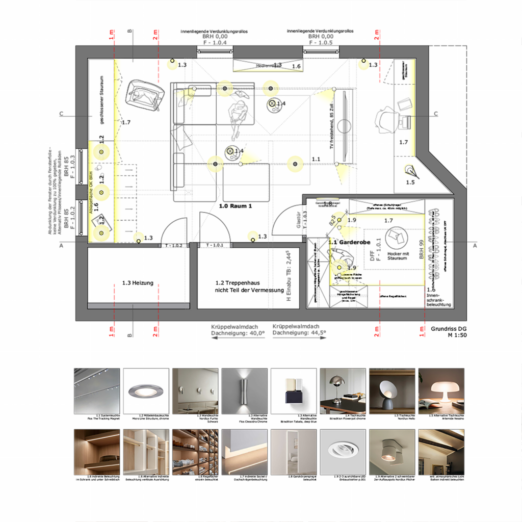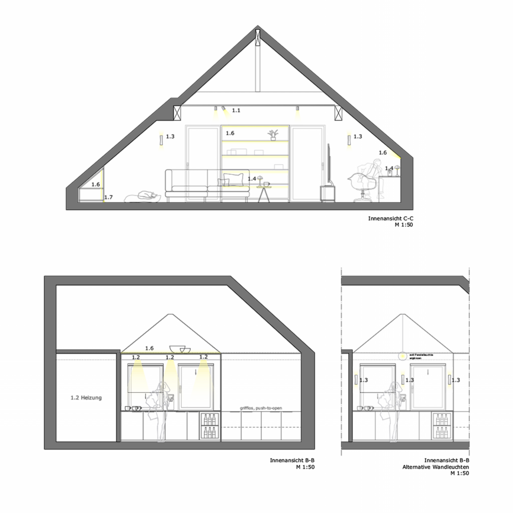 Das Ergebnis ist ein vielschichtiges und sorgfältig abgestimmtes Beleuchtungskonzept, das sowohl funktionalen Anforderungen als auch ästhetischen Ansprüchen gerecht wird. Es unterstützt gezielt die Raumgliederung, hebt architektonische Besonderheiten hervor und schafft je nach Nutzungssituation die gewünschte Lichtstimmung. Die eingesetzten Leuchten und Lichtsysteme sind präzise auf die Innenarchitektur abgestimmt und tragen entscheidend zur Qualität und Atmosphäre des gesamten Dachgeschosses bei.