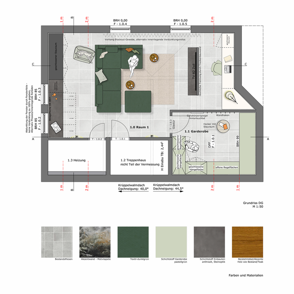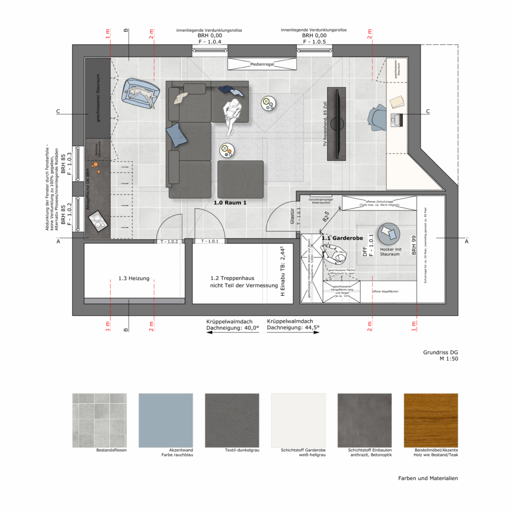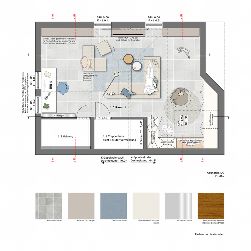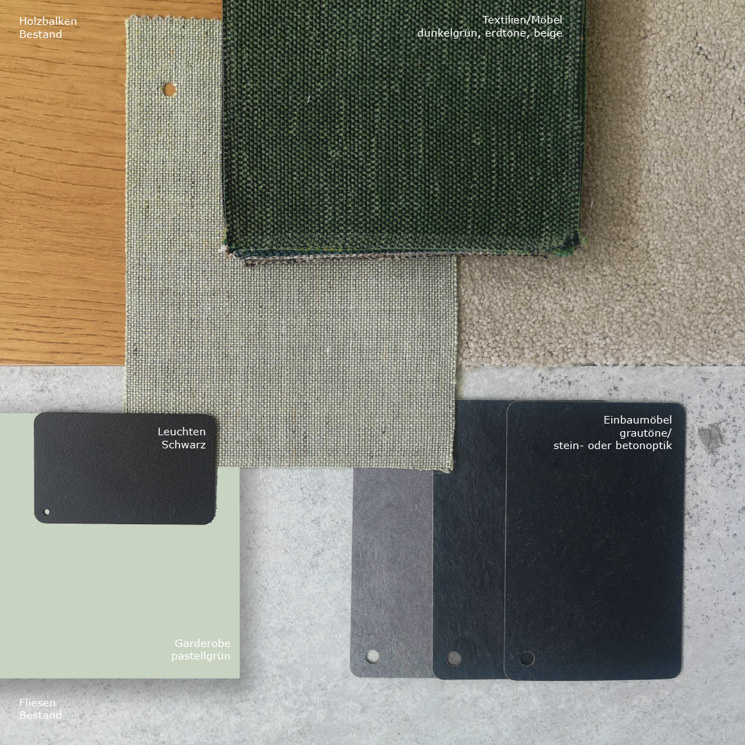 Die Grundstruktur orientiert sich überwiegend an Konzept 1, wurde jedoch in mehreren Punkten weiterentwickelt. Statt des ursprünglich geplanten Dunkelgrüns entschieden sich die Bauherren für ein kräftiges Anthrazit, das sich dezent und zeitlos in den Bestand einfügt. Als Akzentfarbe wurde ein rauchblauer Ton gewählt, der sich in ausgewählten Textilien und Möbelstücken wiederfindet und dem Raum eine ruhige, moderne Tiefe verleiht. Durch die bewusst neutral gehaltenen Hauptbestandteile – insbesondere die maßgefertigten Einbauten und die modulare Couch – lässt sich der Akzentton bei Bedarf problemlos anpassen. Auch andere Farbakzente können jederzeit integriert werden, ohne das gestalterische Gleichgewicht zu stören. So bleibt das Raumkonzept langfristig wandelbar und offen für individuelle Entwicklungen.