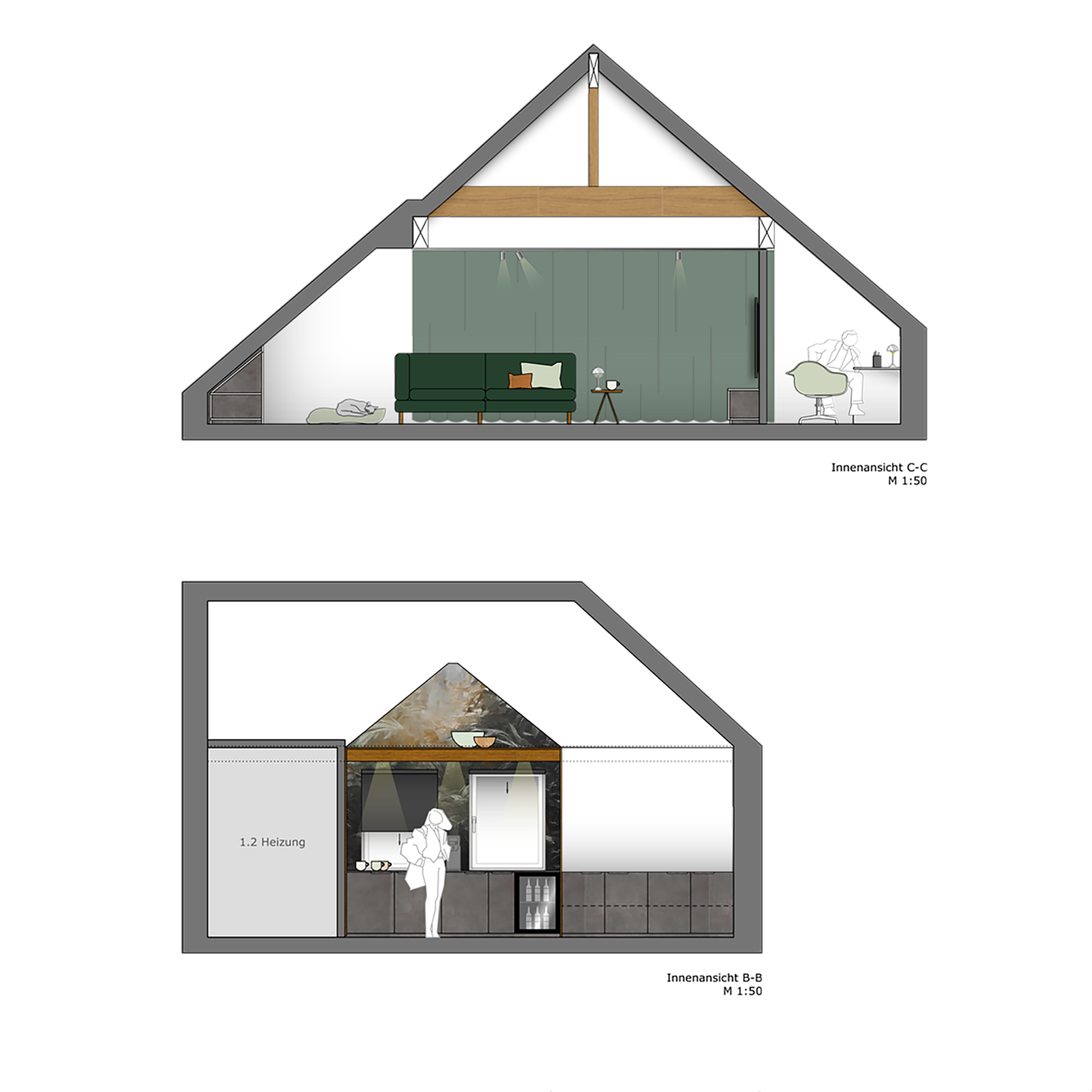 In Konzept 2 stand die Offenheit des Dachgeschosses im Fokus. Der gesamte Raum wurde als durchgehende Einheit geplant – ohne trennende Wände, mit fließenden Übergängen zwischen den einzelnen Nutzungsbereichen.