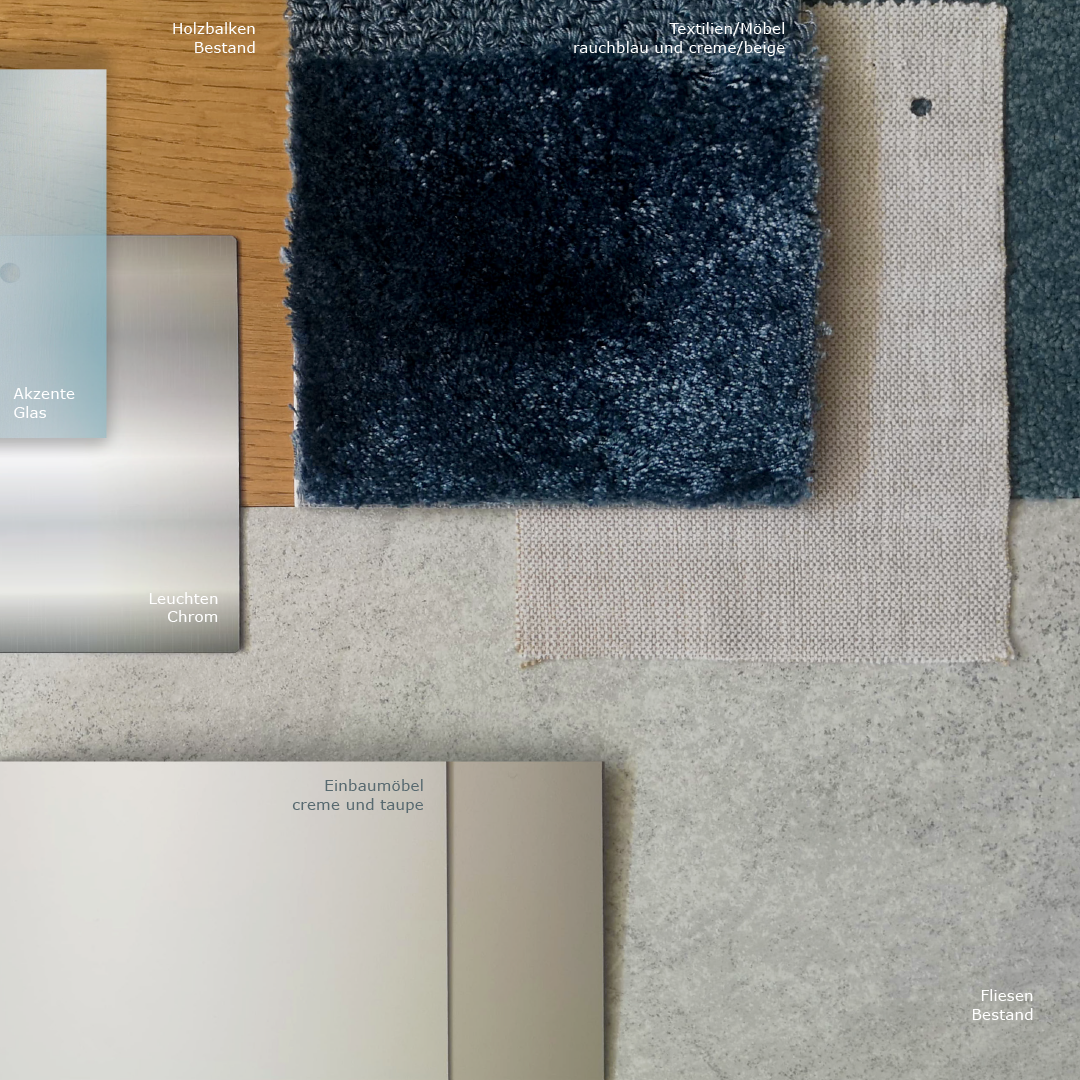 Im Zentrum des Raumes bildet eine modulare Couch in einem warmen Sandton den wohnlichen Mittelpunkt. Der Farbton harmoniert mit dem grau nuancierten Bestandsfliesenboden sowie den zurückhaltenden Creme- und Taupefarben der Einbauten. Rauchblaue Textilien sorgen für subtile Akzente, während die Teakholzbalken als architektonisches Element den Raum strukturieren und Wärme verleihen.