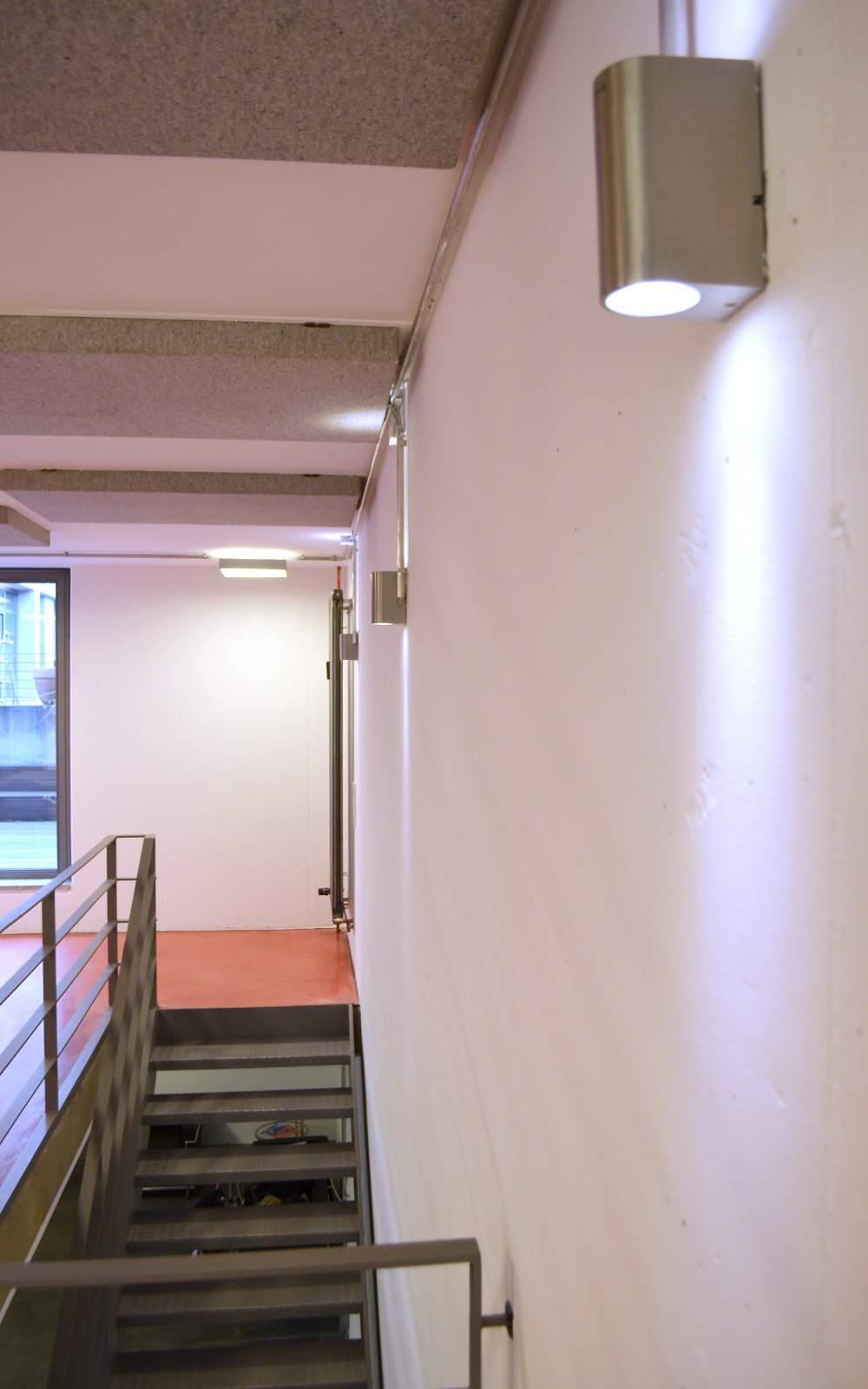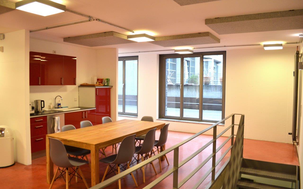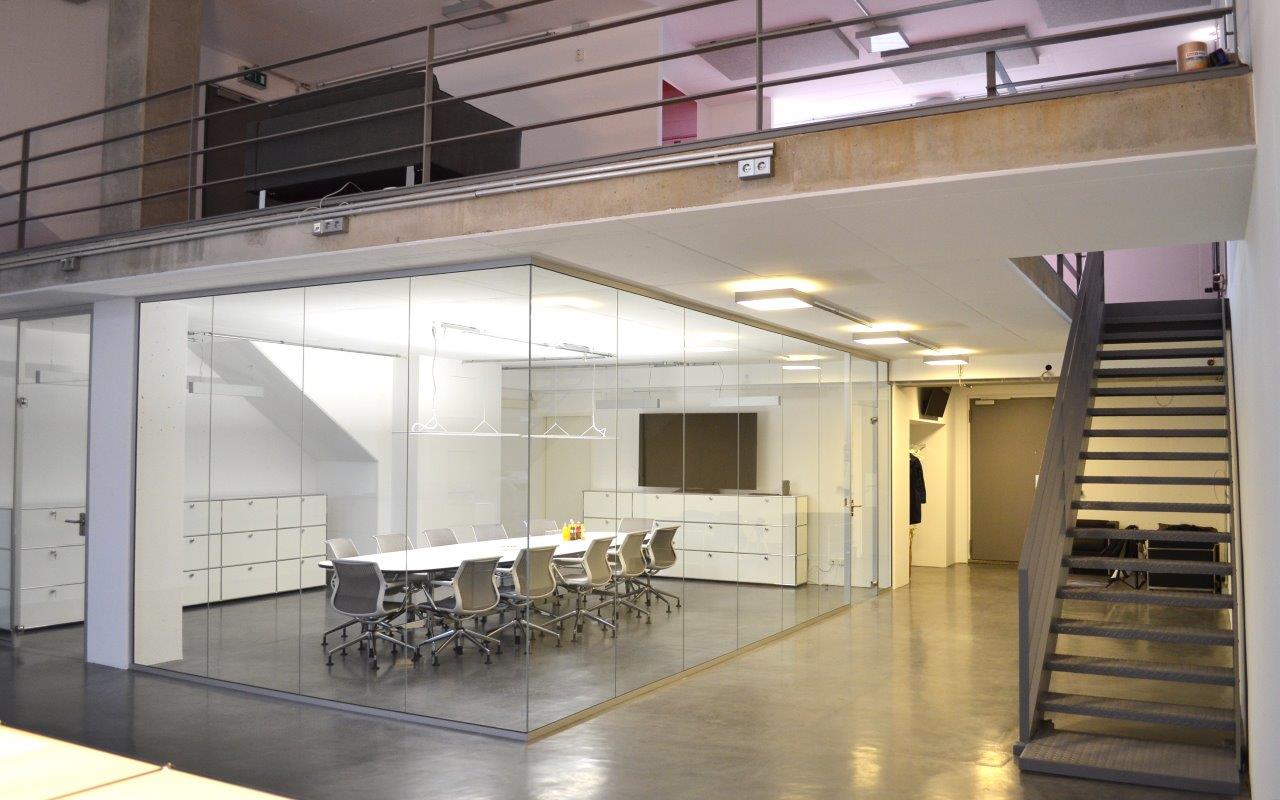 Der Zugang zum Konferenzraum kann sowohl vom Eingangsbereich als auch von den Arbeitsplätzen aus erfolgen, um den Mitarbeitern den Zugang zu vereinfachen. Die Trennwände bestehen komplett aus Glas, die somit ein angenehmes lichtdurchflutetes Arbeitsklima schaffen. raum in form konzipierte die Möblierung und Beleuchtung so, dass die Arbeitsplätze jederzeit um bis zu sechs weitere Plätze erweiterbar sind. Im 1. OG war der Wunsch des Bauherrn, einen angenehmen Mitarbeiterbereich zu schaffen, indem gemeinsam gekocht, gegessen und relaxt werden kann. Der Sanitärbereich wurde zeitgemäß modernisiert, ein moderner Betonwaschtisch mit Unterschrank, der viel Stauraum bietet, ist hierbei der Blickfang.