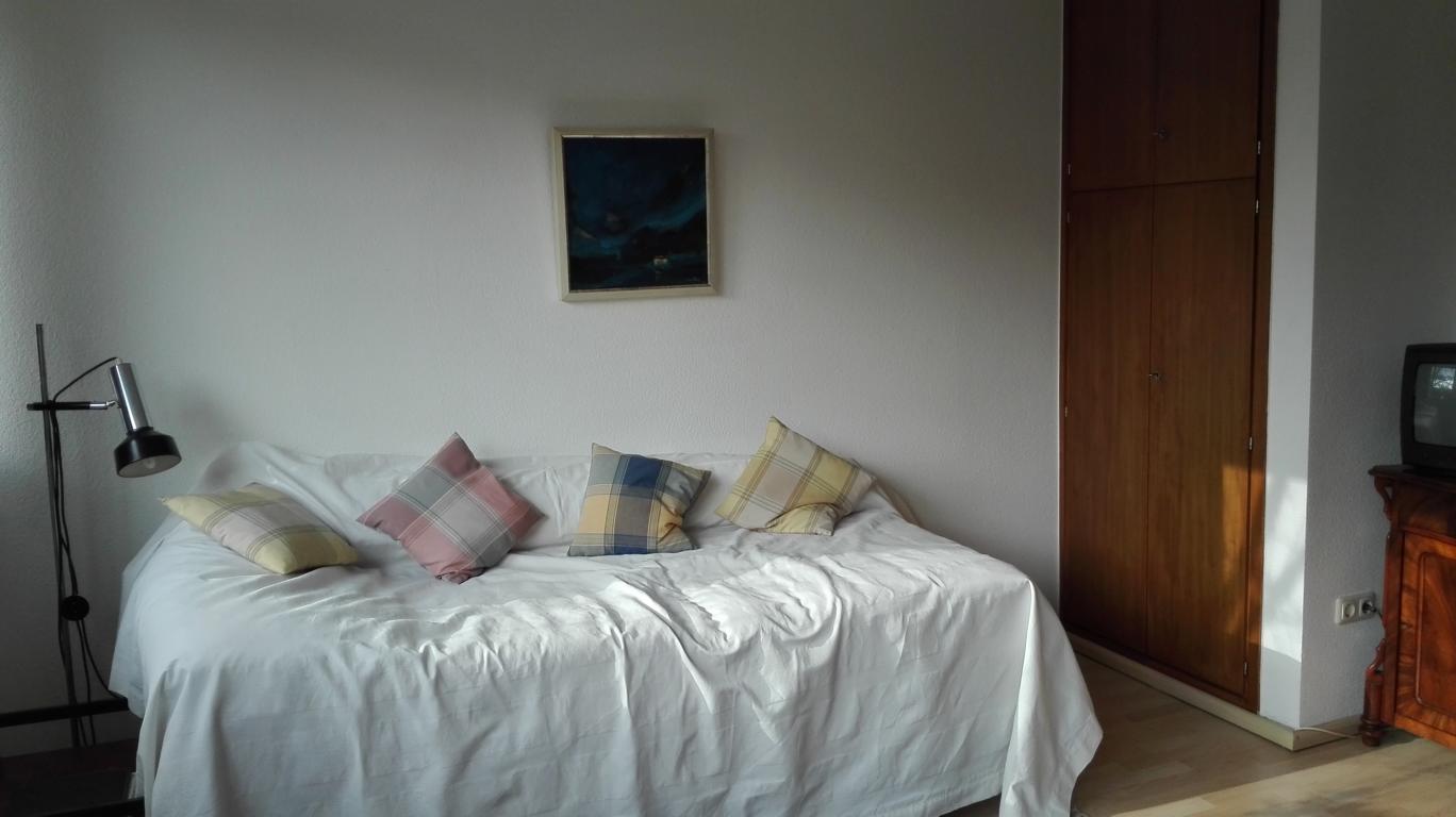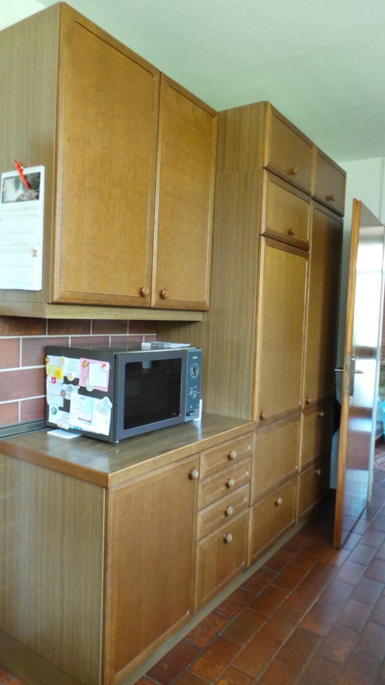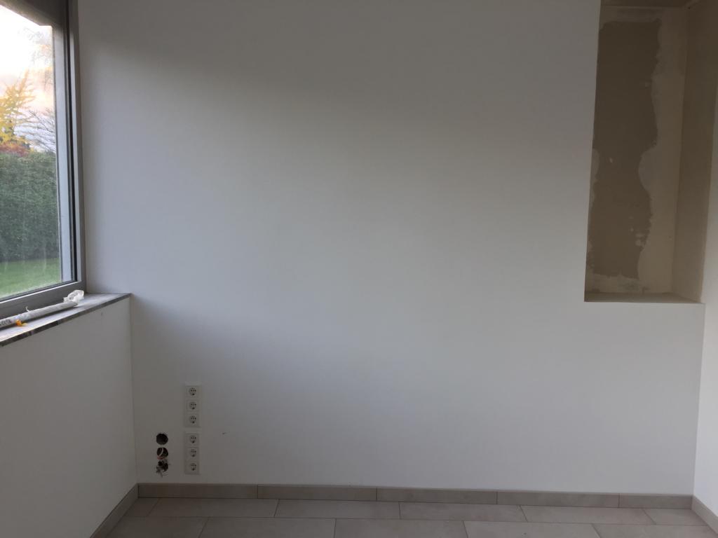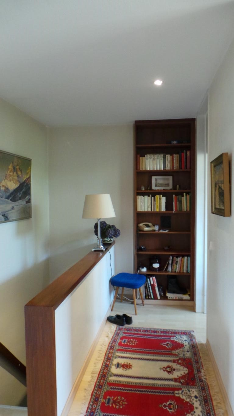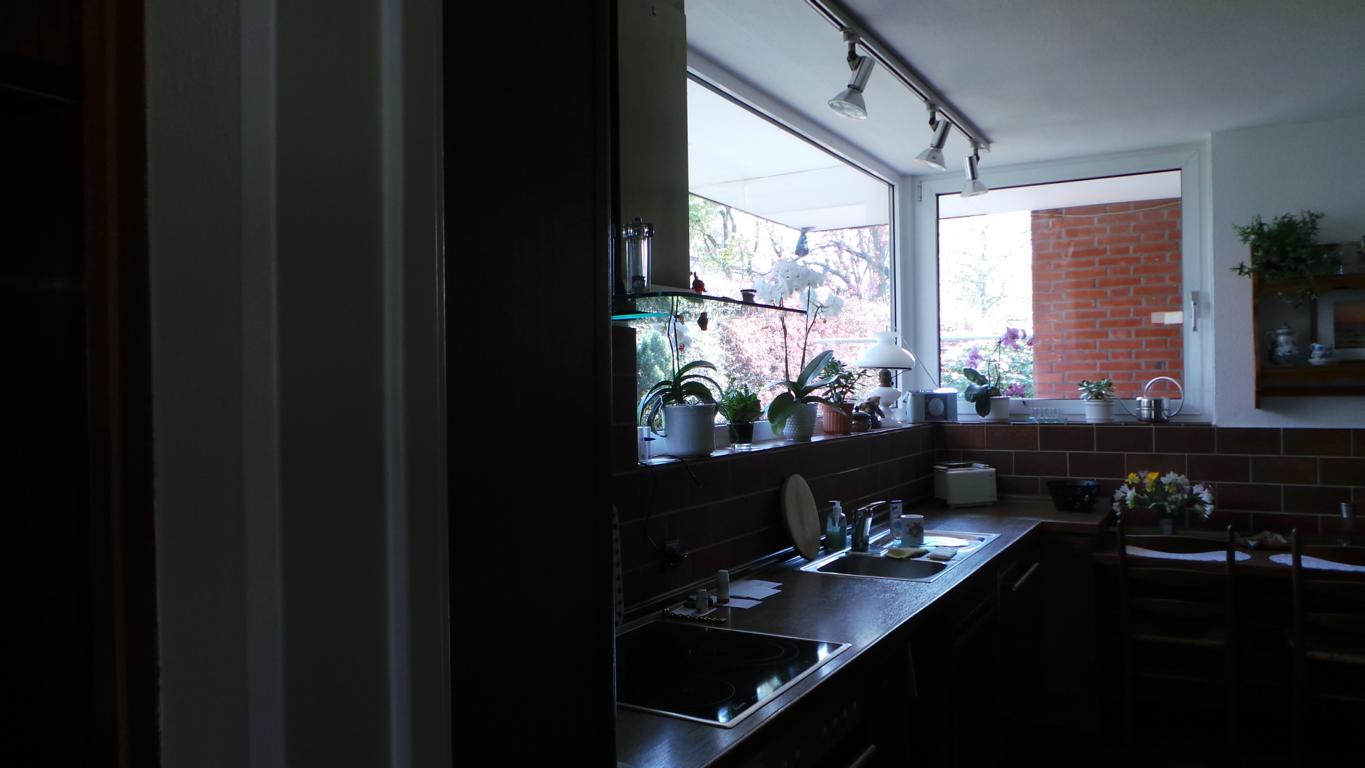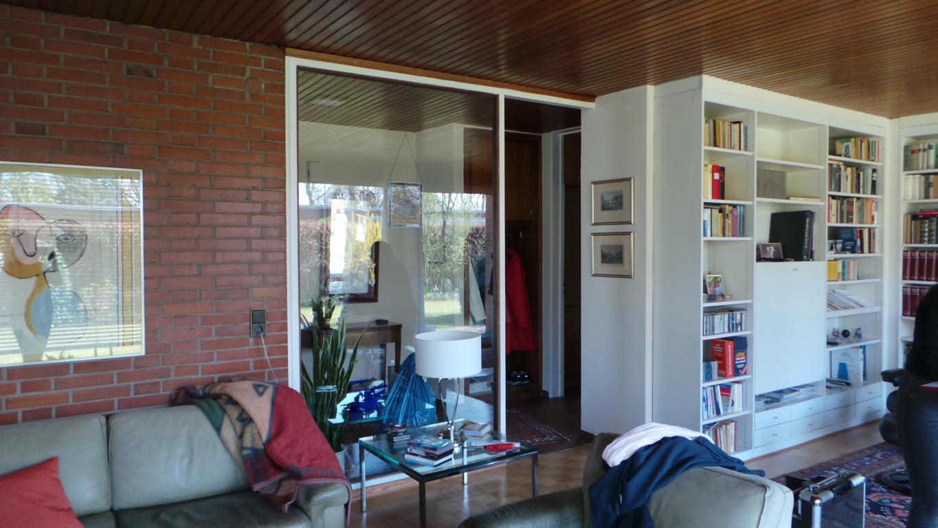 Der Essbereich wurde mit einer Trennwand, welches als Regal ausgebildet wurde, geschlossen. Dahinter befindet sich nun das Gäste-/Arbeitszimmer, welches über den Flur erschlossen wird. Da keine natürliche Belüftung möglich war, ist eine Lüftung in Richtung Terrasse eingebaut worden.